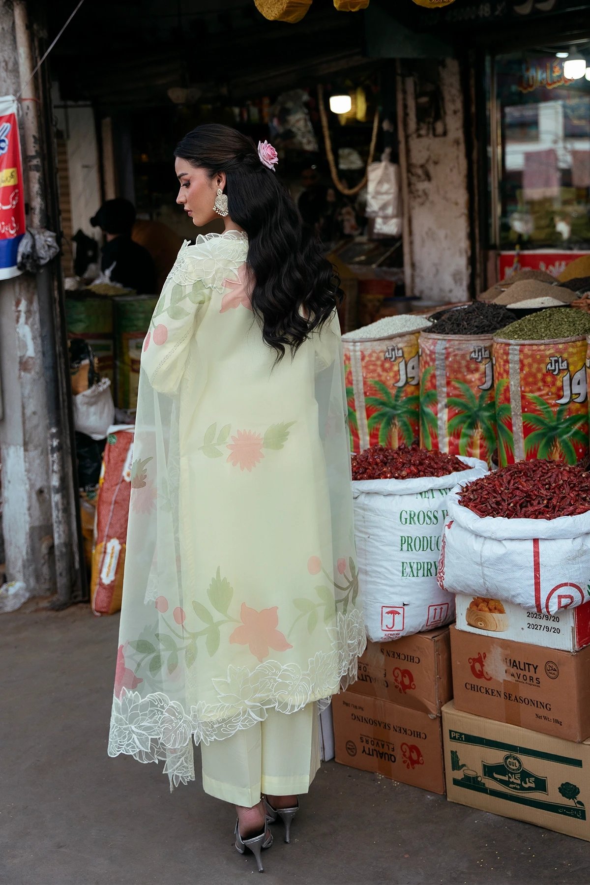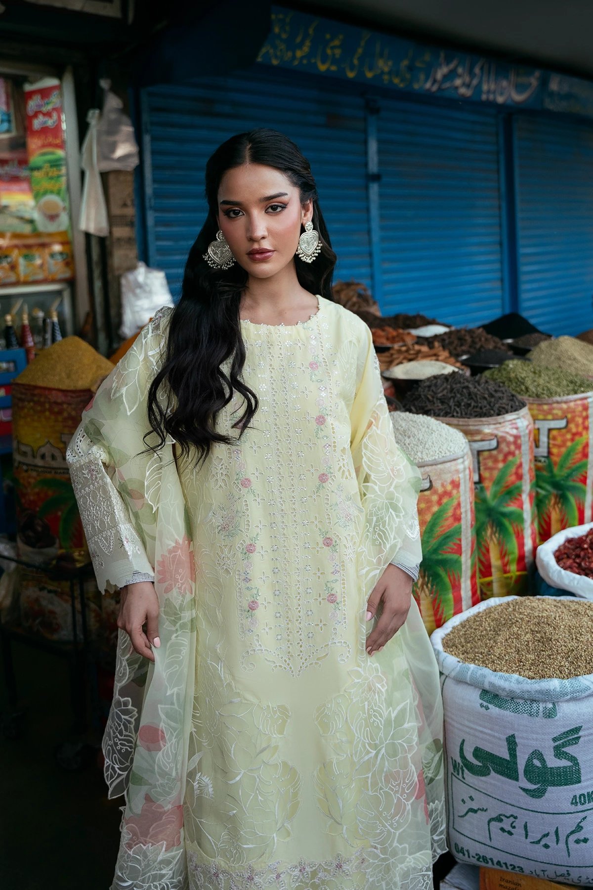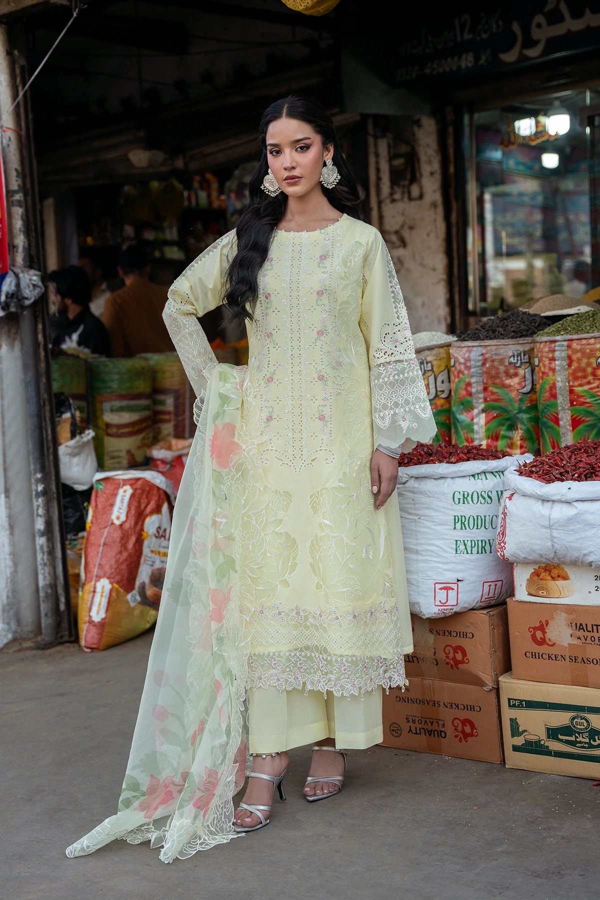 Bazaar Kahani 2026 Eid edit collection features a straight shirt with luxury thread work embroidery throughout with lace embellished border. It comes with full length embroidered sleeves with organza applique cuffs. Paired with straight leg lawn trousers and the look is finished with a digital printed organza dupatta. Perfect mother and daughter collection for this Eid.