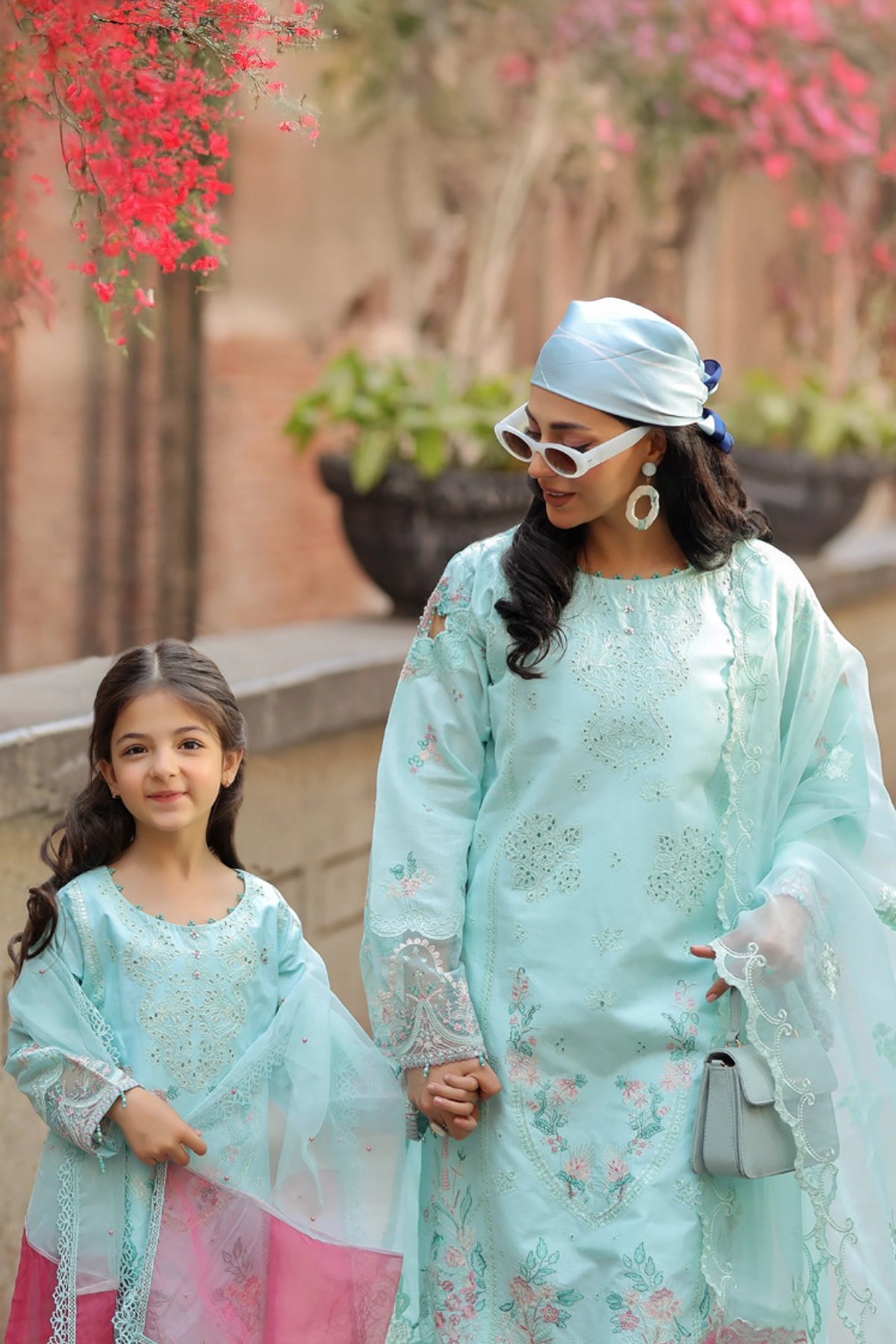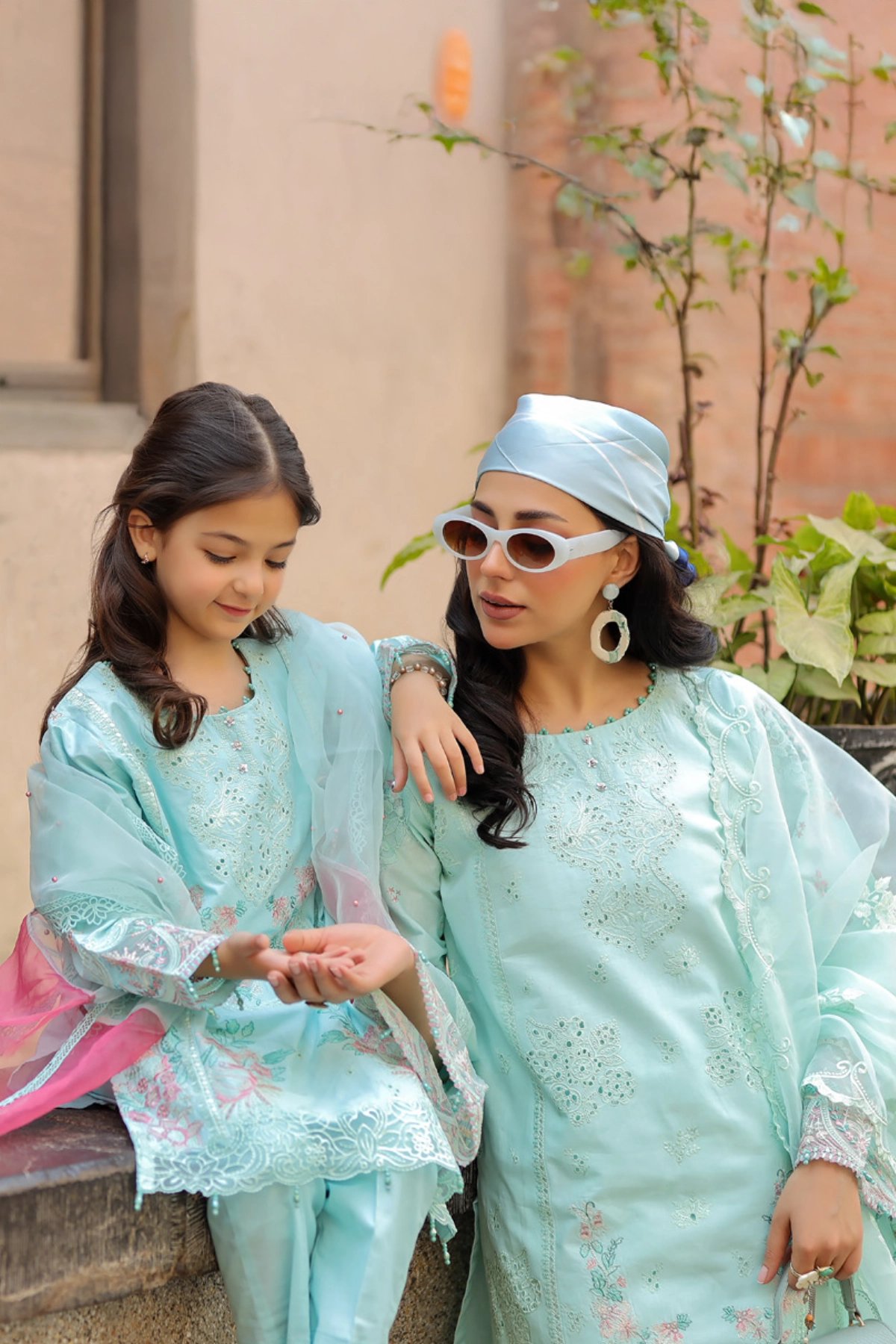 This beautiful Bazar Kahani Eid kids suit features a chikankari kameez with intricate embroidery, an embellished neckline, and crystal tassels for an elegant touch. It is paired with chikankari trousers, adding to its sophisticated appeal. The ensemble is completed with a two-toned organza dupatta adorned with beautiful lace detailing, making it a perfect choice for Eid or any festive occasion. Please note colour may vary slightly from the images shown due to professional lighting, and the design can slightly vary too.