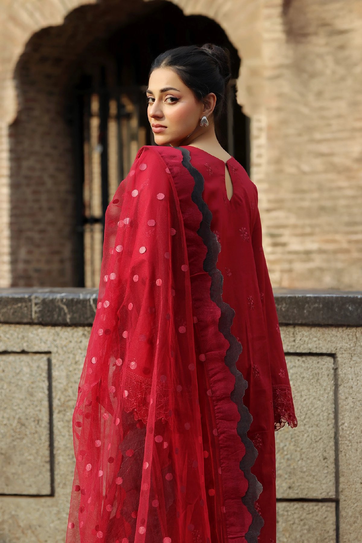 This beautiful Bazar Kahani Eid suit features a chikankari shirt with intricate embroidery and crystal tassels. It is paired with chikankari embroidered trousers featuring scalloped detailing for a graceful finish. The look is completed with a net dupatta, adorned with a beautiful screen print and scalloped borders. Perfect for Eid or special occasions. Please note colour may vary slightly from the images shown due to professional lighting, and the design can slightly vary too.