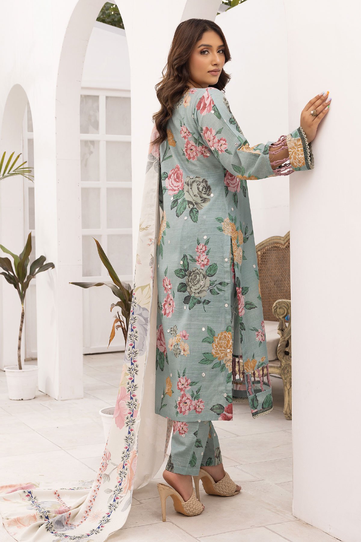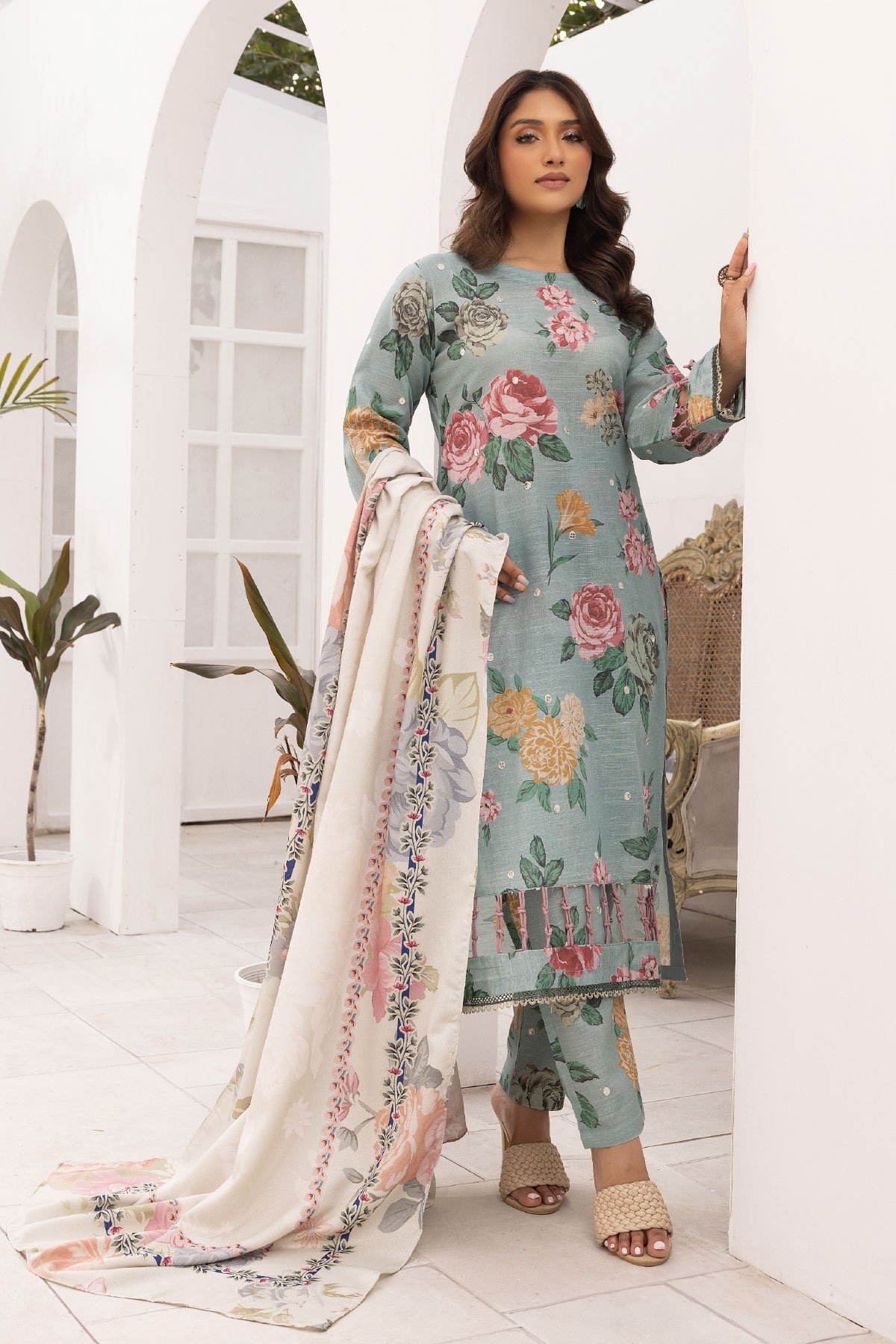 This beautiful bliss khaddar collection features a straight printed shirt with piping styling on the border, finished with full length printed sleeves. Paired with straight leg printed trousers and the look is finished with a digital printed wool shawl. Perfect collection for this winter.