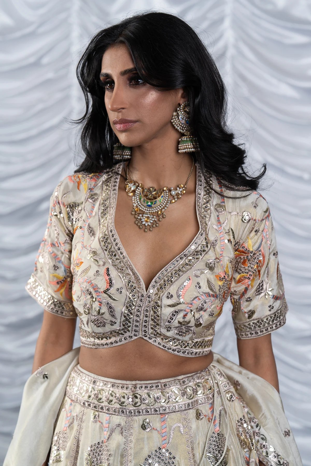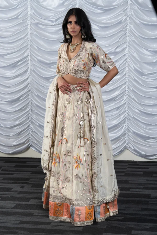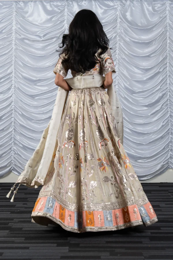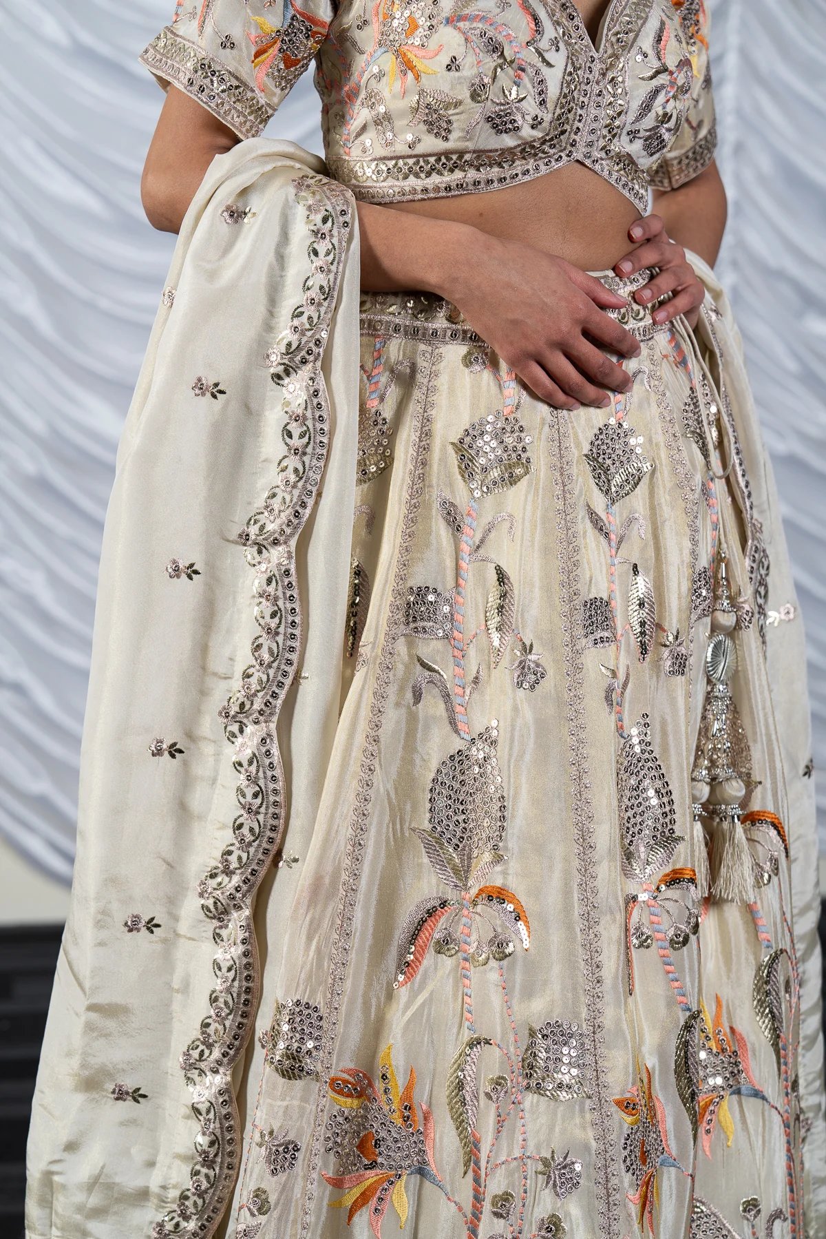 This beautiful raw silk lehenga choli is a perfect blend of tradition and elegance. The intricately designed choli is embellished with delicate threadwork and sequins, complemented by a flared lehenga featuring exquisite embroidery. The matching raw silk dupatta, adorned with subtle thread accents and finished with elegant tassels, completes the ensemble. Perfect for weddings or festive celebrations, this outfit is effortlessly stylish and graceful.