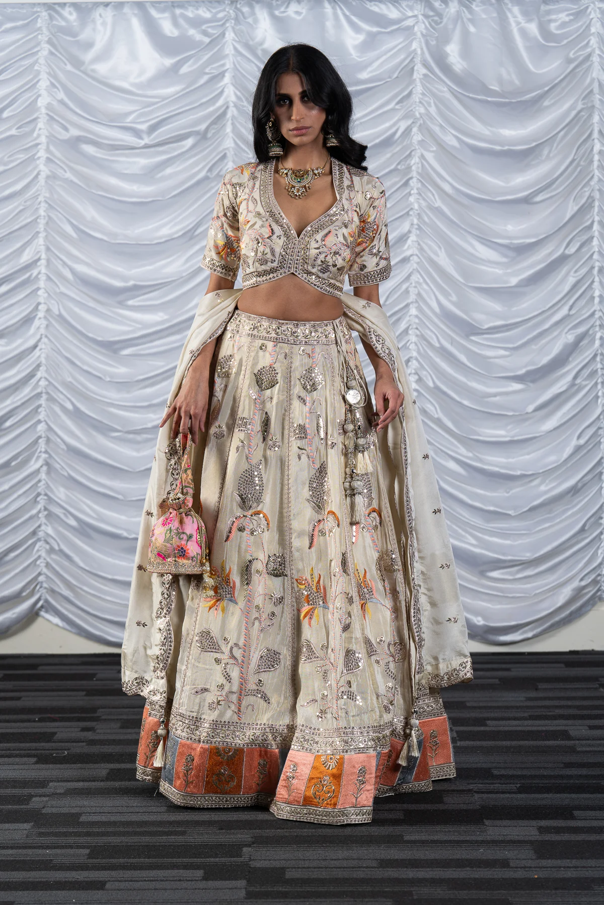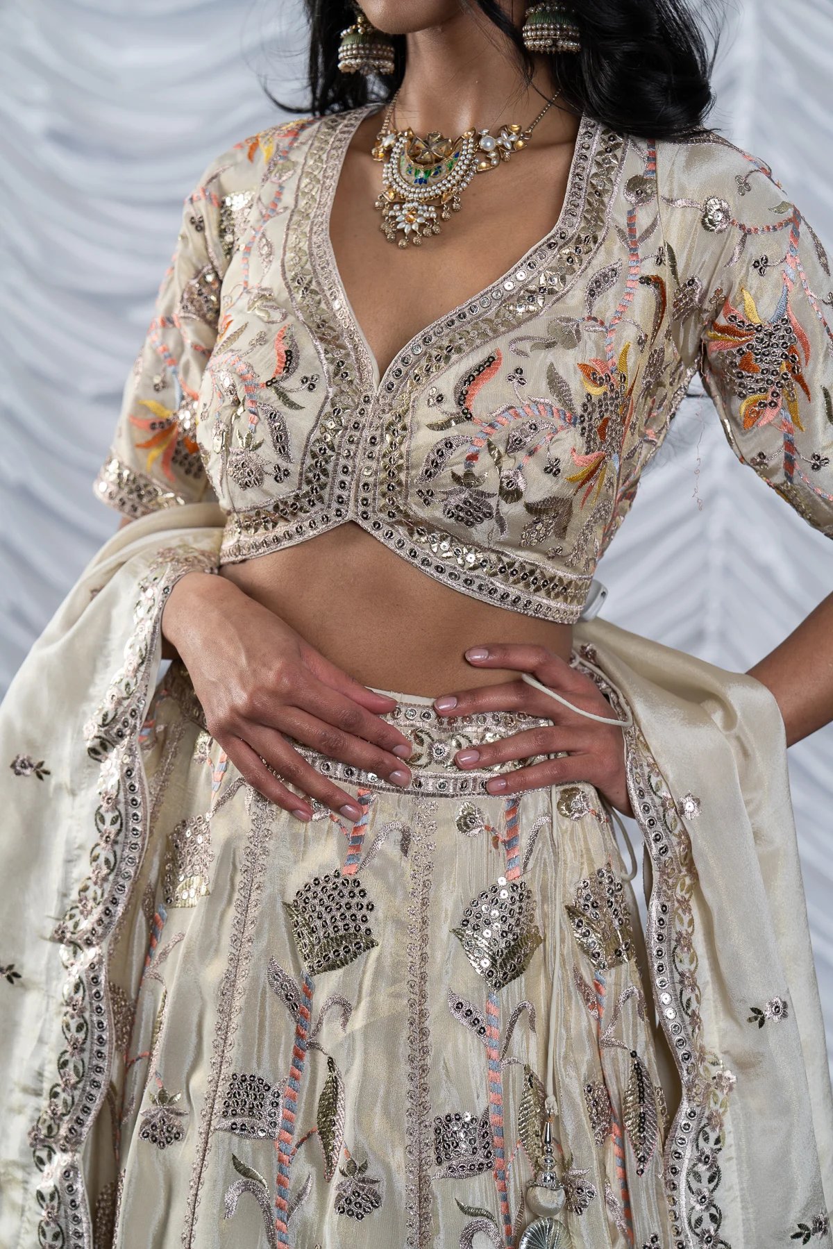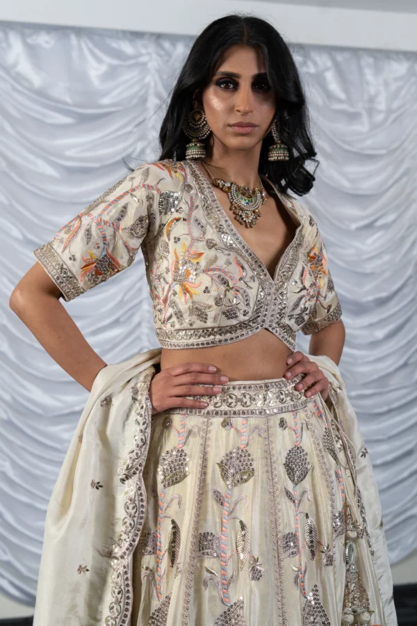 This beautiful raw silk lehenga choli is a perfect blend of tradition and elegance. The intricately designed choli is embellished with delicate threadwork and sequins, complemented by a flared lehenga featuring exquisite embroidery. The matching raw silk dupatta, adorned with subtle thread accents and finished with elegant tassels, completes the ensemble. Perfect for weddings or festive celebrations, this outfit is effortlessly stylish and graceful.