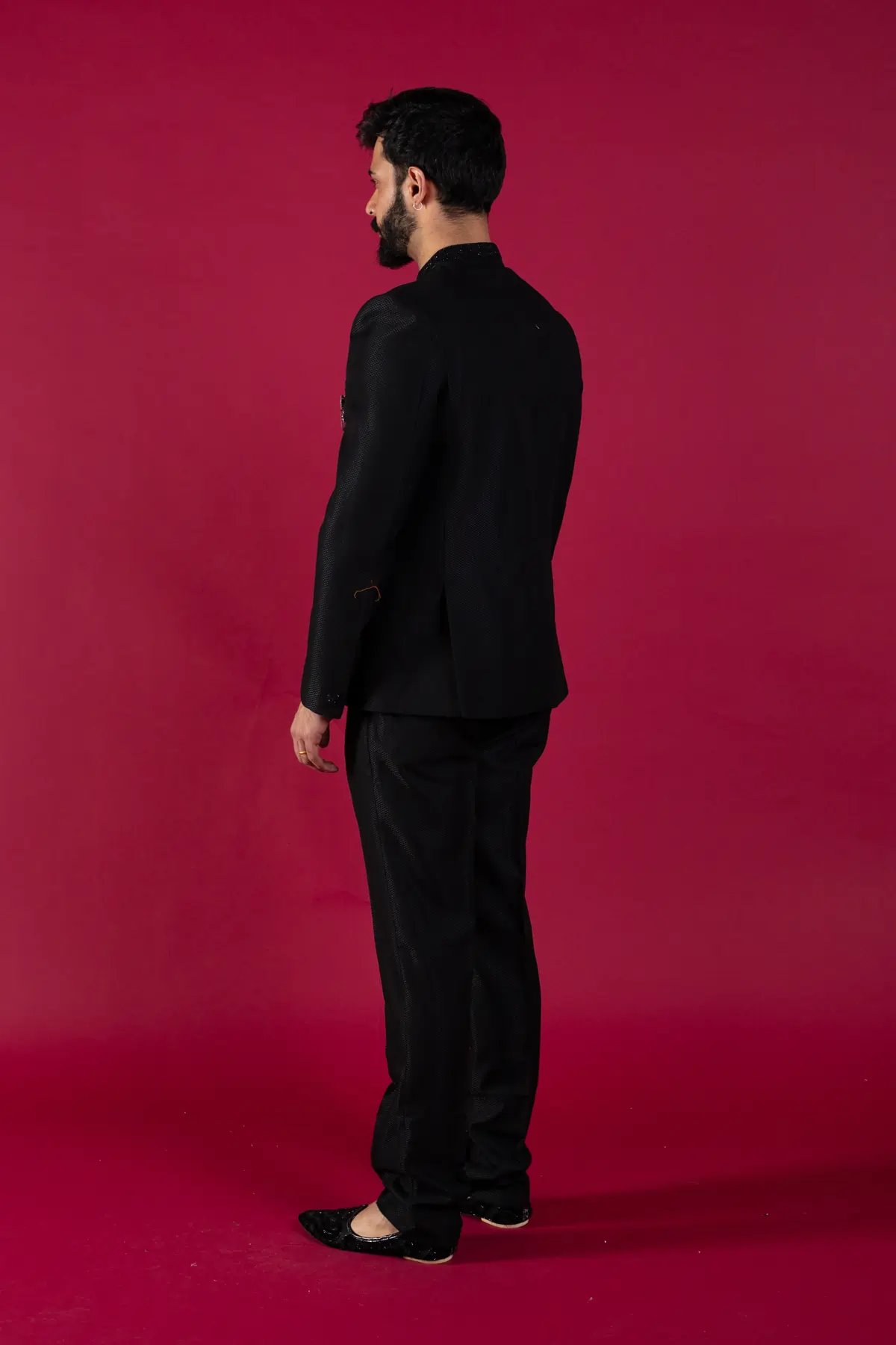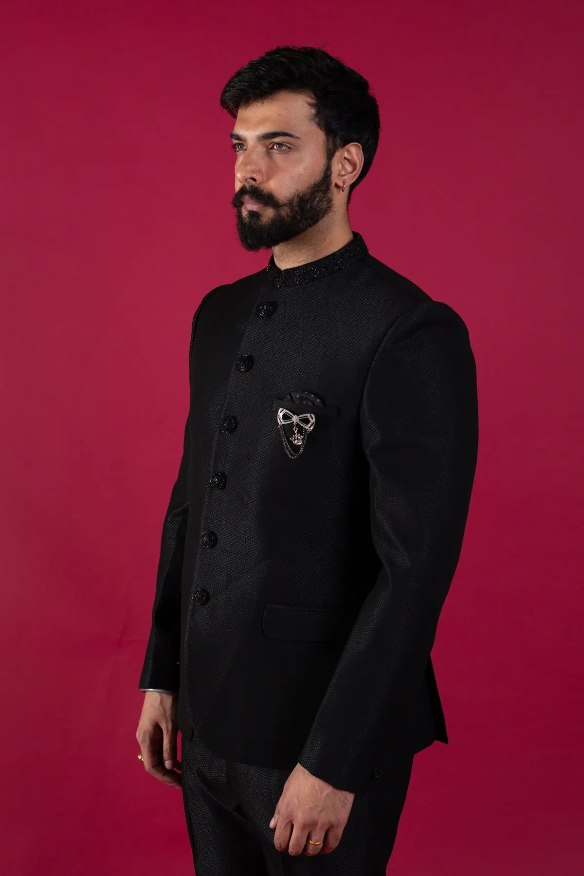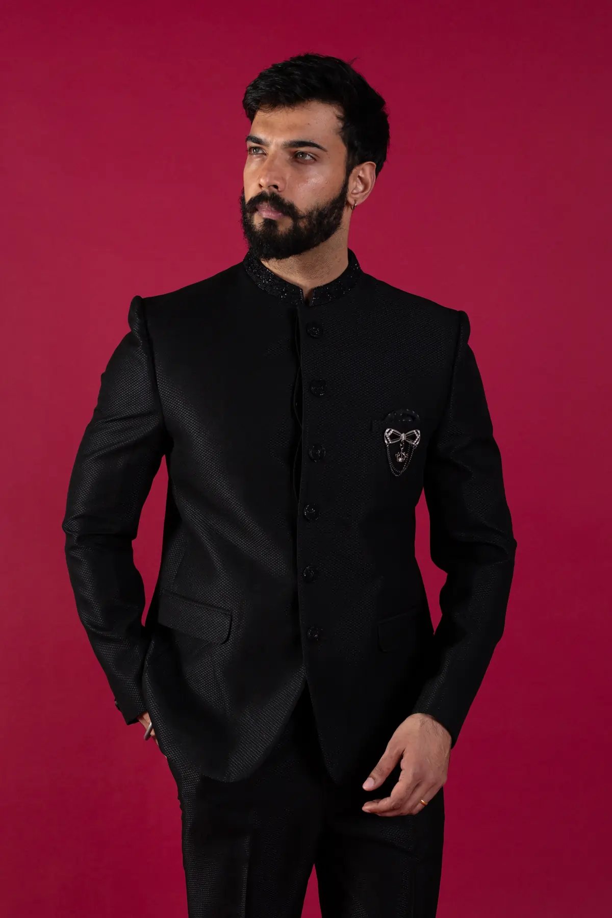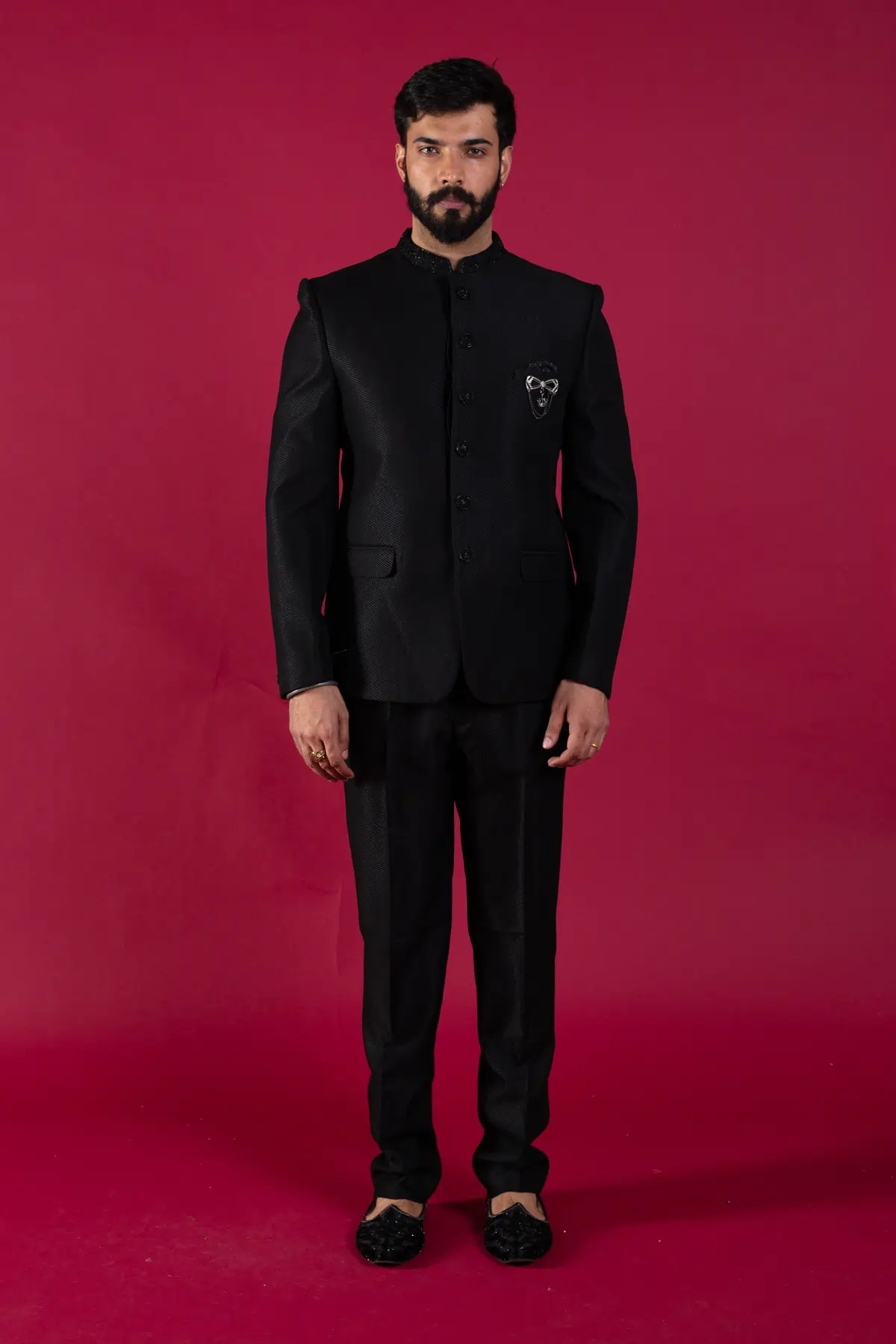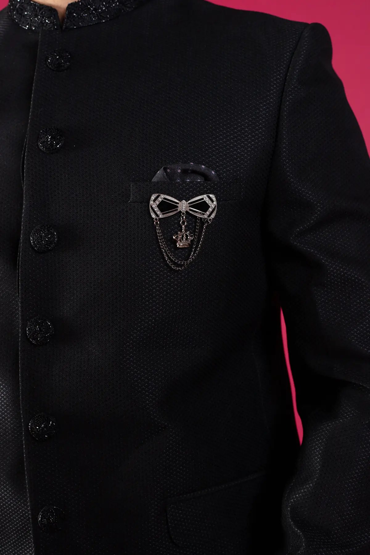 The black indo western sherwani set is a fashionably elevated 2 piece wardrobe must have for your celebratory occasions. Featuring offbeat bow embellished design on the pocket with button embellishment along the middle, this deep-hued outfit gives you an edge over the rest. The attire is appropriate for elaborate evening weddings paired with straight leg trousers.