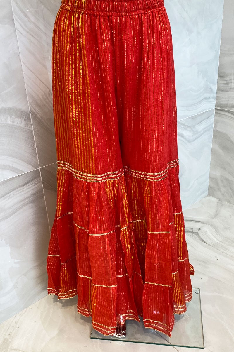 Casual cotton gharara with pati piping . Pair with a tunic to enhance its look.