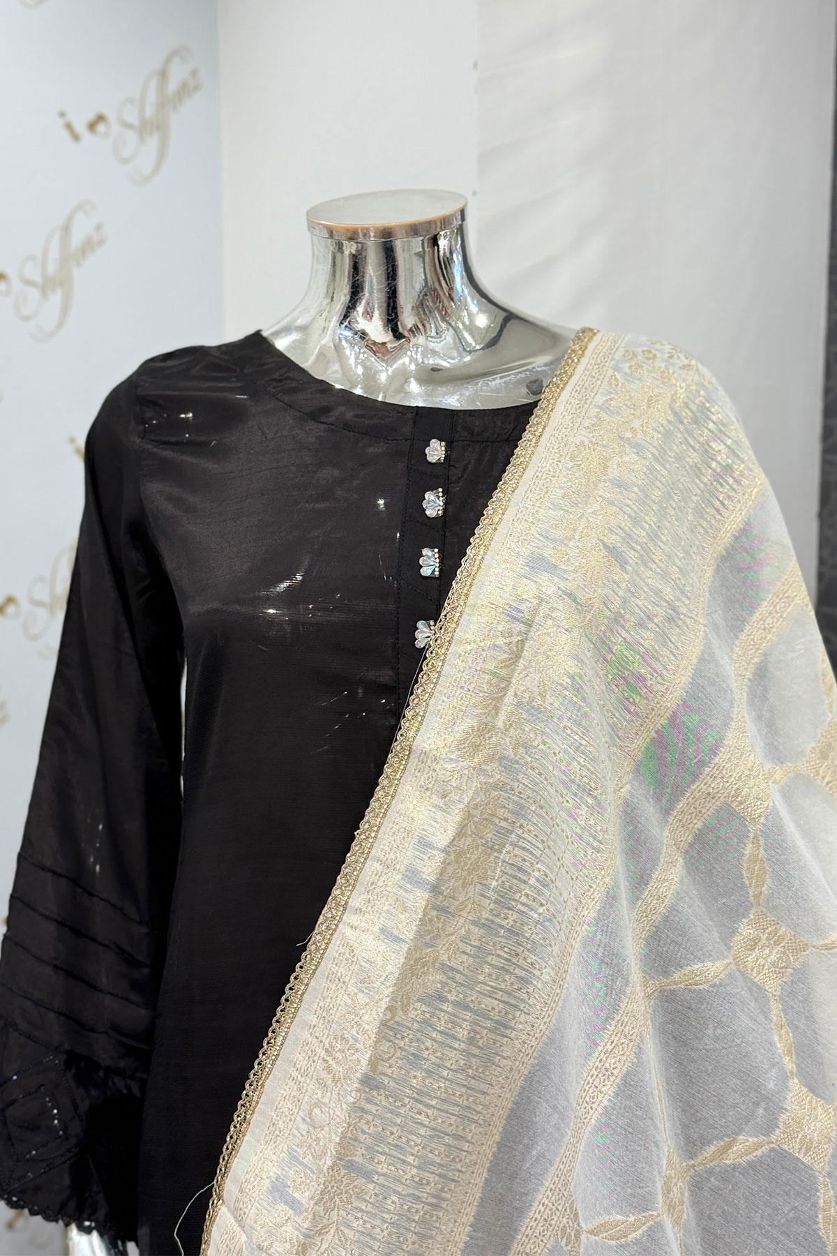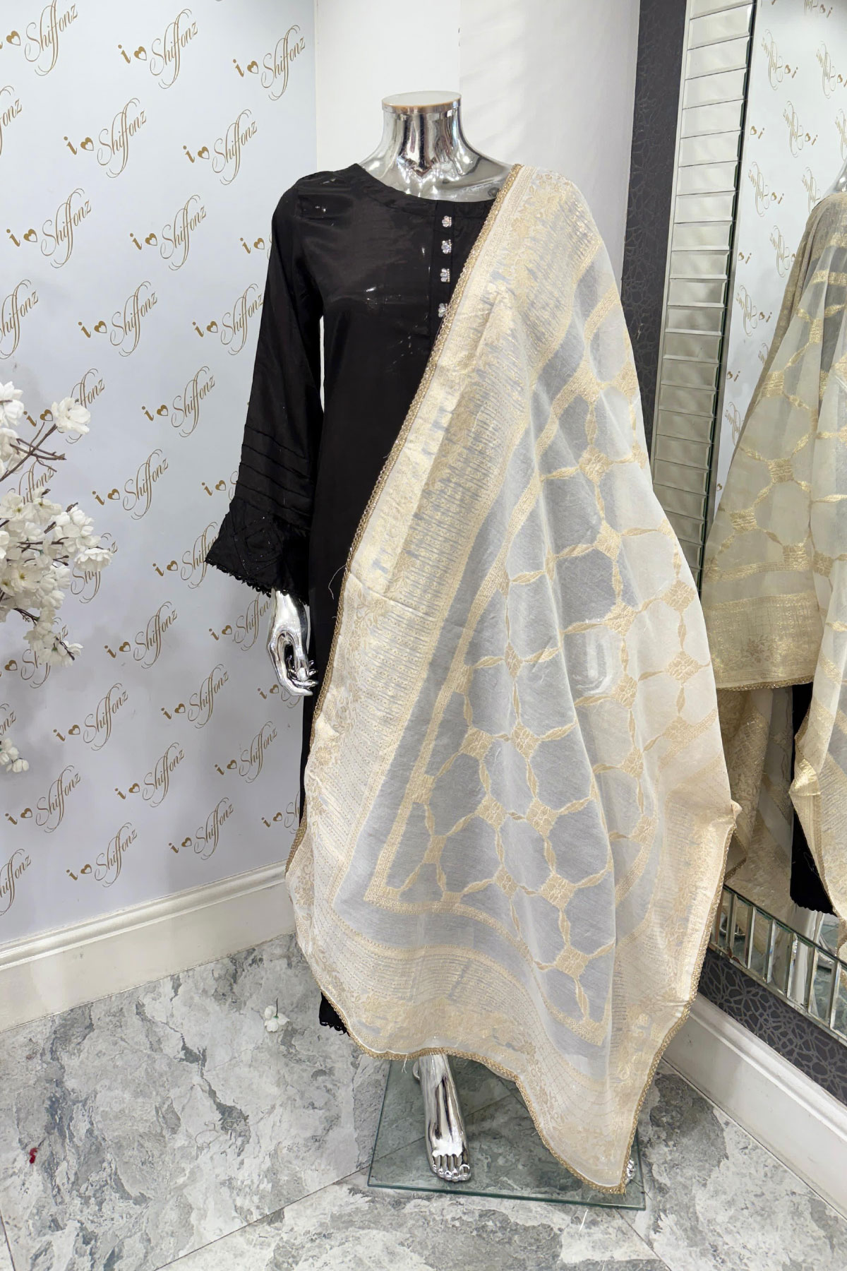 Add a touch of elegance to your wardrobe with this exquisite piece crafted from lightweight, sheer material that offers a delicate drape with shimmery banarsi patterns and feature a graceful width, perfect for layering. Adorned with intricate borders, they elevate any outfit for weddings or festive occasions.