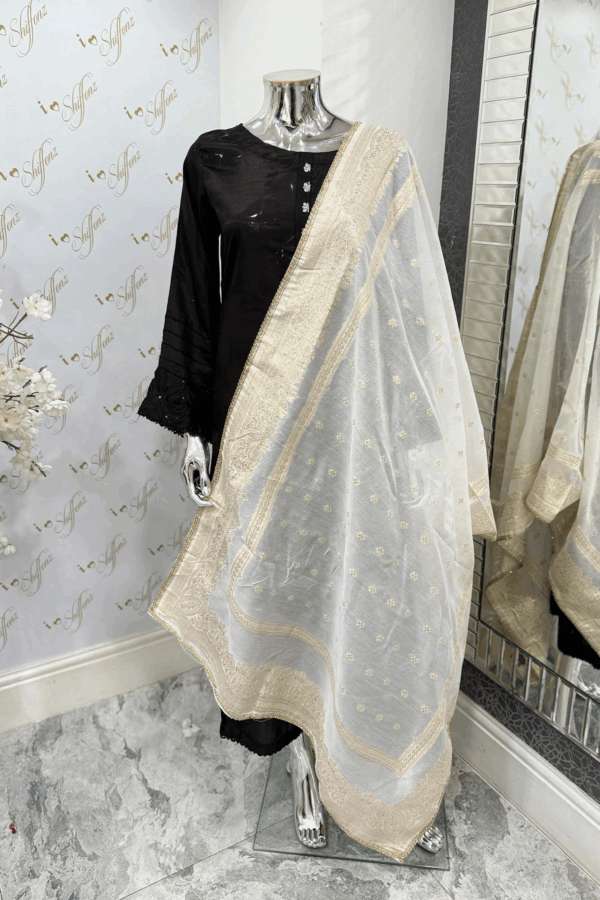 Add a touch of elegance to your wardrobe with this exquisite piece crafted from lightweight, sheer material that offers a delicate drape with shimmery banarsi patterns and feature a graceful width, perfect for layering. Adorned with intricate borders, they elevate any outfit for weddings or festive occasions.