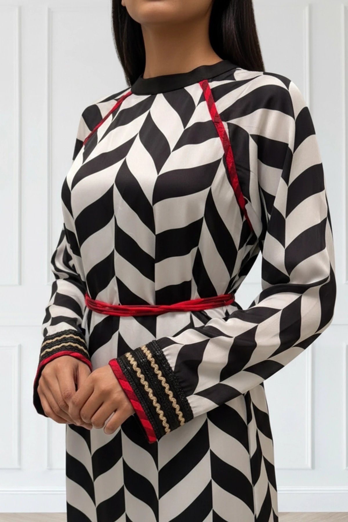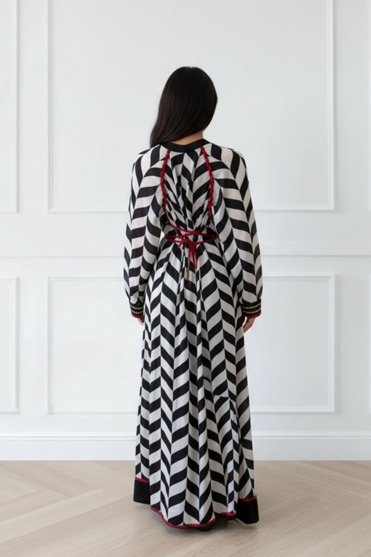 Elevate your wardrobe with this striking black‑and‑white georgette dress, designed for effortless elegance and all‑day comfort. Crafted from lightweight, flowy georgette, the fabric drapes beautifully and moves with ease, making it ideal for both casual outings and special occasions. Bold chevron stripes create a modern, eye‑catching silhouette, while vibrant red piping along the neckline, shoulders, waist, and cuffs adds a refined pop of color. Gold embellishments at the cuffs introduce a touch of festive charm, and the contrast black‑and‑red hem completes the look with a polished finish. This piece blends contemporary design with timeless detailing, offering a versatile statement outfit for any wardrobe.
