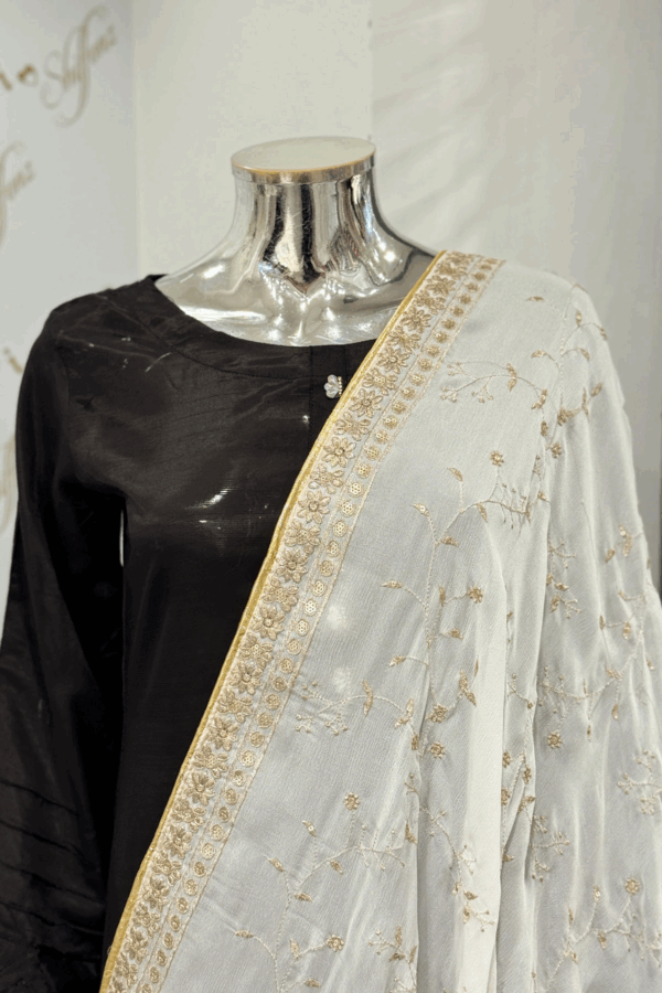 Add a touch of elegance to your wardrobe with this exquisite piece crafted from lightweight, sheer material that offers a delicate drape with beautiful embroidered patterns throughout the middle with a heavier border, this classic stunner is a must to be worn with your plain ethnic collection.