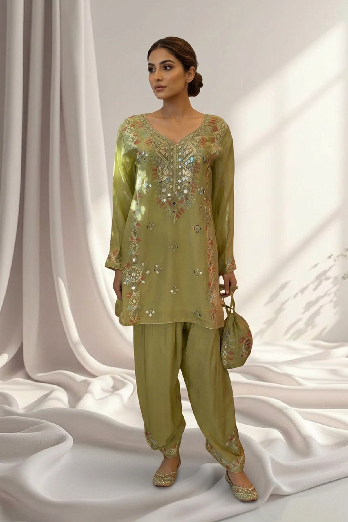The look is completed with a matching embroidered potli bag, adding a charming, thoughtfully coordinated accessory that elevates the outfit’s overall elegance.