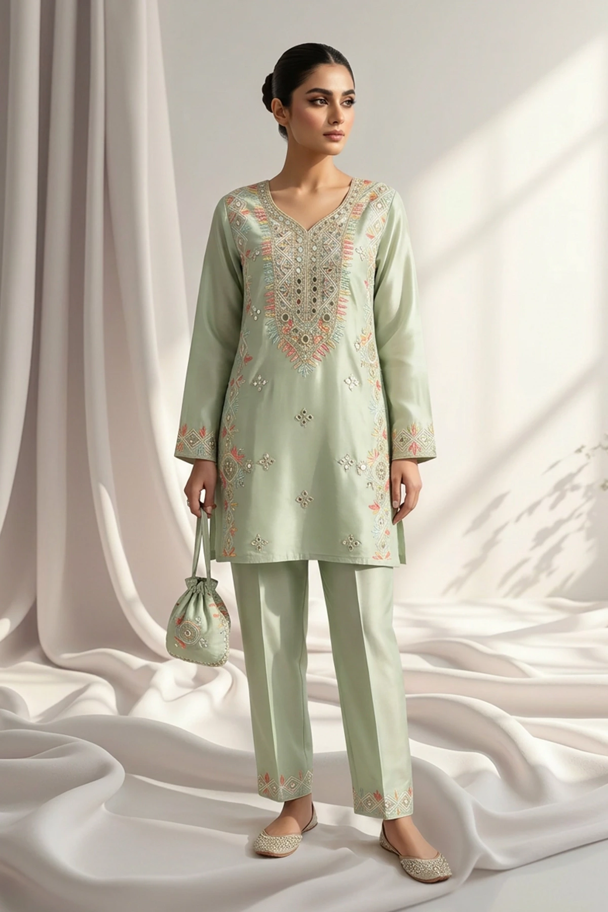 This elegant 2‑piece raw silk outfit features a beautifully tailored long shirt adorned with intricate mirror embellishments, each set within fine thread detailing that adds depth and refined handcrafted finish along with embellishment placement along the neckline, front panel, and cuffs.