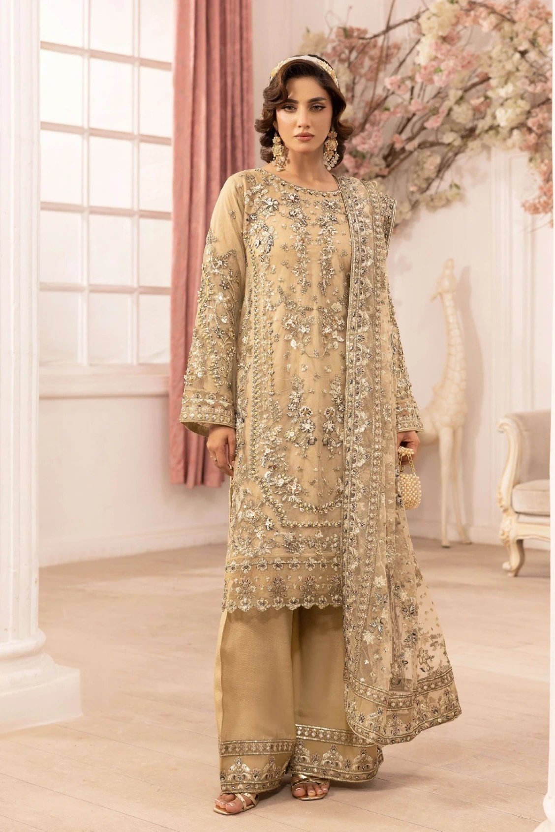 This beautiful 3 piece Crimson collection features a straight shirt with luxury thread work embroidery throughout with motif and bead embellishments, finished with full length embroidered sleeves. Paired with wide leg plazo trousers and the look is finished with a printed organza embroidered dupatta. Perfect festive wear for this Eid.