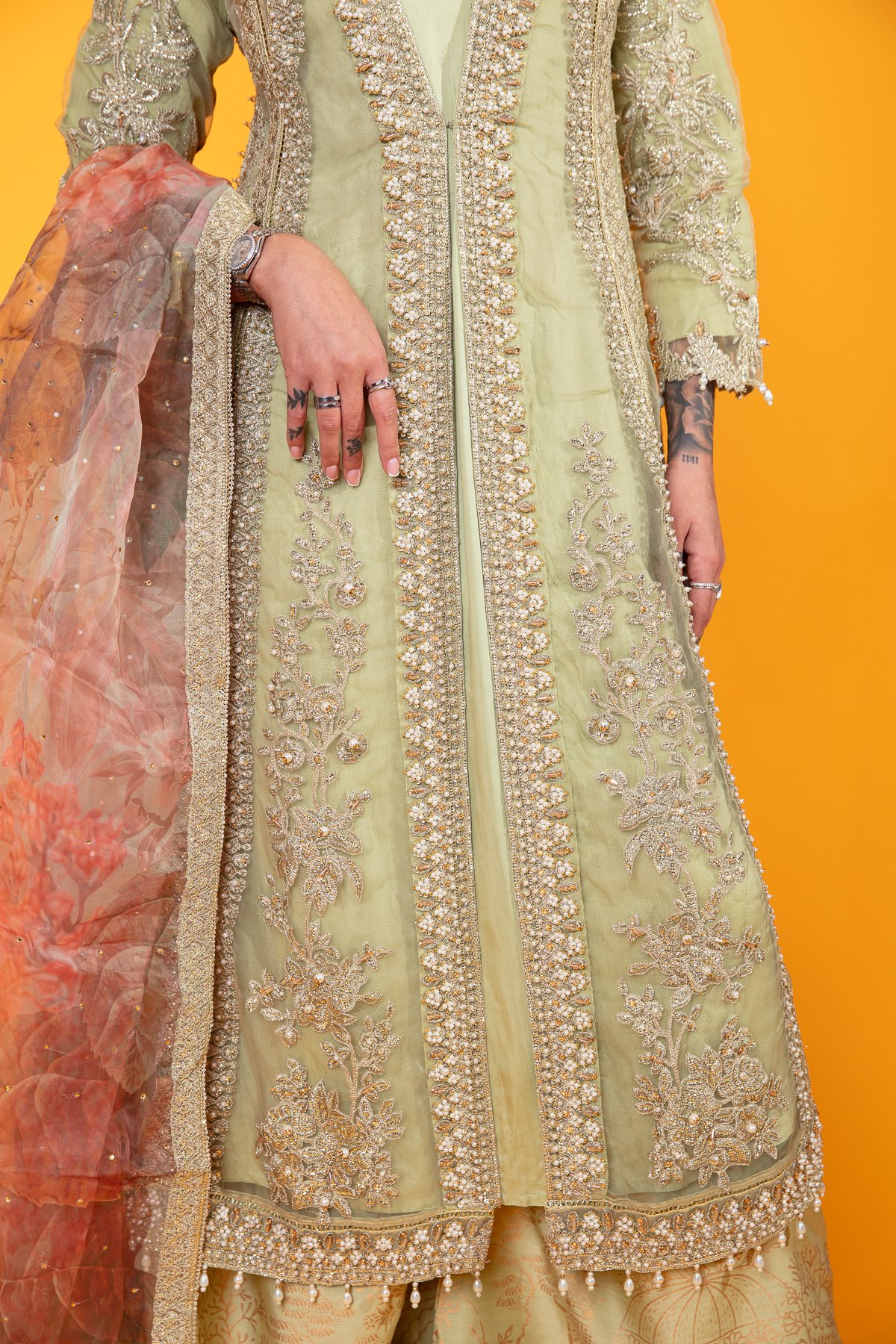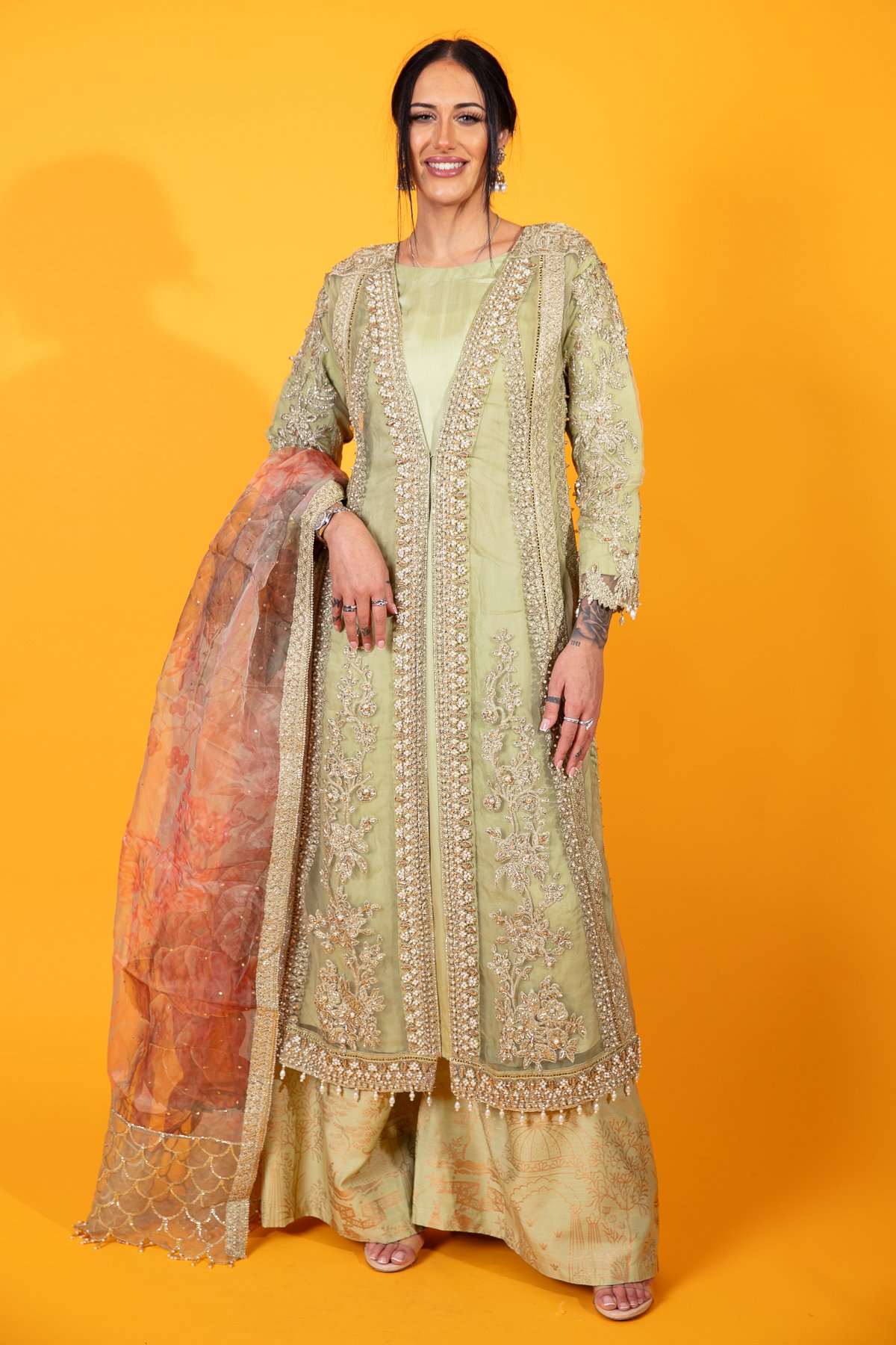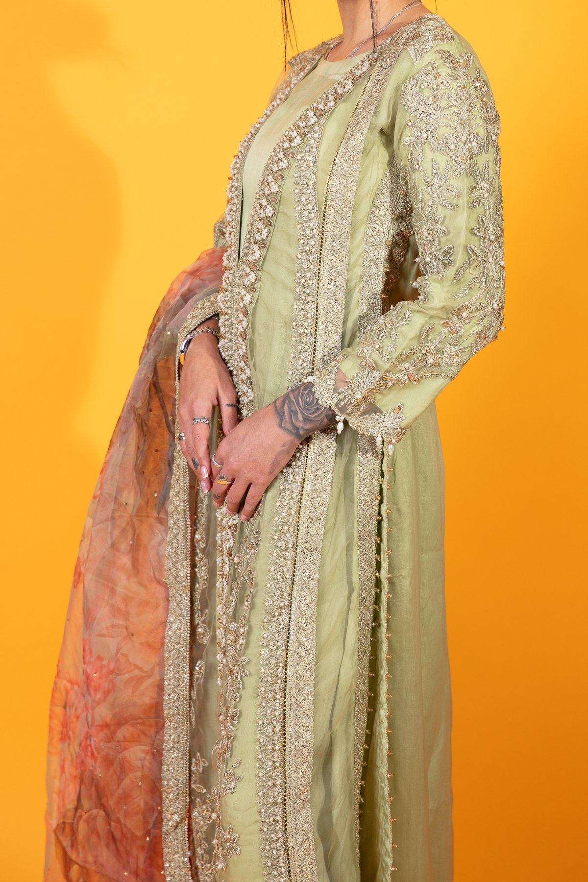 This beautiful 3 piece Crimson suit features a straight shirt with thread work embroidery throughout the front and full length sleeves along with pearl and bead embellishments, finished with malai lining. The look is finished with banarsi wide leg plazo trousers and a contrasted digital printed organza dupatta.
