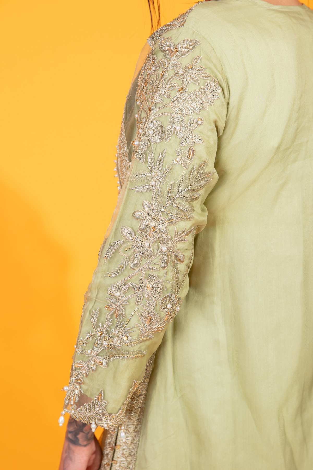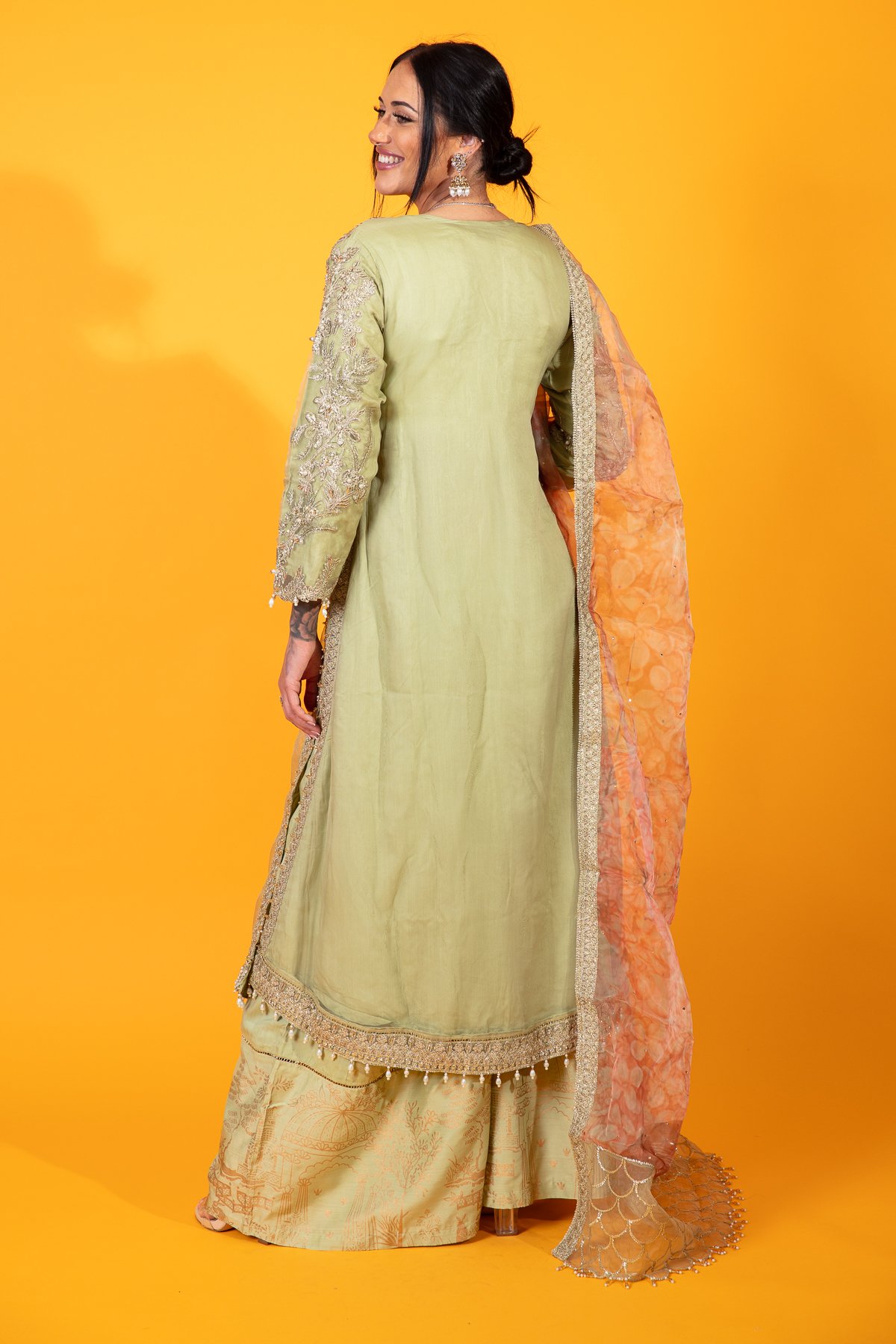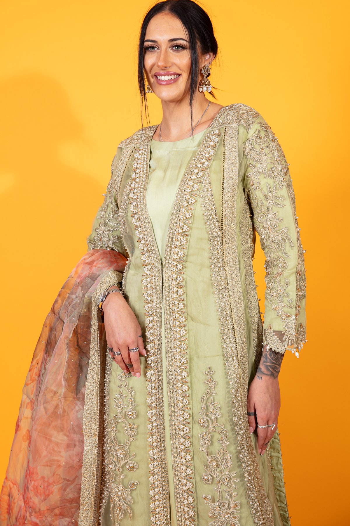 This beautiful 3 piece Crimson suit features a straight shirt with thread work embroidery throughout the front and full length sleeves along with pearl and bead embellishments, finished with malai lining. The look is finished with banarsi wide leg plazo trousers and a contrasted digital printed organza dupatta.