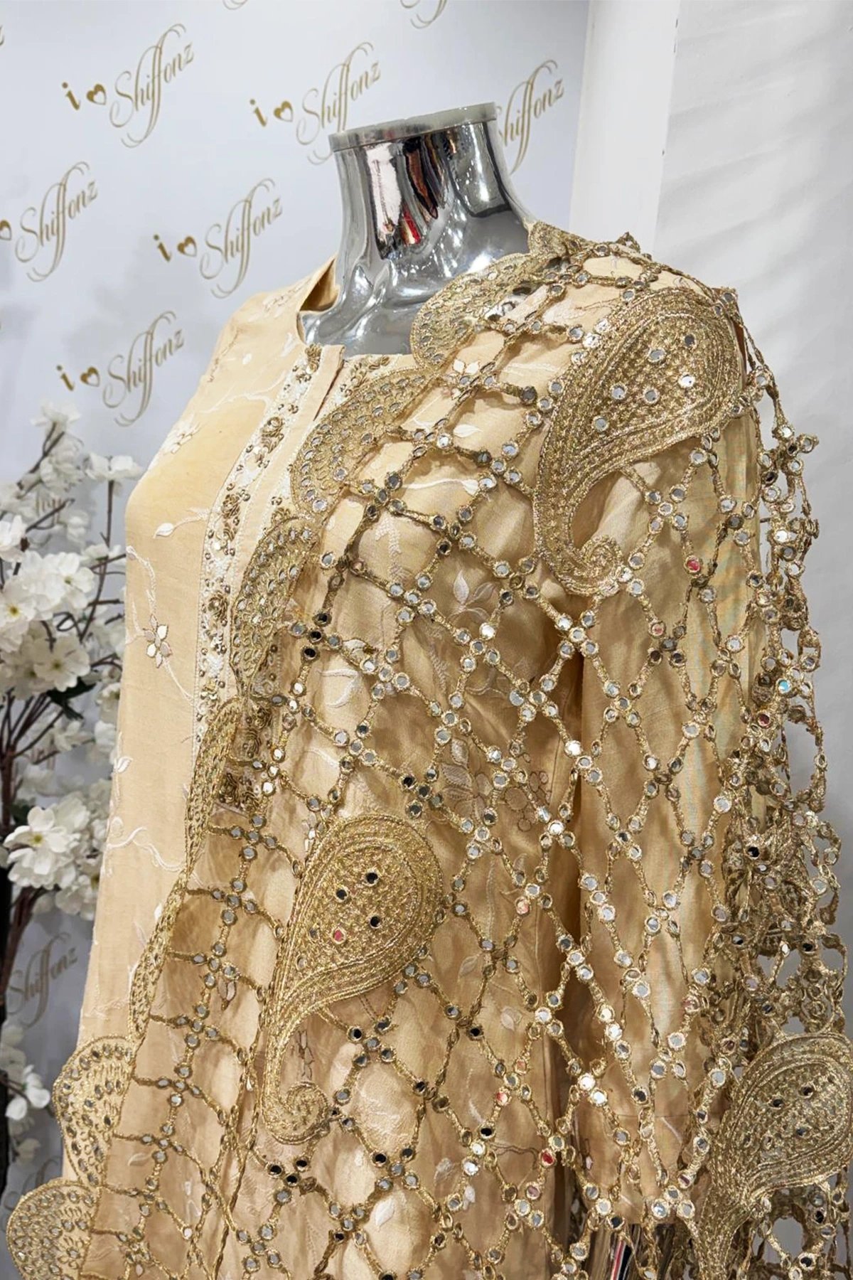 This beautiful sheesh pati dupatta offering the perfect blend of tradition and contemporary grace. Whether draped over your shoulders or styled as a statement piece, it adds instant grandeur to any ensemble.Featuring mirrors on one side and shimmering gold sequins on the other. Note: There may be visible glue on the dupatta, which is a normal part of the manufacturing process. Rest assured, it will not be noticeable when you wear it.