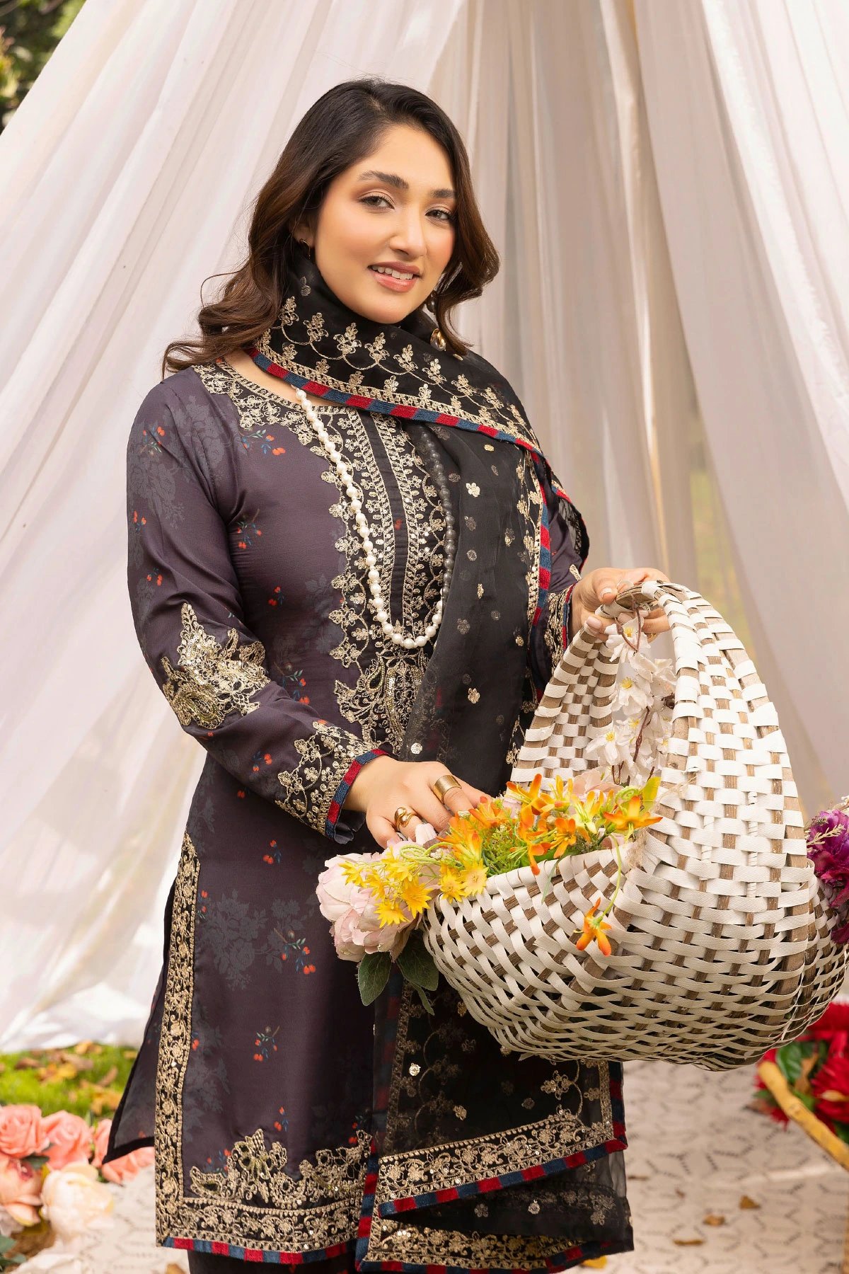 This beautiful 3 piece daisy collection feature s straight printed shirt with luxury thread work embroidery along the front and border finished with full length embroidered sleeves. Paired with a printed farshi shalwar. The look is finished with an organza embroidered dupatta. Perfect casual collection for this Eid.