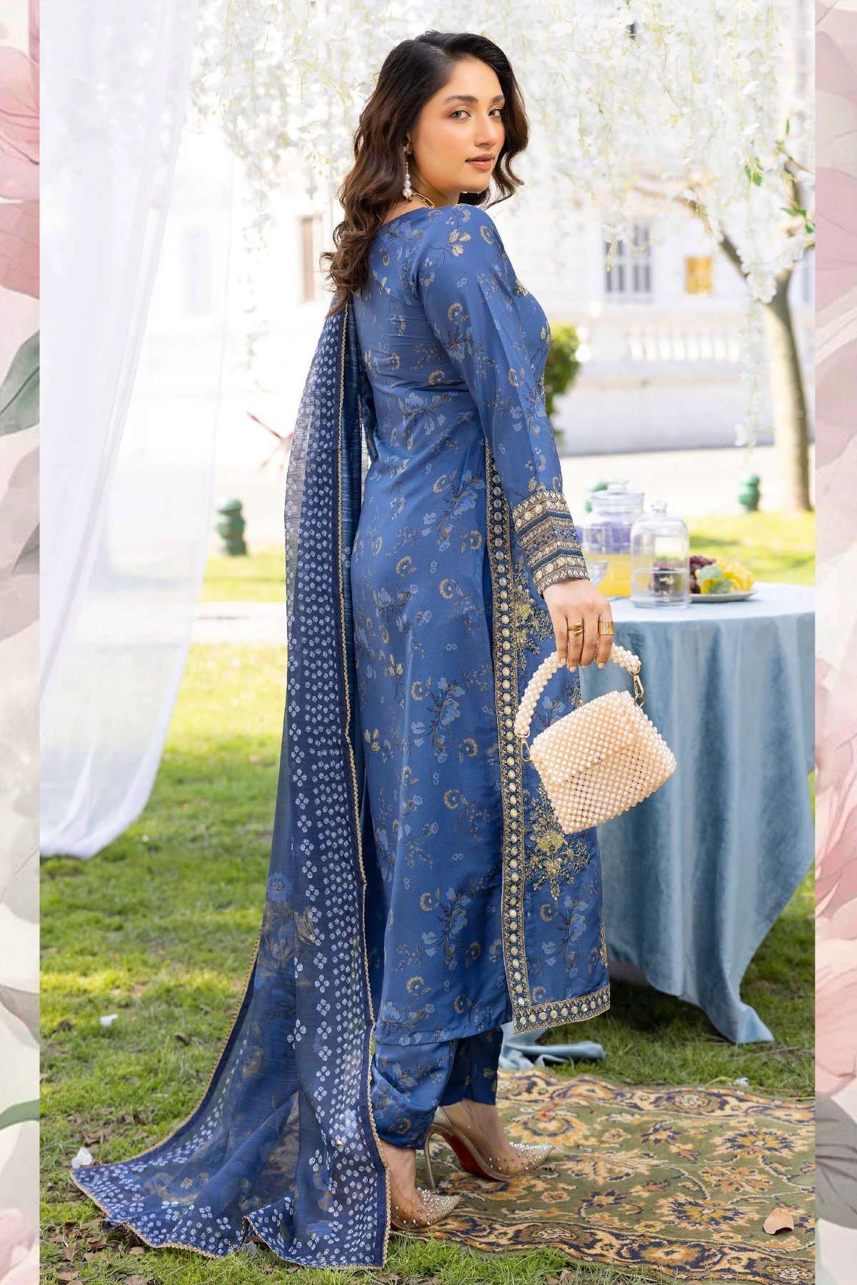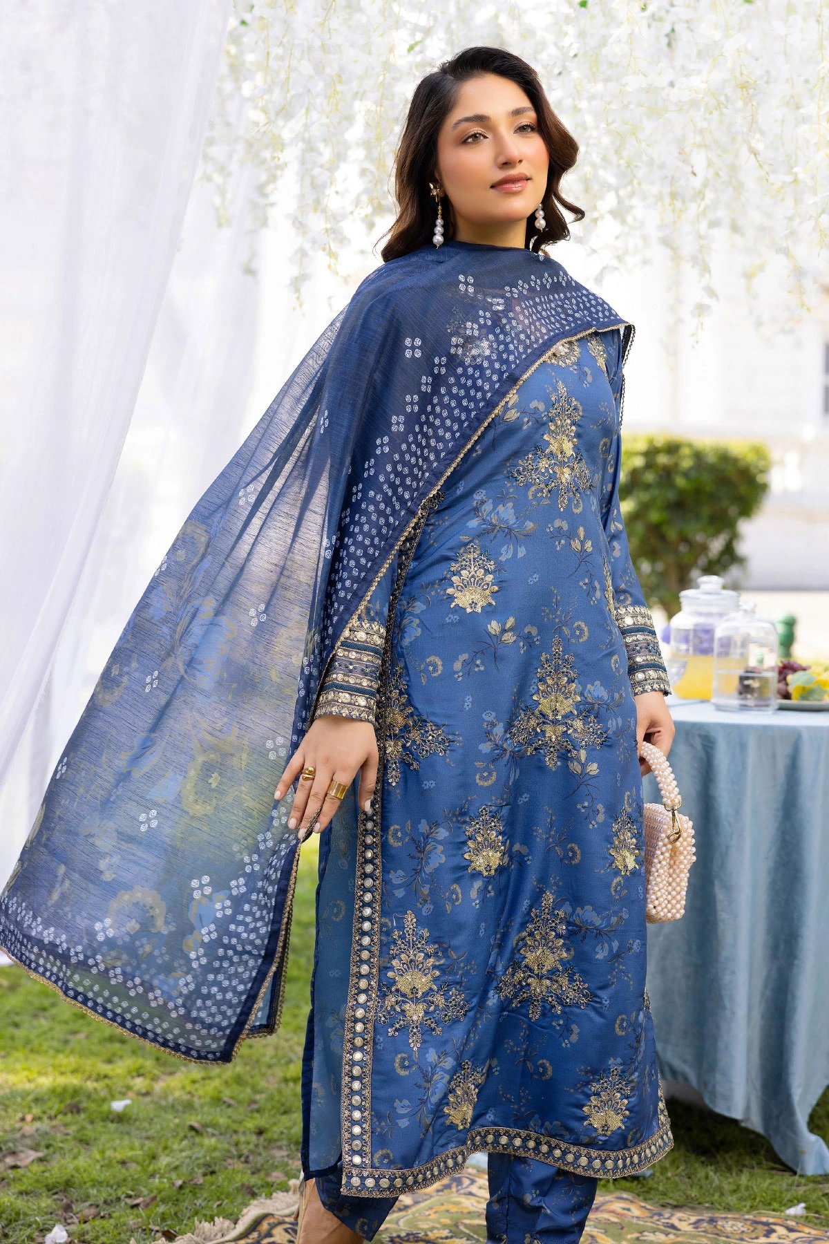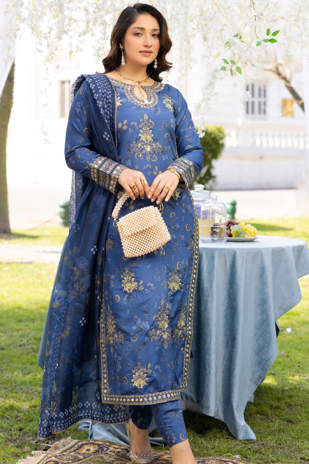 This beautiful 3 piece daisy collection feature s straight printed shirt with an embroidered key hole neckline along with embroidered patches throughout the front, finished with full length embroidered sleeves. Paired with printed trousers. The look is finished with a lawn printed dupatta. Perfect casual collection for this Eid.