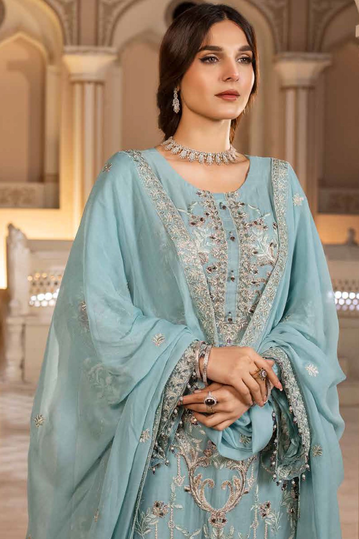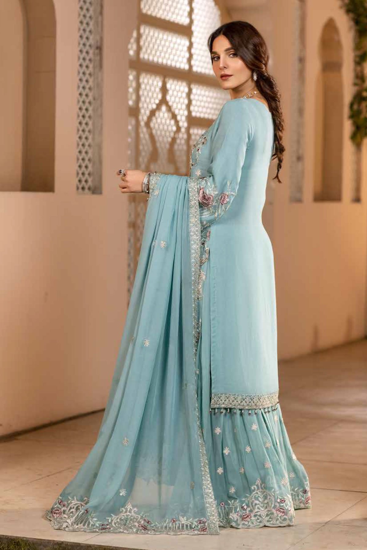 This beautiful 3 piece Dastaan by Shiffonz suit features a straight shirt with luxury thread work embroidery throughout the front with diamantés embellishment along with dangling beads from the border and down the neckline on the front. It comes with full length embroidered sleeves and a chiffon embroidered sharara. The look is finished with a chiffon embroidered dupatta. Note: Above catalogue pictures are for design reference only.
