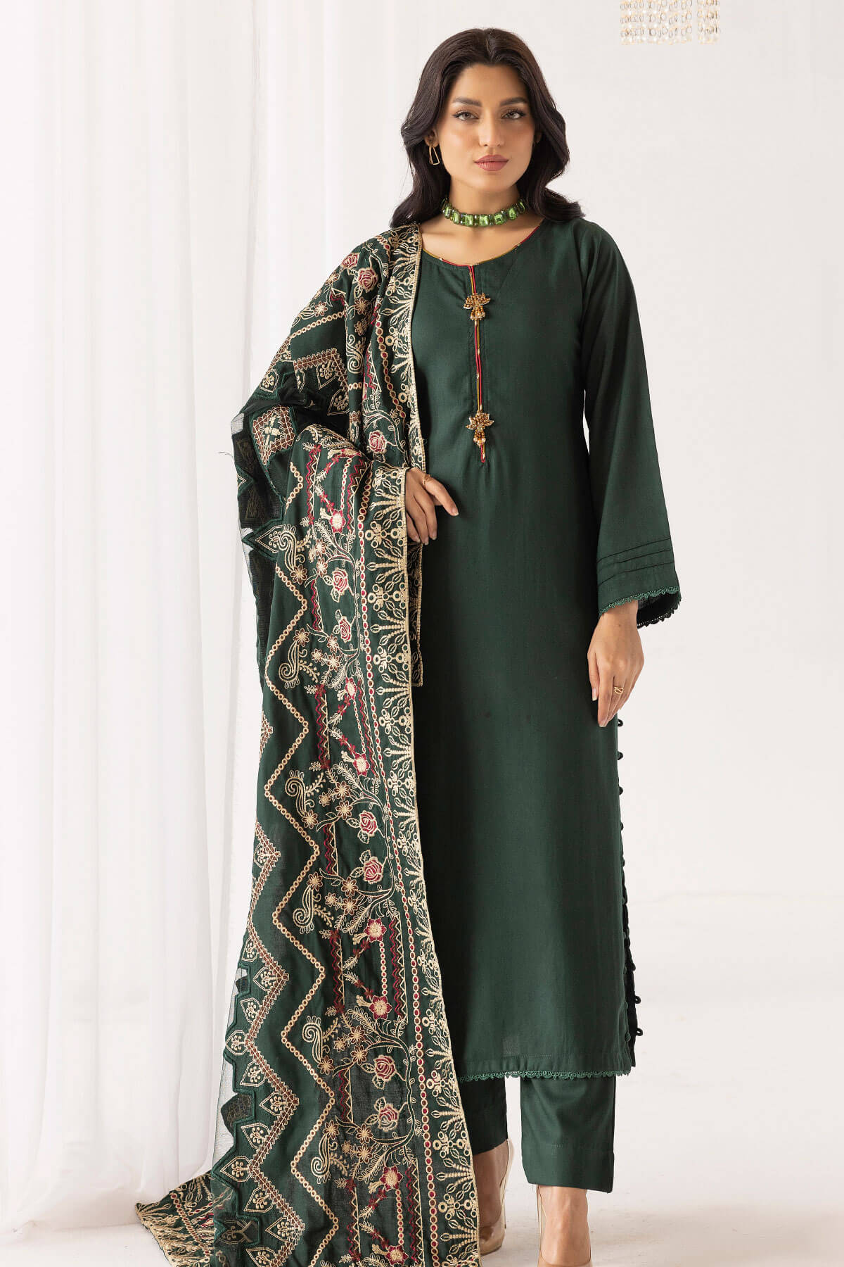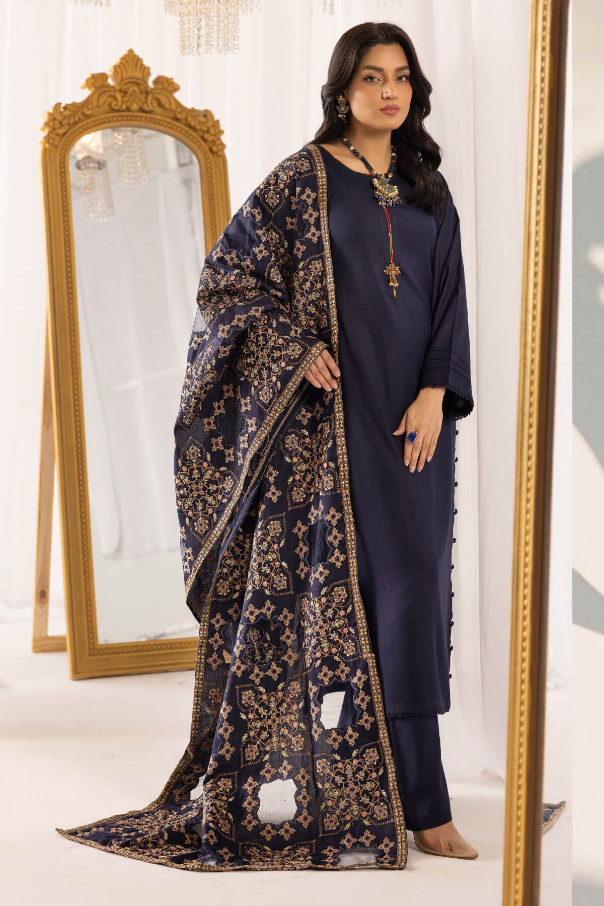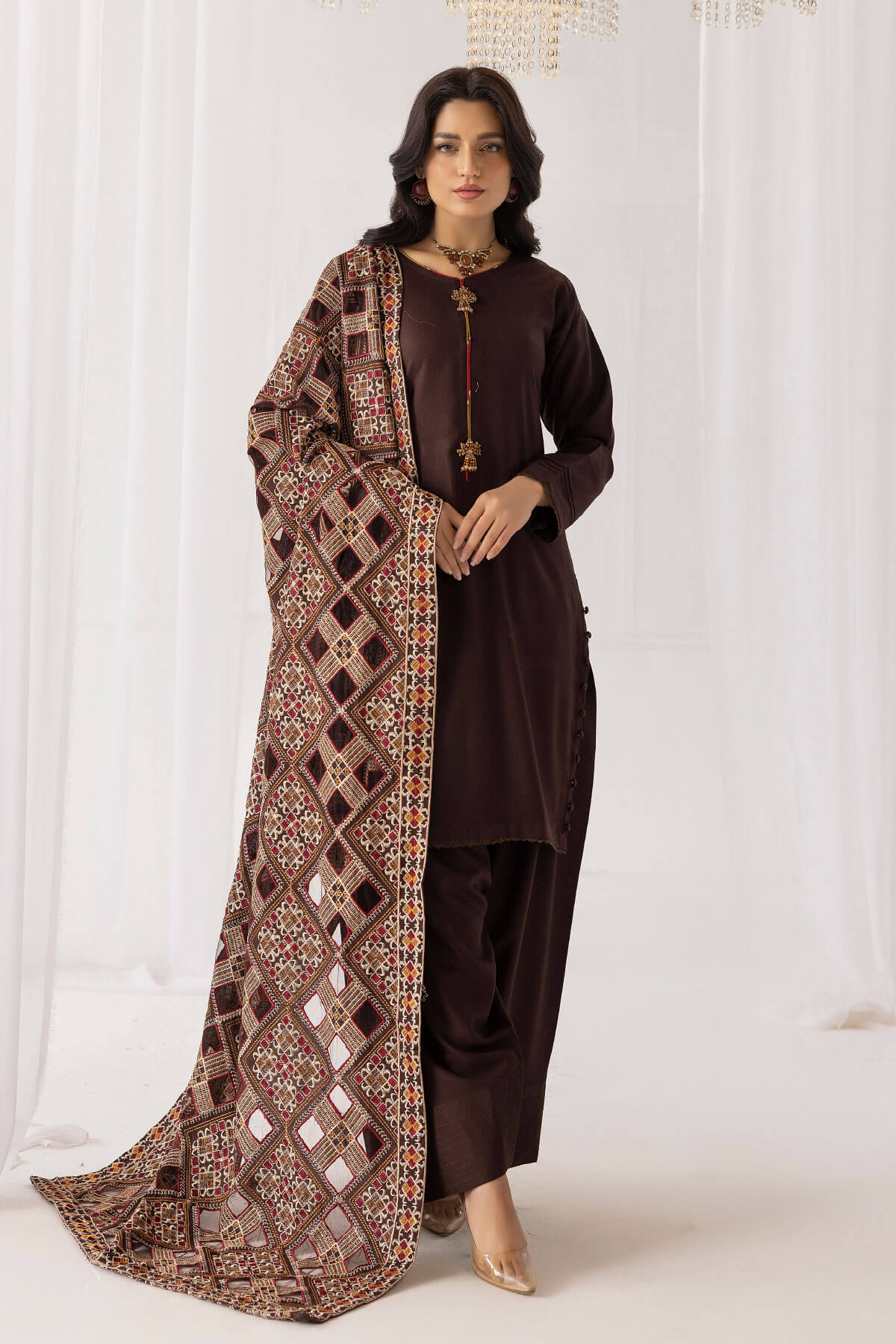 This beautiful 3 piece dhanak collection features a straight linen shirt with bead embellishments on the front, finished with full length sleeves. Paired with flared shalwar/plazo trousers. The look is finished with luxury thread work embroidered laser kari cut work shawls. Note: The shawl designs will vary with each colour of the outfit.