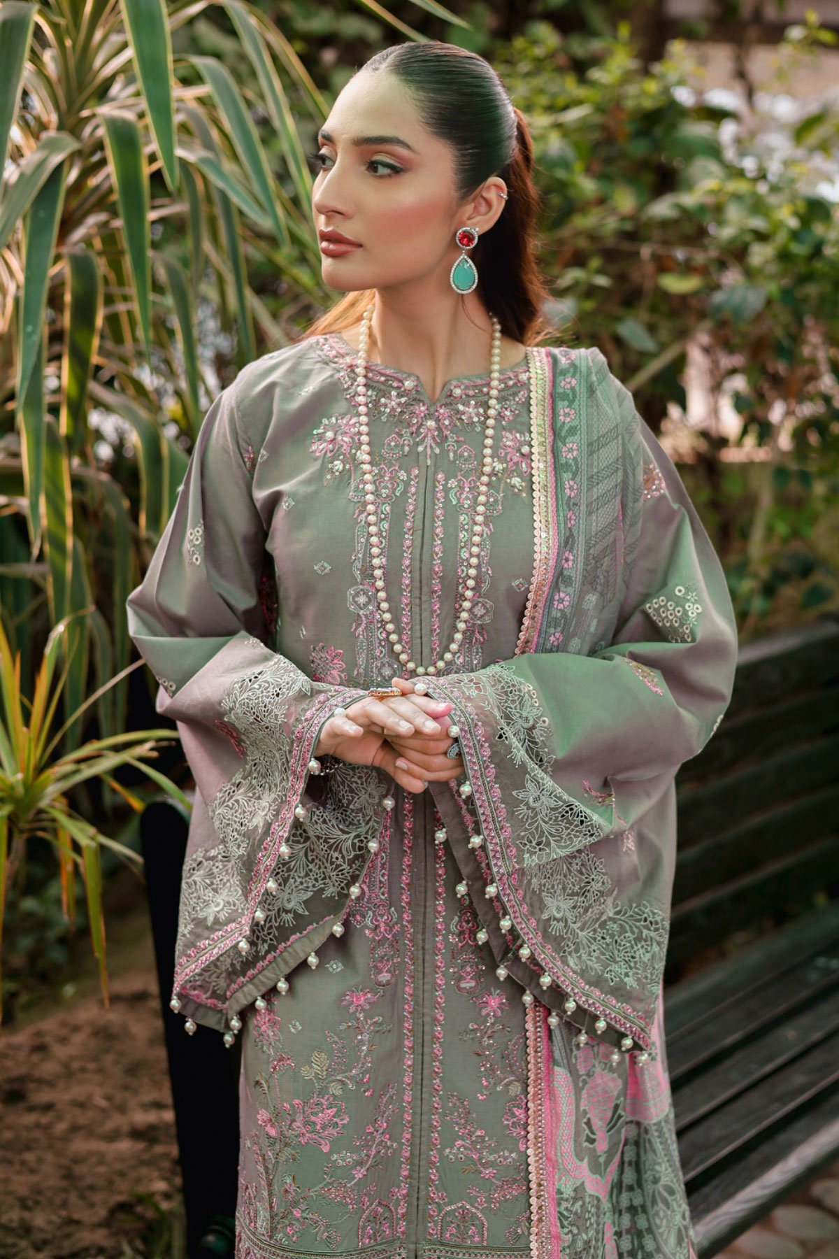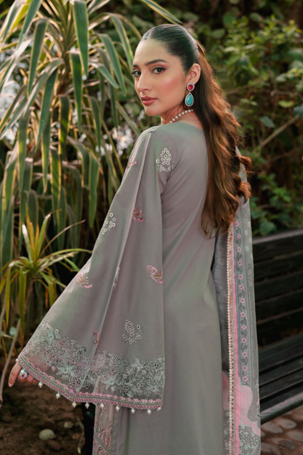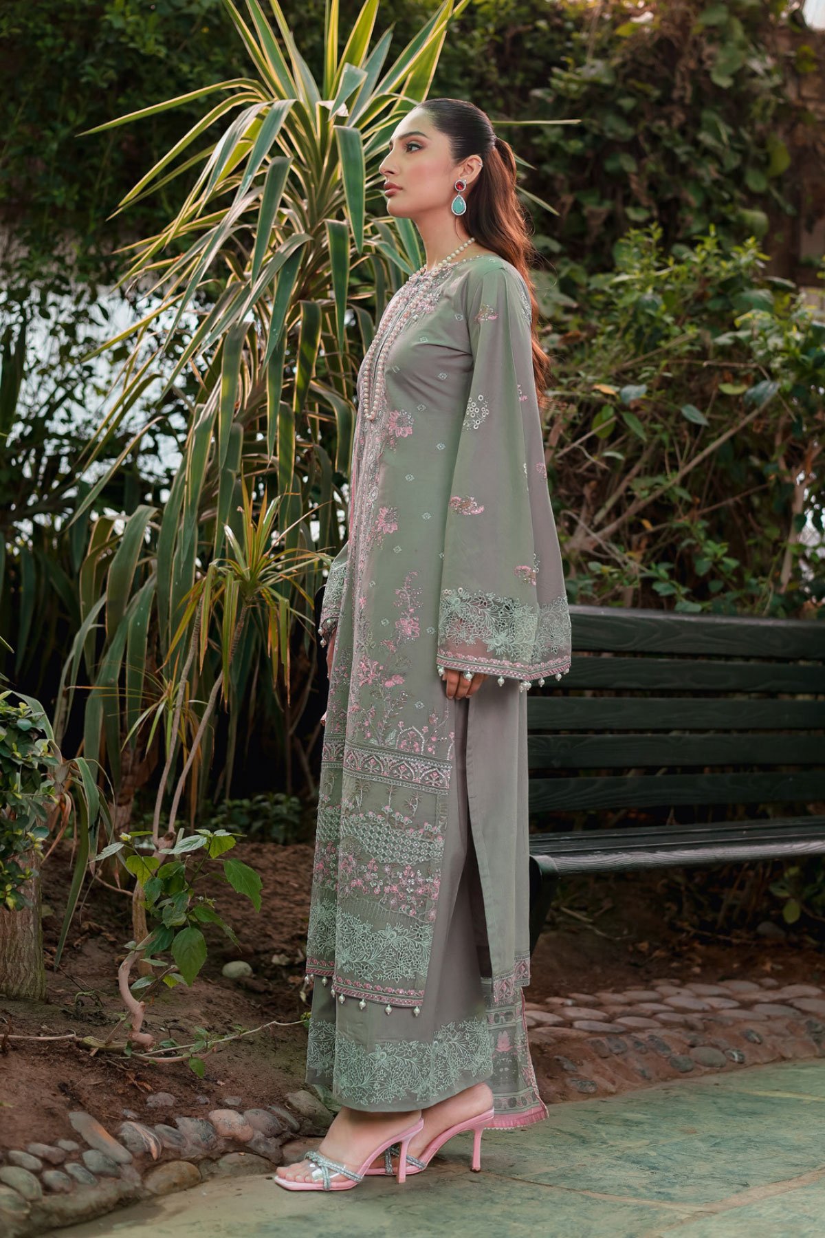 This beautiful 3 piece chikankari collection features a straight embroidered shirt, finished with an organza embroidered border with dangling beads. It comes with full length embroidered sleeves and straight leg trousers. The look is finished with a chiffon digital printed dupatta. Perfect mother and daughter collection for this Eid. Note; Above catalogue designs are for design reference only.