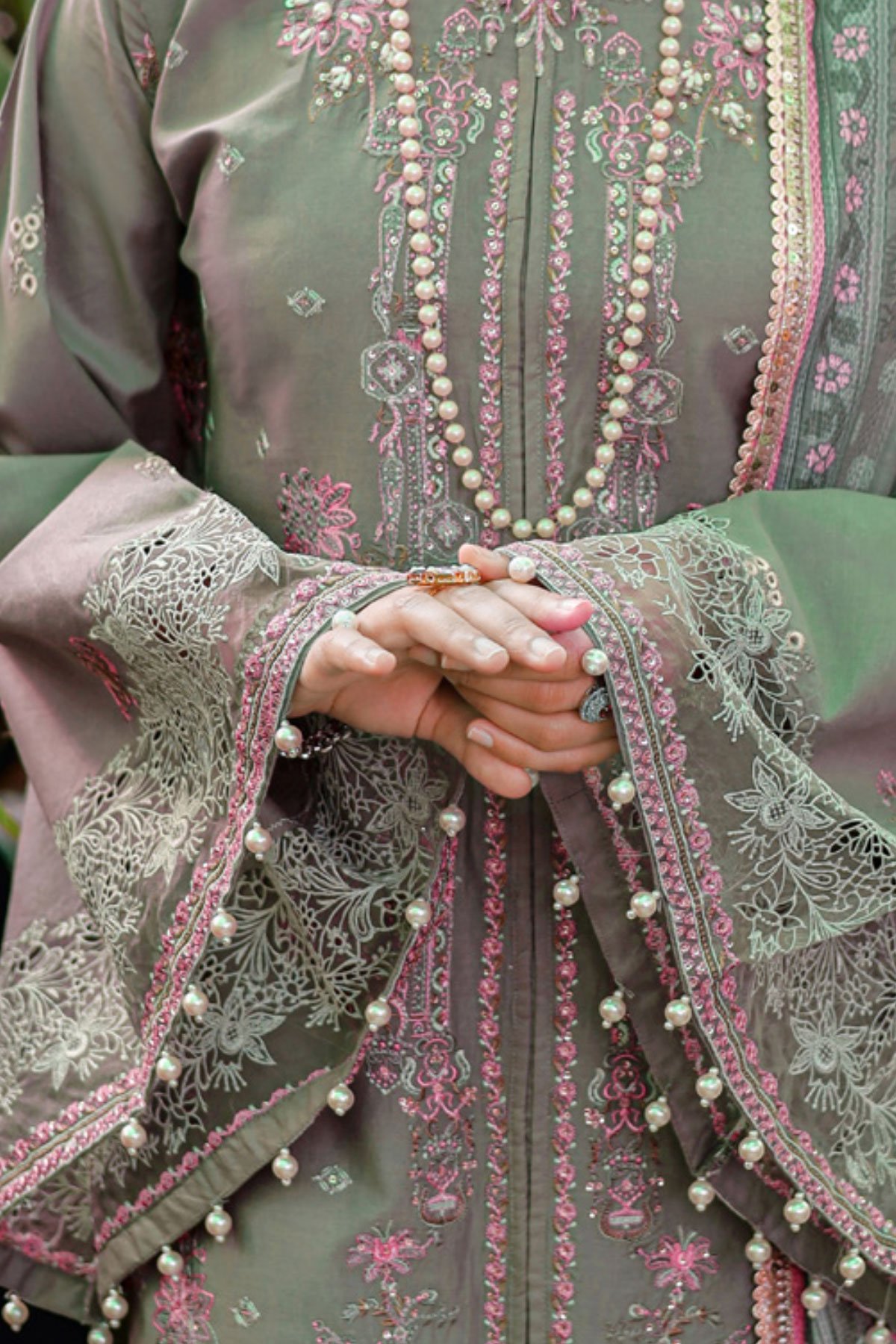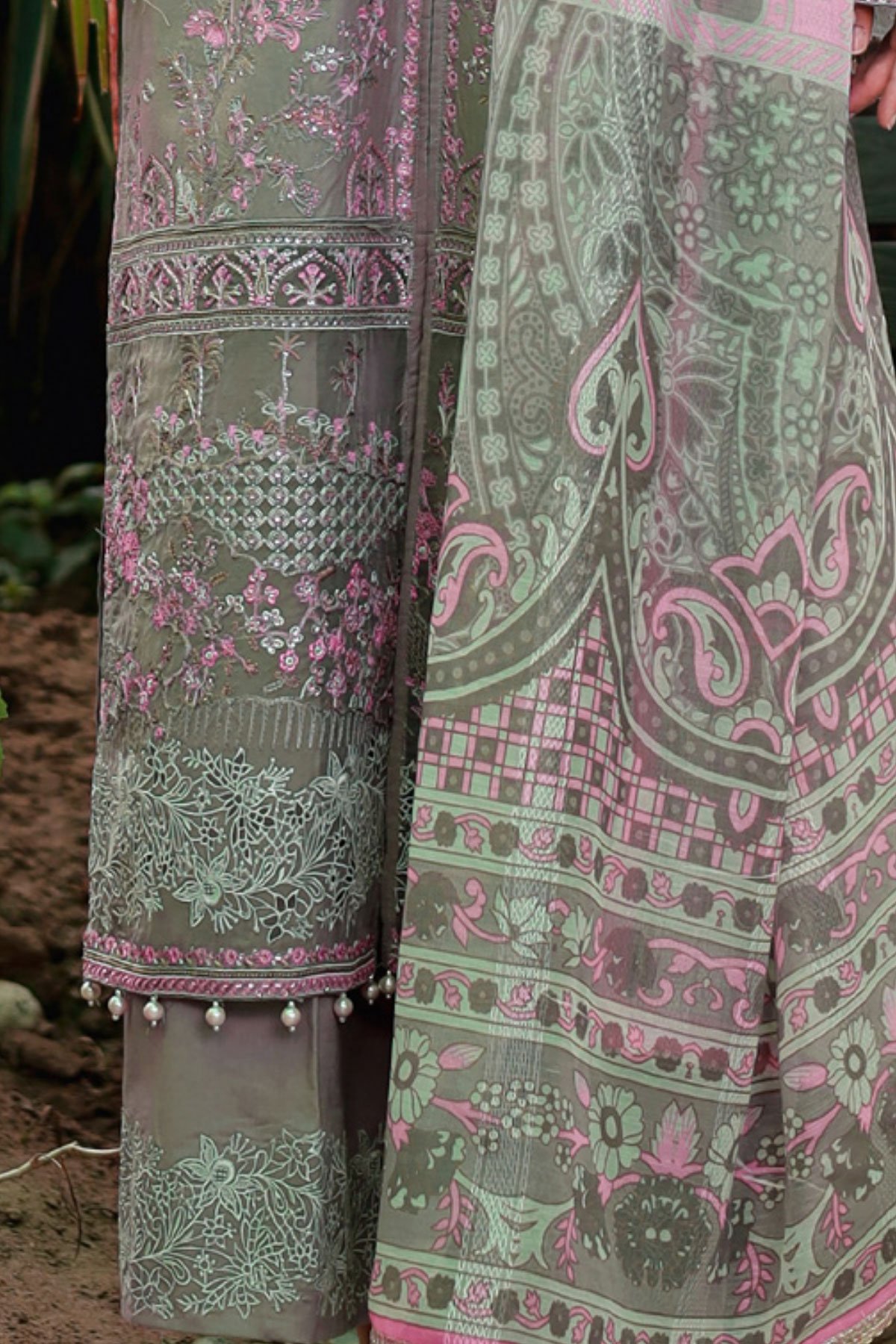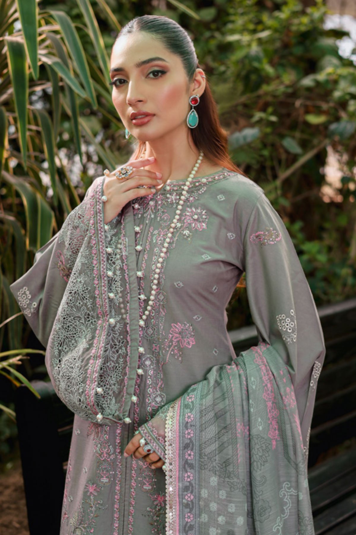 This beautiful 3 piece chikankari collection features a straight embroidered shirt, finished with an organza embroidered border with dangling beads. It comes with full length embroidered sleeves and straight leg trousers. The look is finished with a chiffon digital printed dupatta. Perfect mother and daughter collection for this Eid. Note; Above catalogue designs are for design reference only.