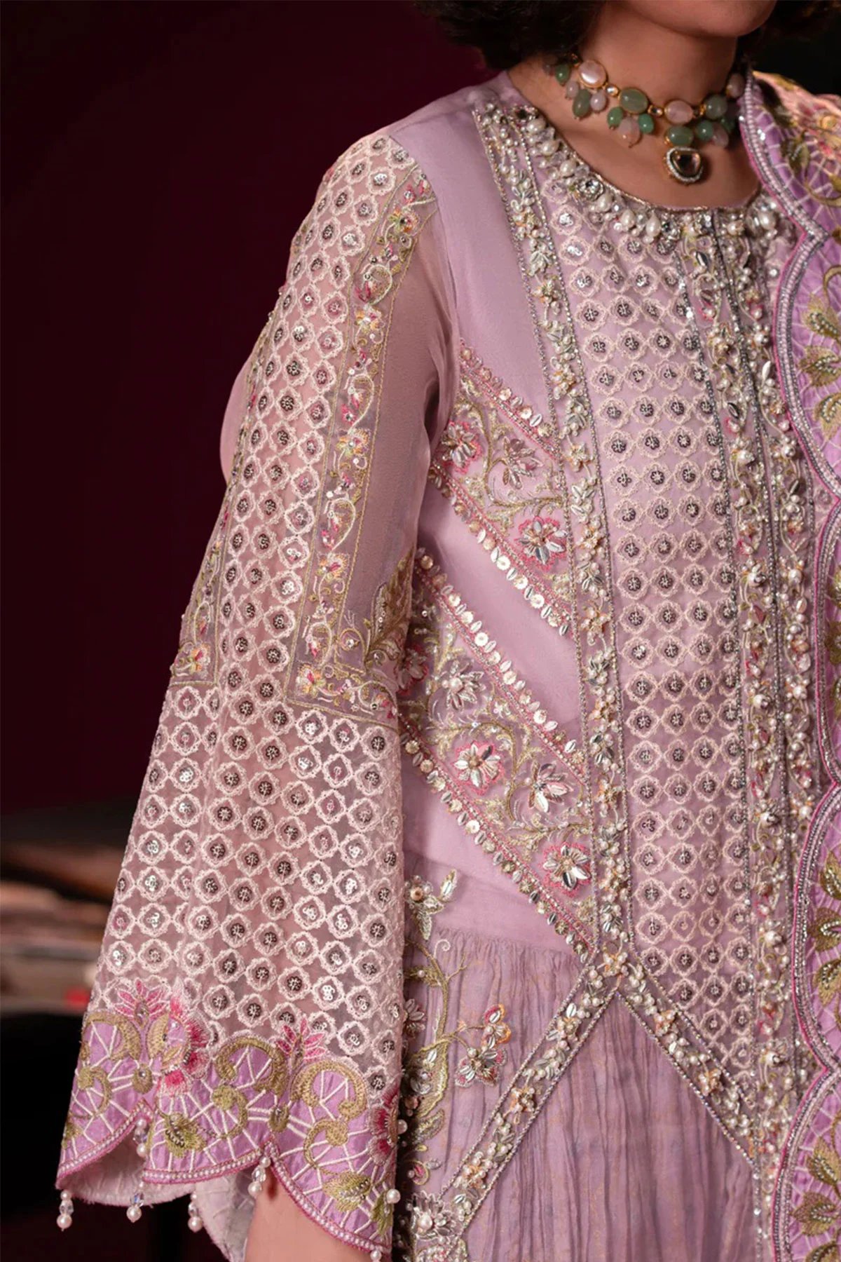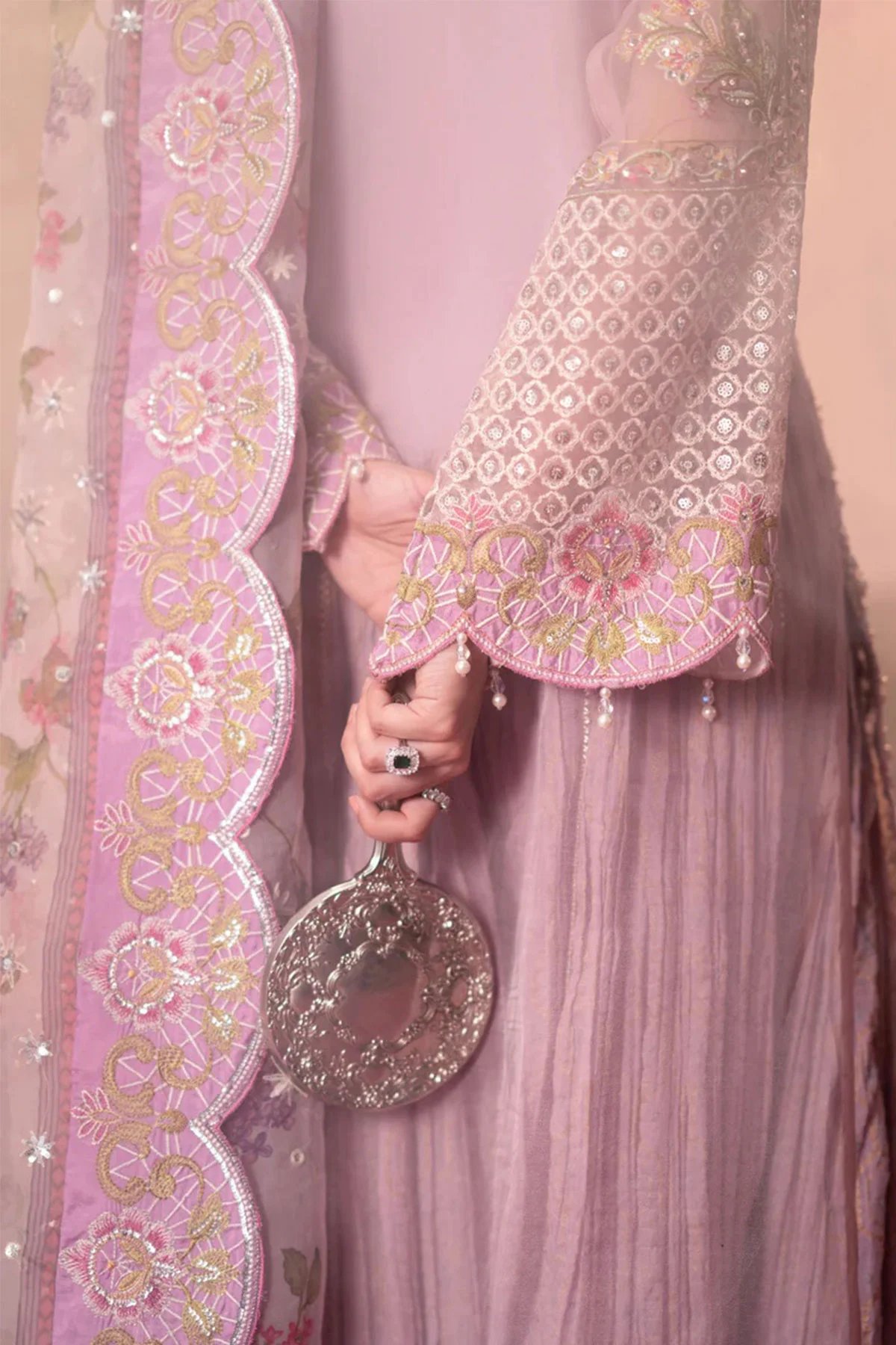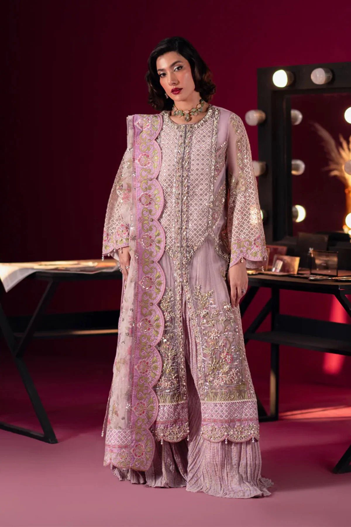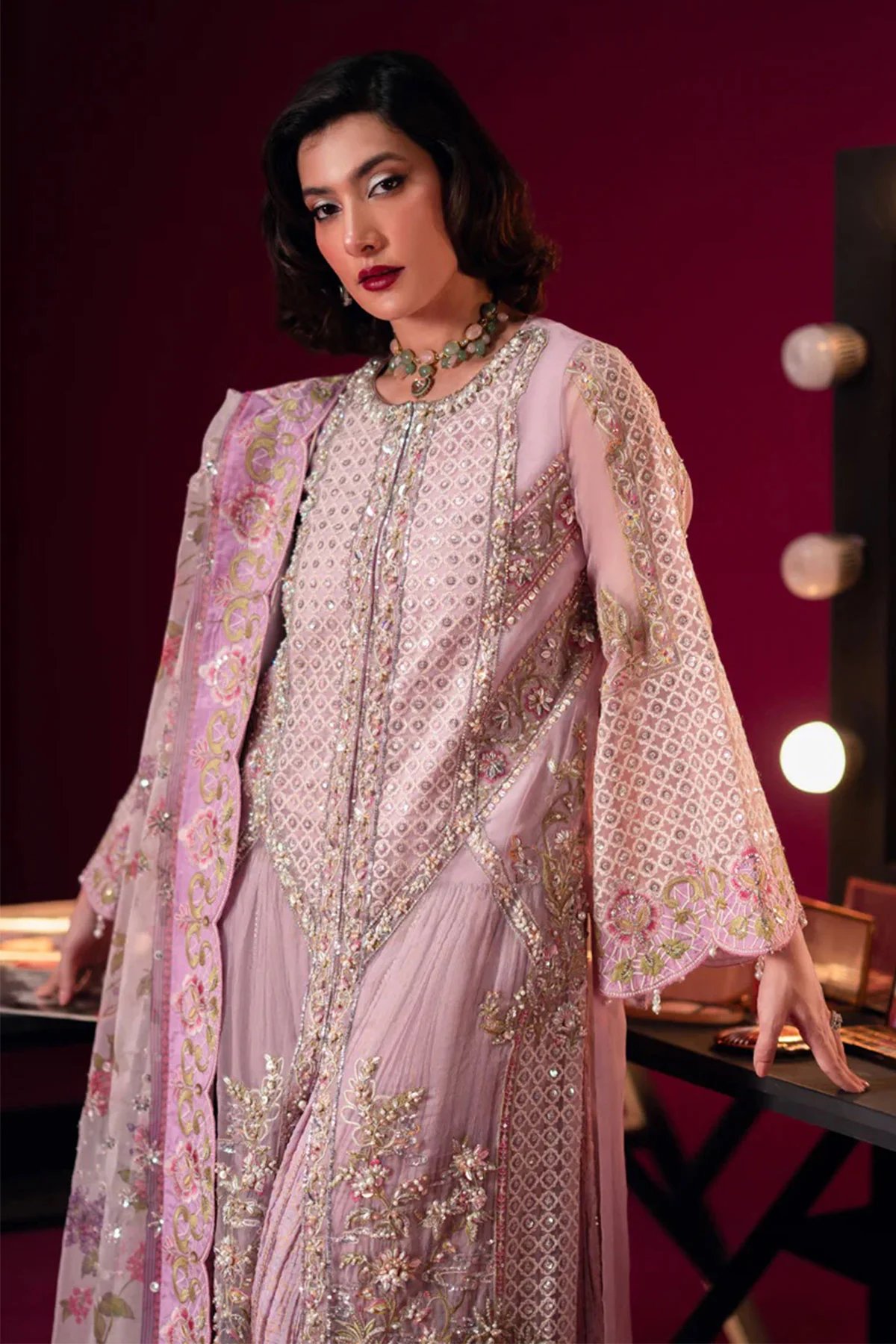 This beautiful Tana Bana collection features a straight long length open style organza shirt with embroidered side panels featuring hand embellishments. It comes with full length embroidered sleeves and neckline for a refined touch ad well as a dyed viscose undershirt for comfort and coverage. Paired with a crushed sharara and the look is finished a printed organza dupatta with embroidered patti on all four sides, adding a graceful finish.