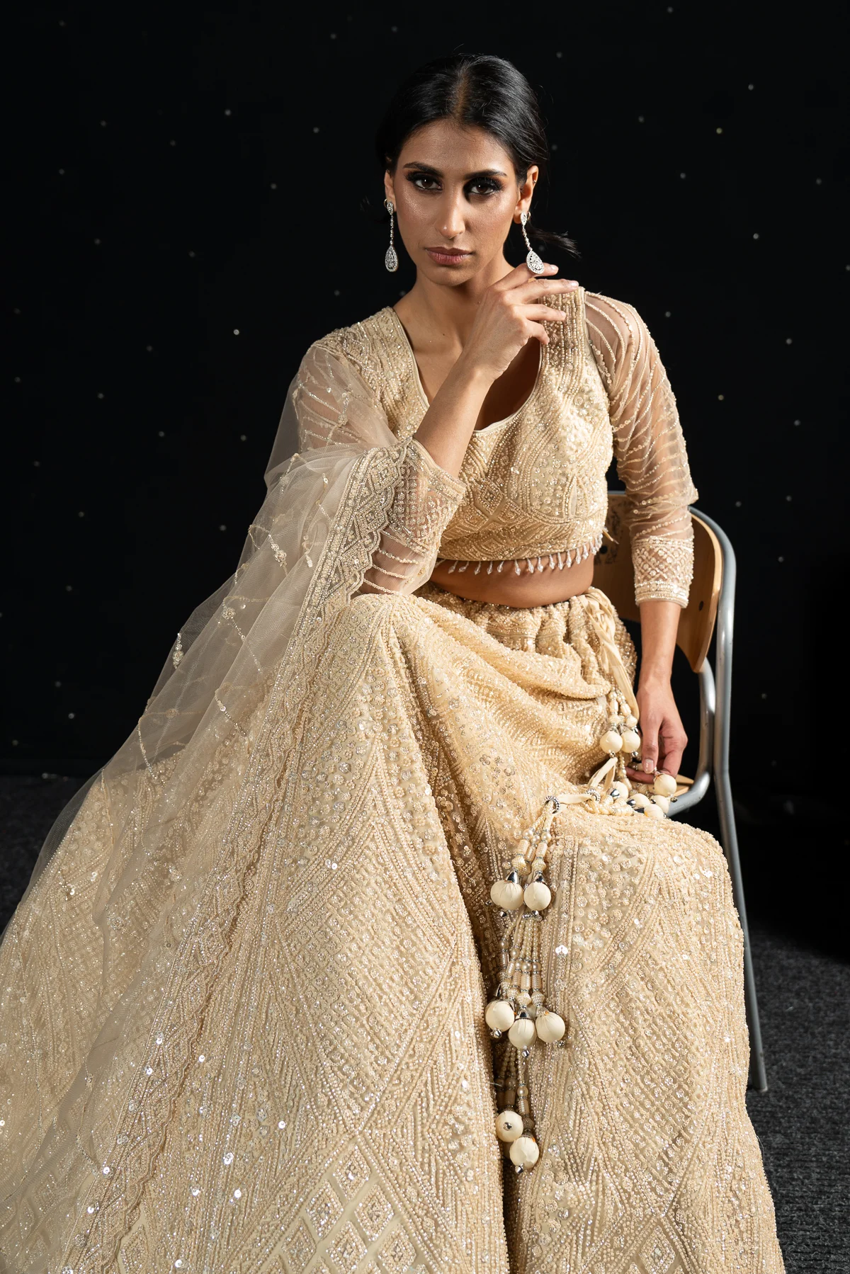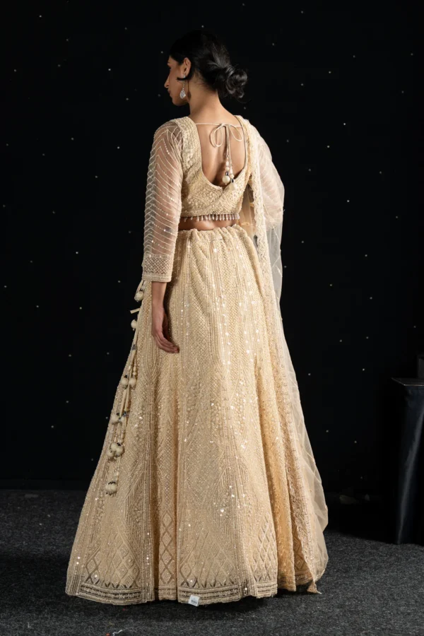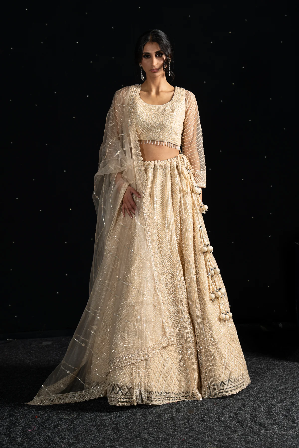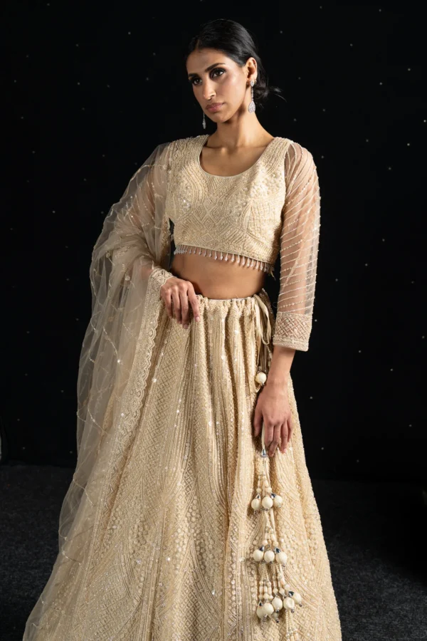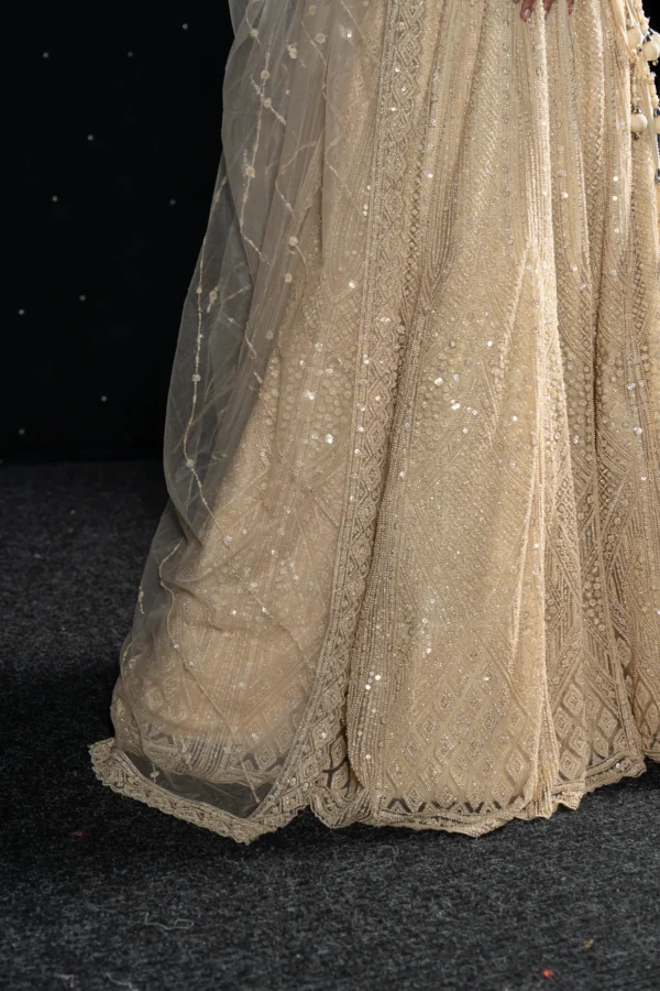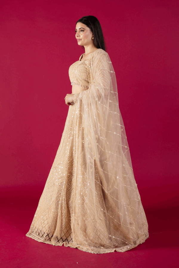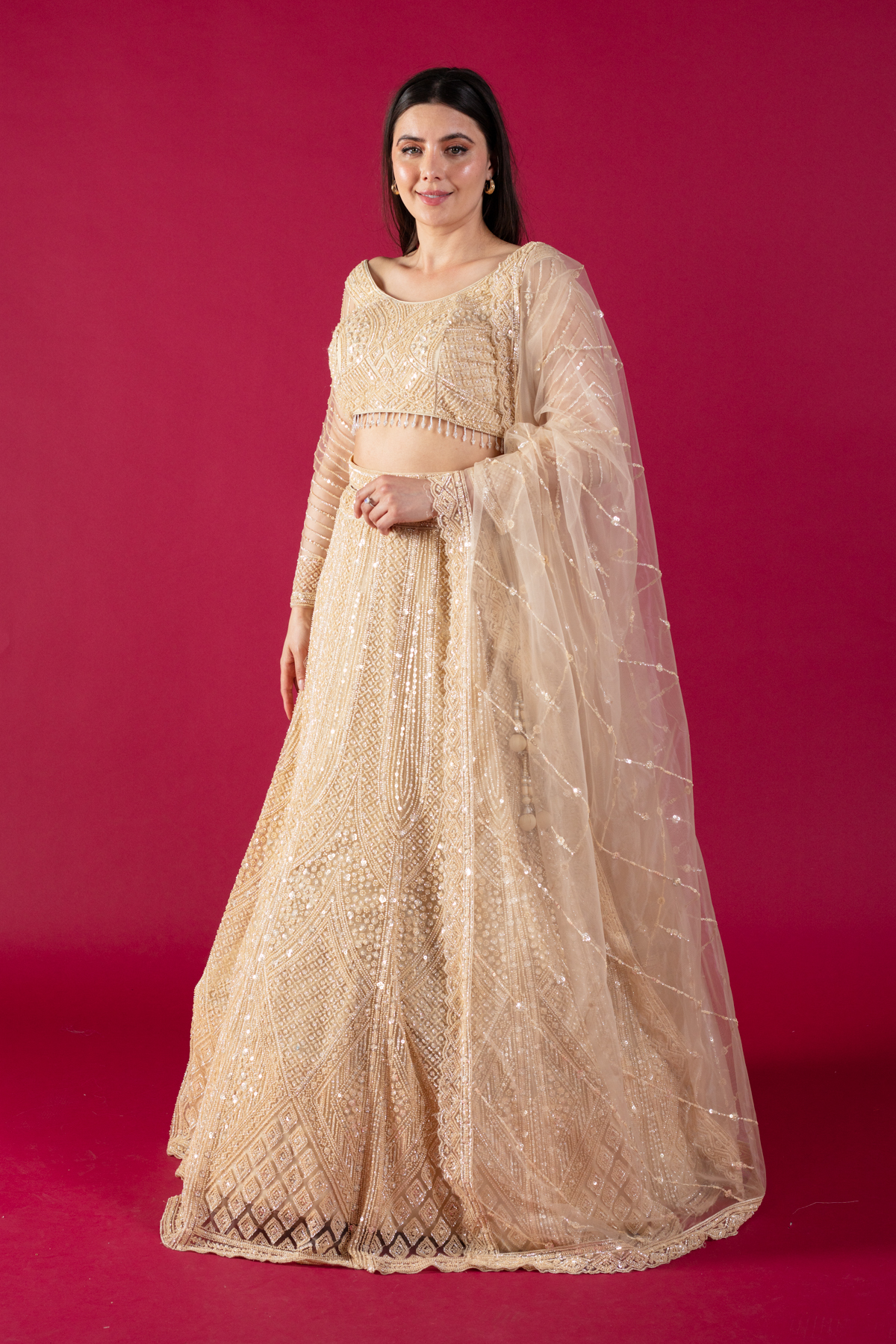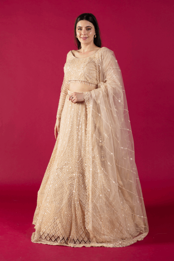 This beautiful 3-piece lehnga choli is crafted from premium net fabric, featuring exquisite threadwork and sparkling sequins. The net lehnga is adorned with intricate detailing, complementing the elegant net choli with its delicate embellishments. The net dupatta completes the look, adding a touch of timeless grace and luxury. Perfect for making a statement at any special occasion.