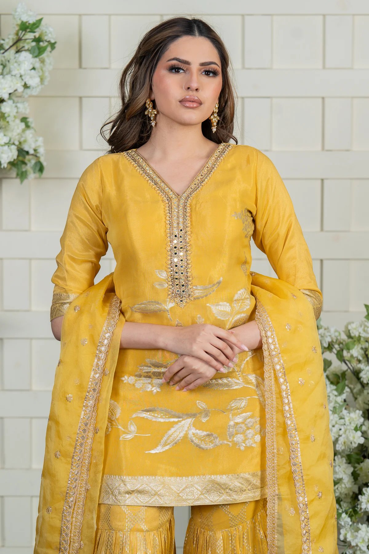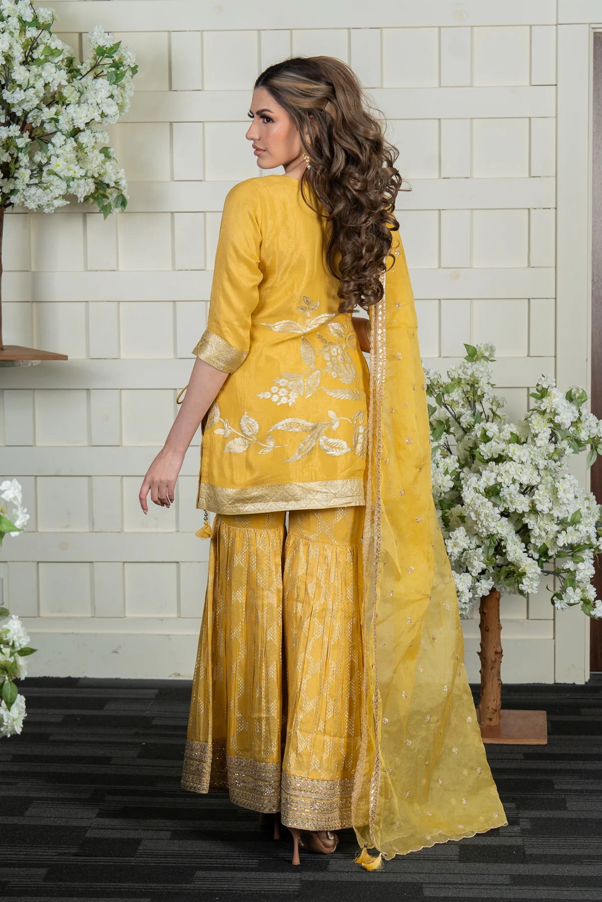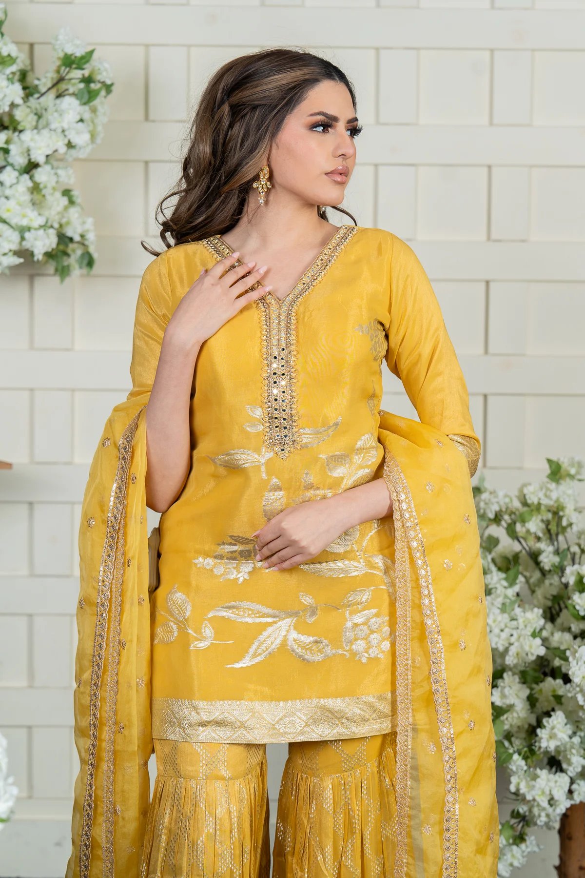 This beautiful 3-piece gharara set is perfect for any festive occasion. The raw silk shirt has a simple yet elegant design with delicate work around the neckline. The matching raw silk gharara features a subtle printed pattern, giving it a stylish touch. Paired with a soft organza dupatta, this outfit is lightweight, comfortable, and effortlessly classy.