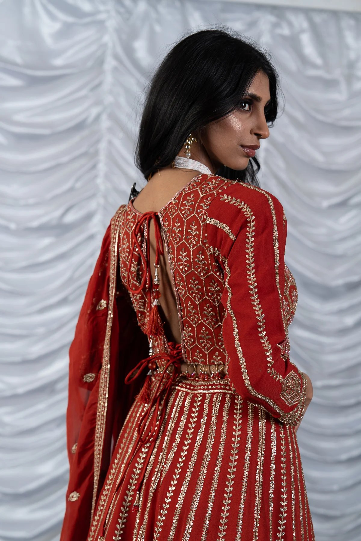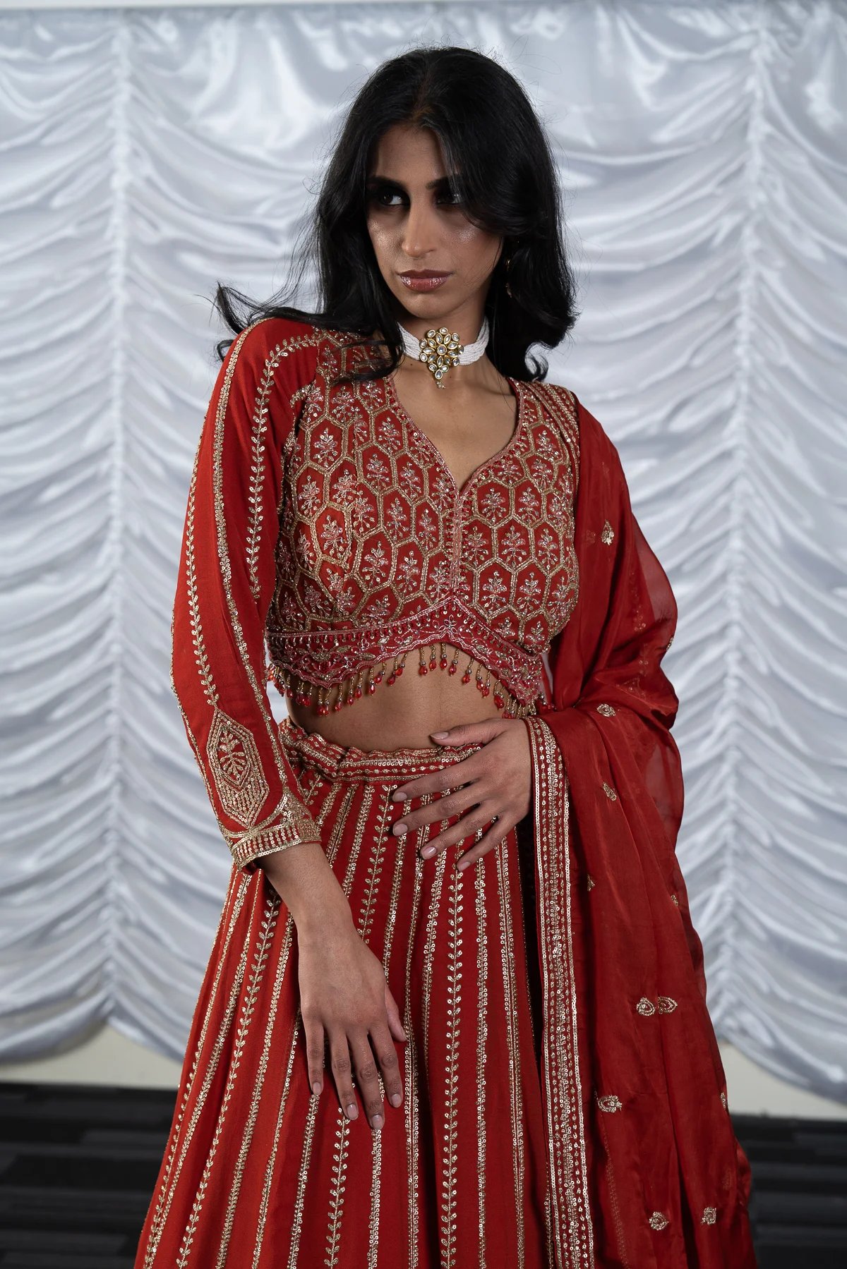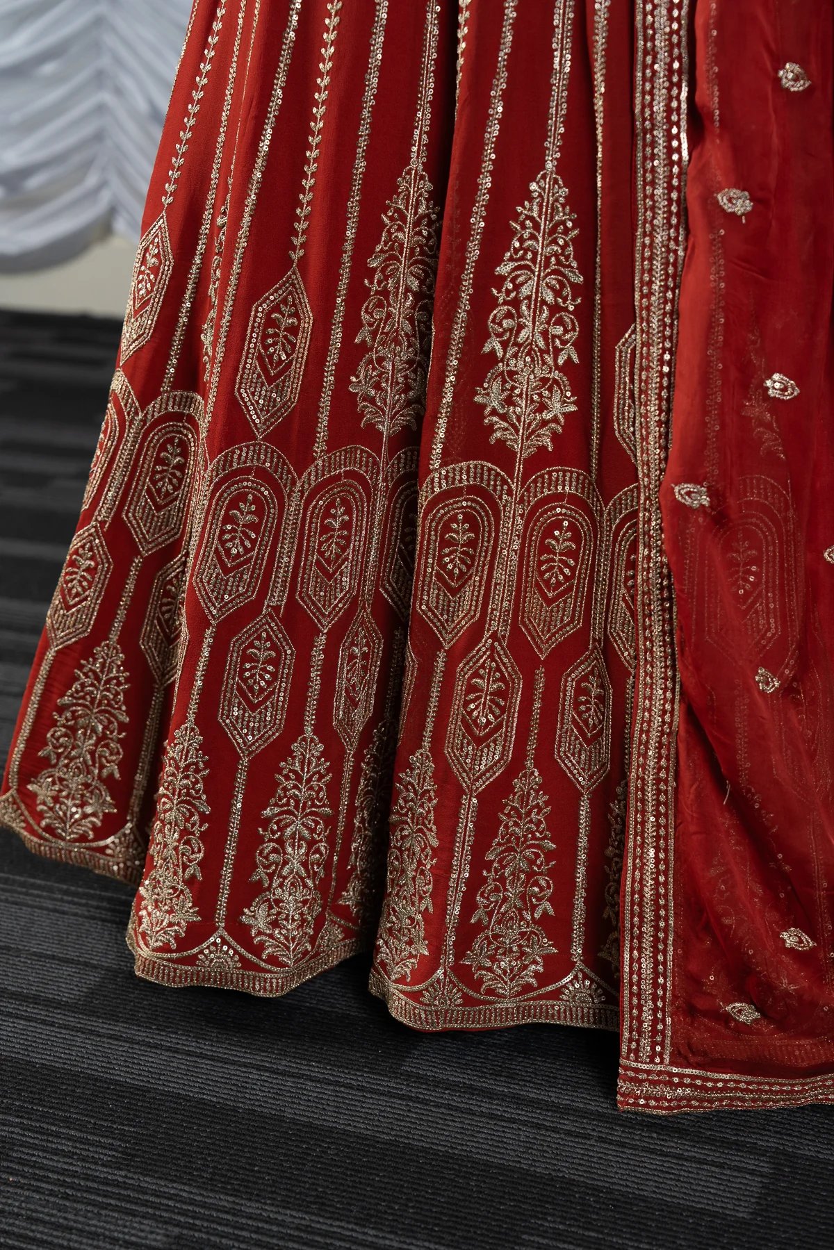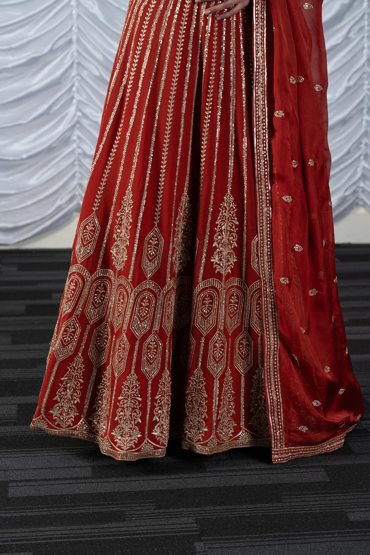 This beautiful 3 piece lengha choli features an elegant combination of intricate threadwork and premium georgette fabric, making it a timeless choice for any special occasion. The choli showcases exquisite embroidery with a flattering design that adds a touch of elegance to the ensemble. The lehenga is adorned with delicate embroidered patterns that cascade down its flare, exuding grace and charm. Completing the look is a soft georgette dupatta, accented with subtle embroidery and finished with elegant tassels along the edges.