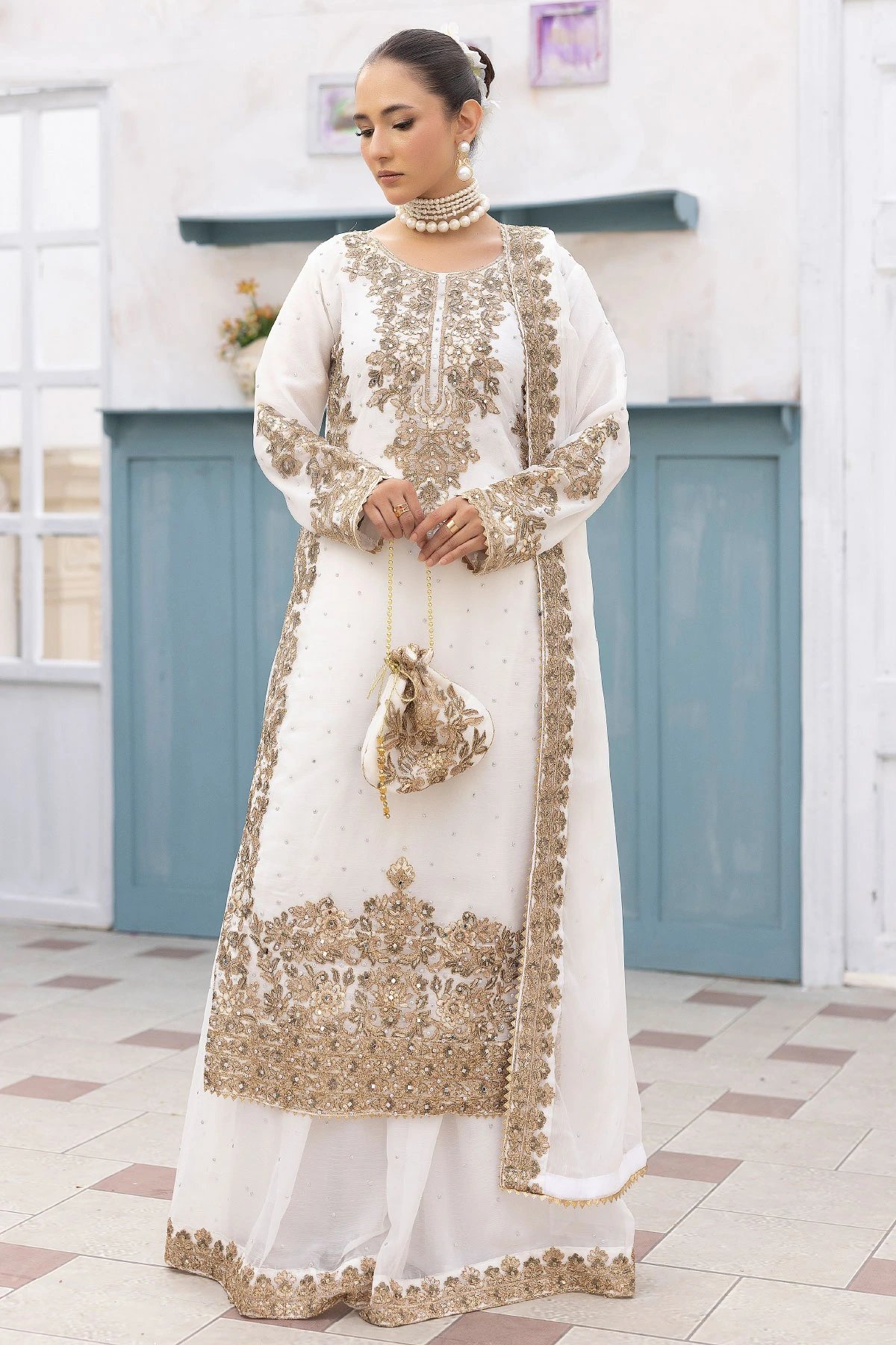 This beautiful 3 piece chiffon suit features a straight shirt with luxury dori work embroidery throughout with scattered diamantés, finished with full length embroidered sleeves. Paired with an embroidered chiffon sharara and the look is finished with a chiffon dupatta with an embroidered border. Potli embroidered is also included to enhance the attire.