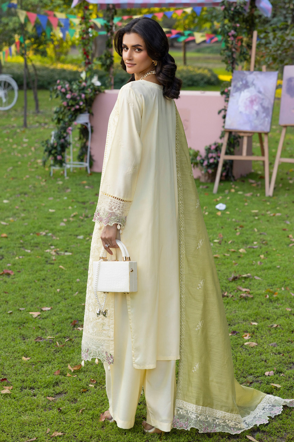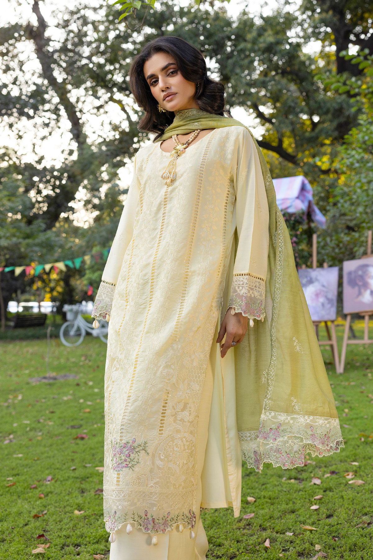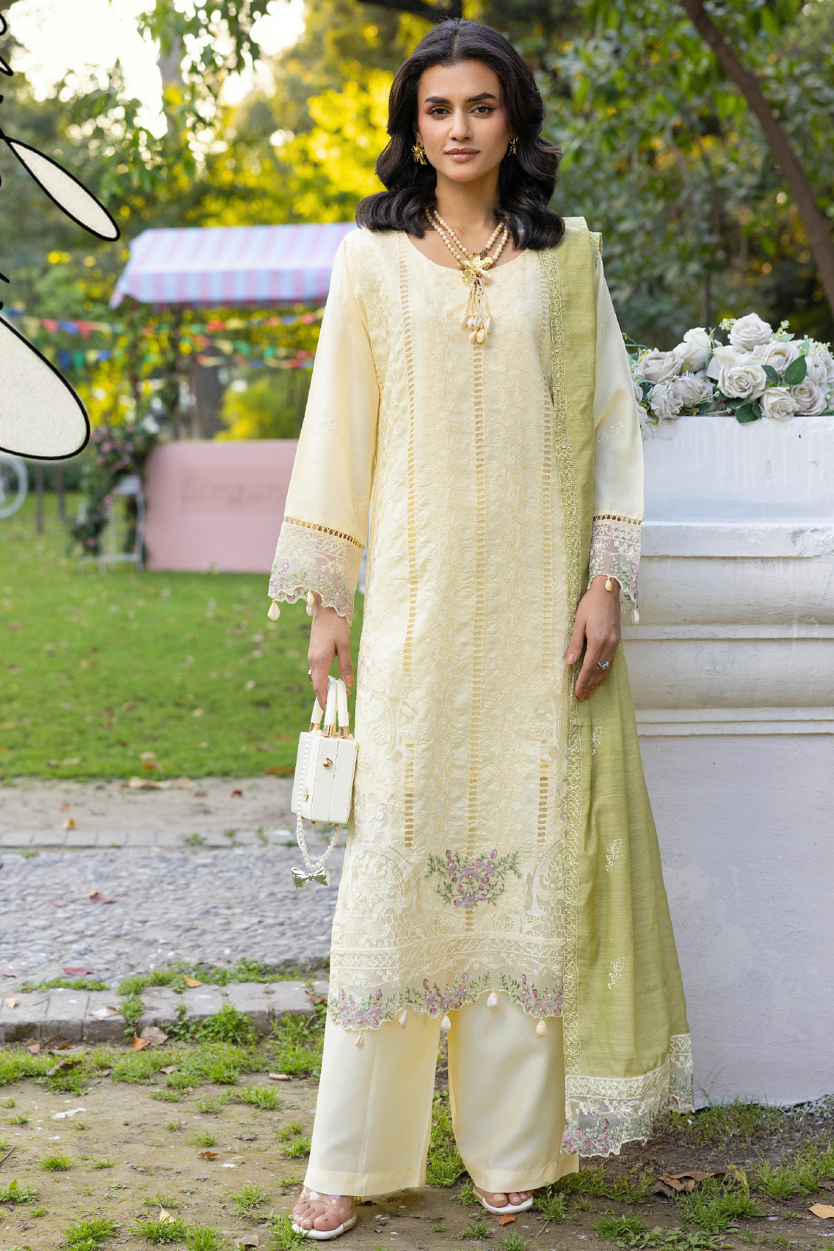 This beautiful 3 piece viscose collection features a straight chikan kari embroidered shirt with luxury thread work embroidery finished with dangling beads on the border, with full length embroidered sleeves. Paired with straight leg viscose trousers. The look is finished with a Khadi net embroidered dupatta. Perfect casual collection for Eid.