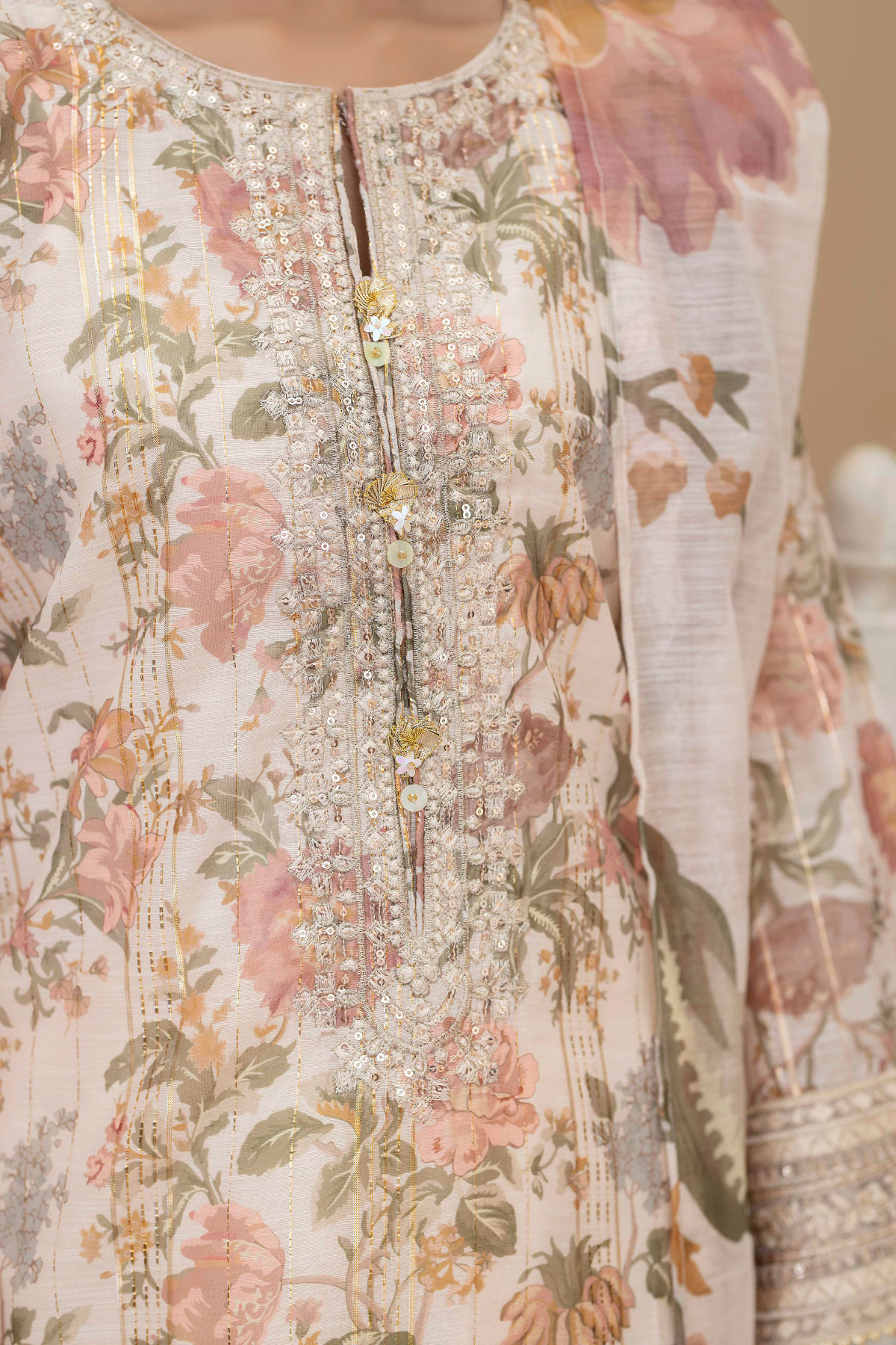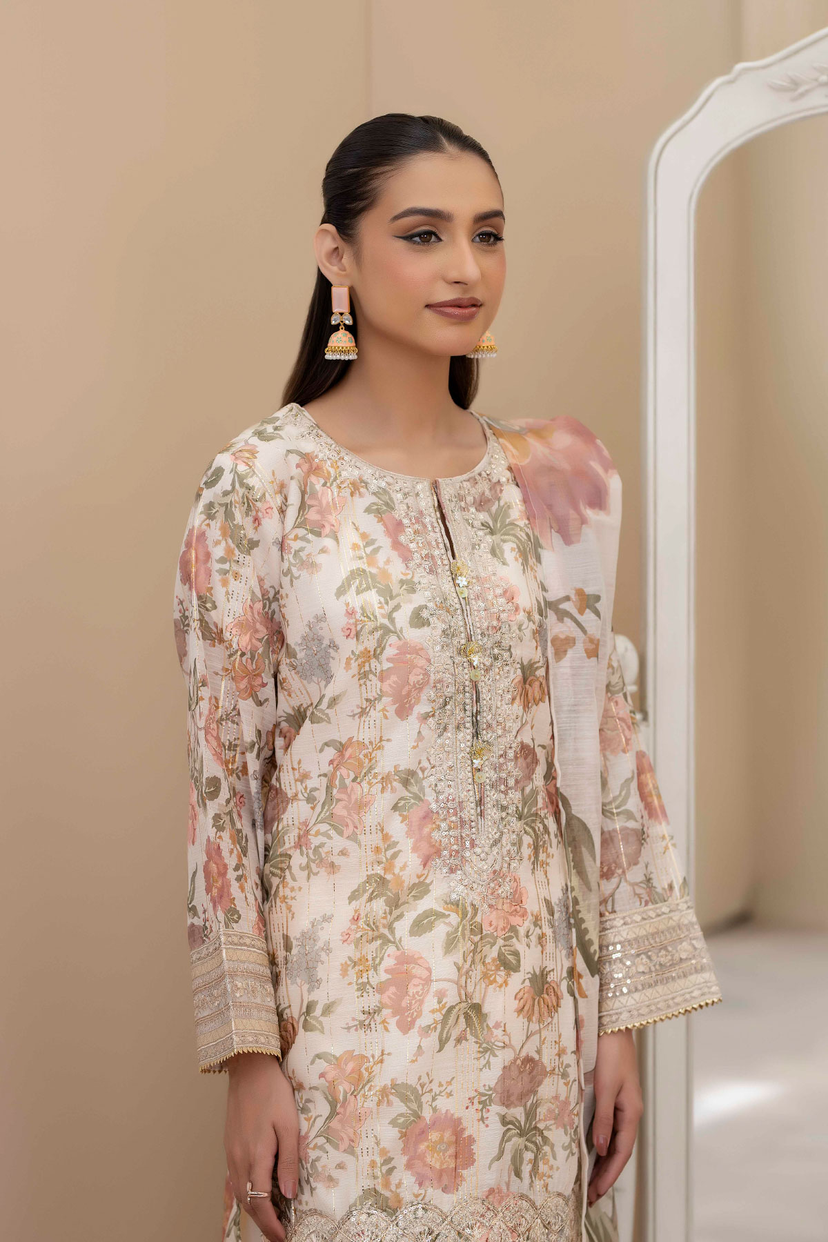 This beautiful Elle collection 3 piece suit features a straight digital printed shirt with bead embellishment on the front and thread work embroidered border, finished with full length embroidered sleeves. Paired with a flared shalwar and the look is finished with a digital printed dupatta. Perfect casual collection for this Eid season.
