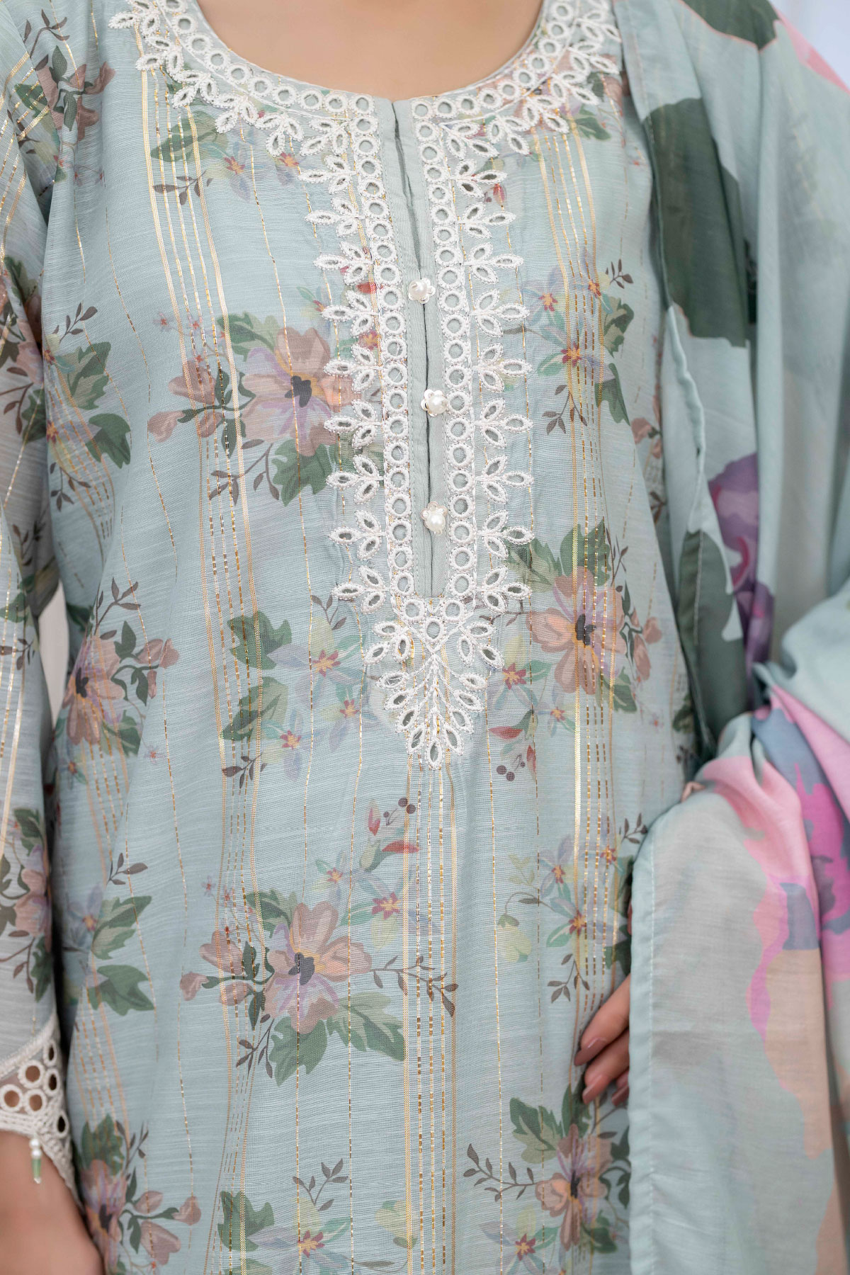 This beautiful Elle collection 3 piece suit features a straight digital printed shirt with thread work embroidery on the front and border, finished with full length embroidered sleeves. Paired with a tulip shalwar and the look is finished with a digital printed dupatta. Perfect casual collection for this Eid season.