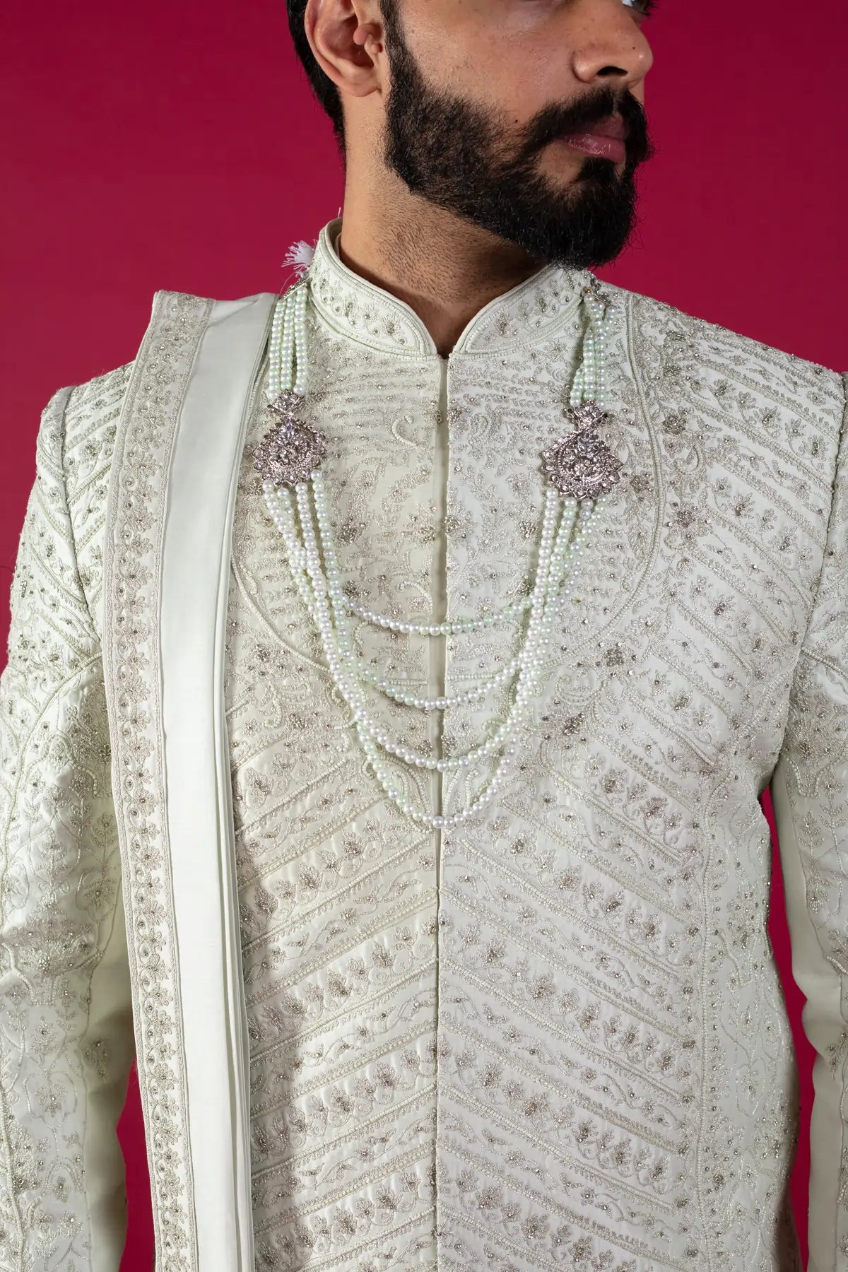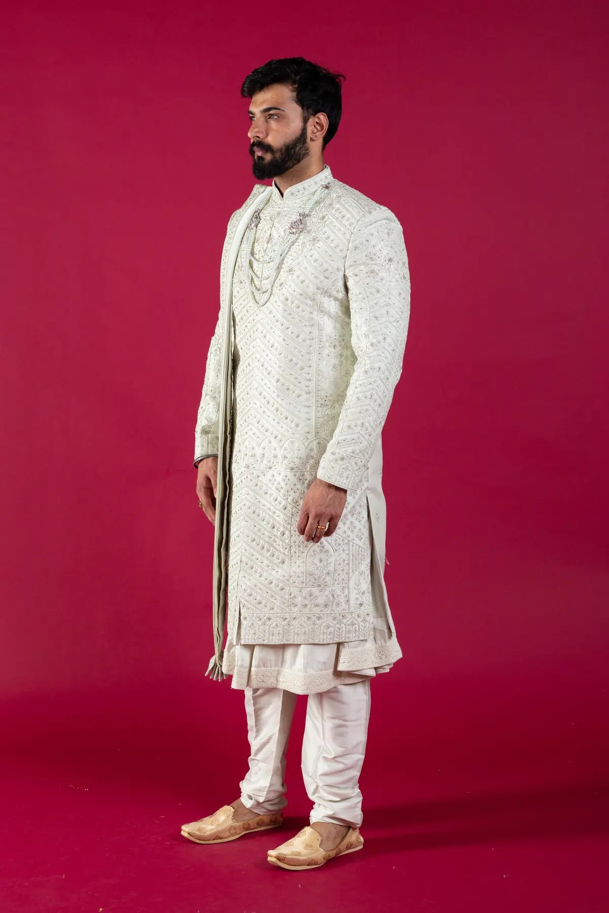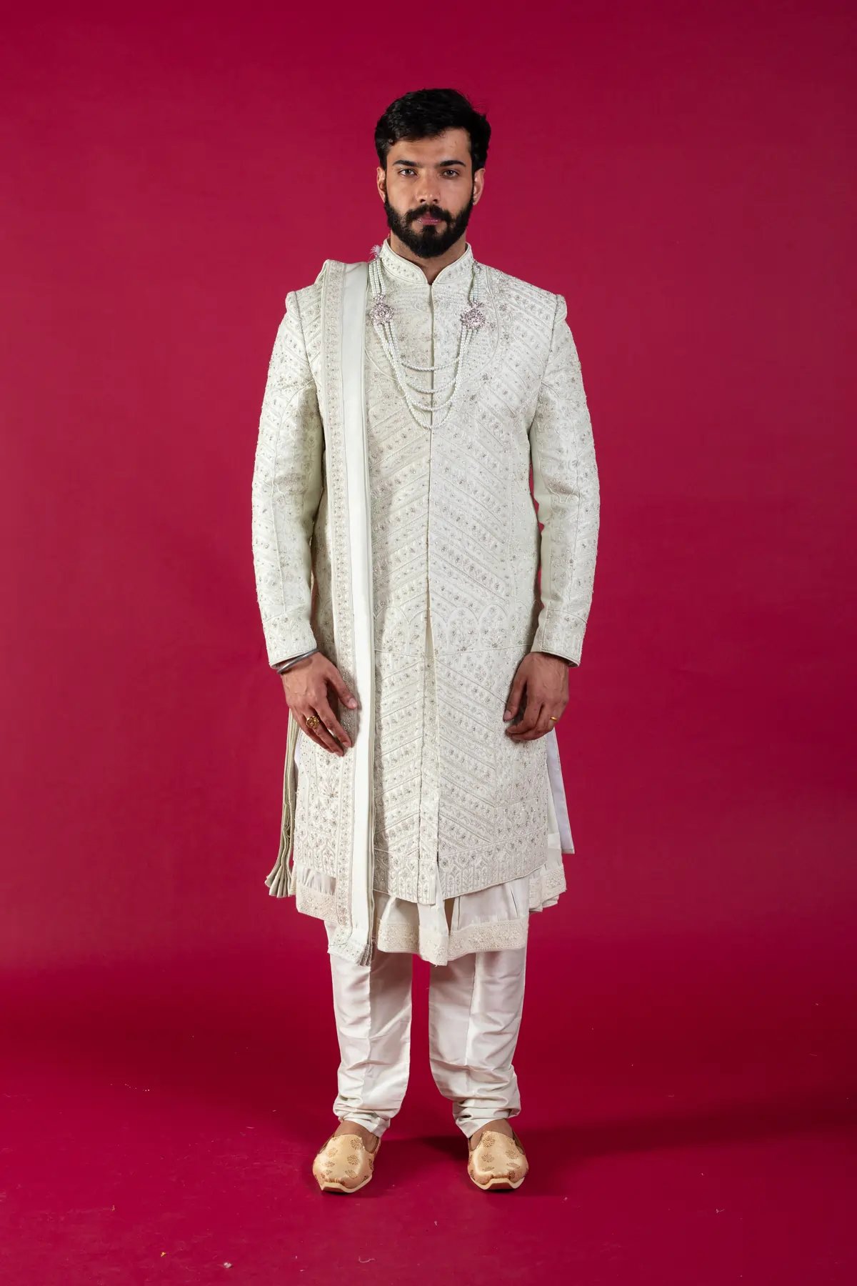 Elevate your presence with our imperial embroidered sherwani set for men. Crafted with exquisite imperial embroidery and enhanced with subtle sequin work, this sherwani exudes royal elegance and timeless charm. Styled with a peplum style inner layer and an embroidered dupatta. Pair it with a contrasting churidar and pearl embroidered maala complete the look, ensuring you stand out in elegance while embracing a modern take on classic heritage.