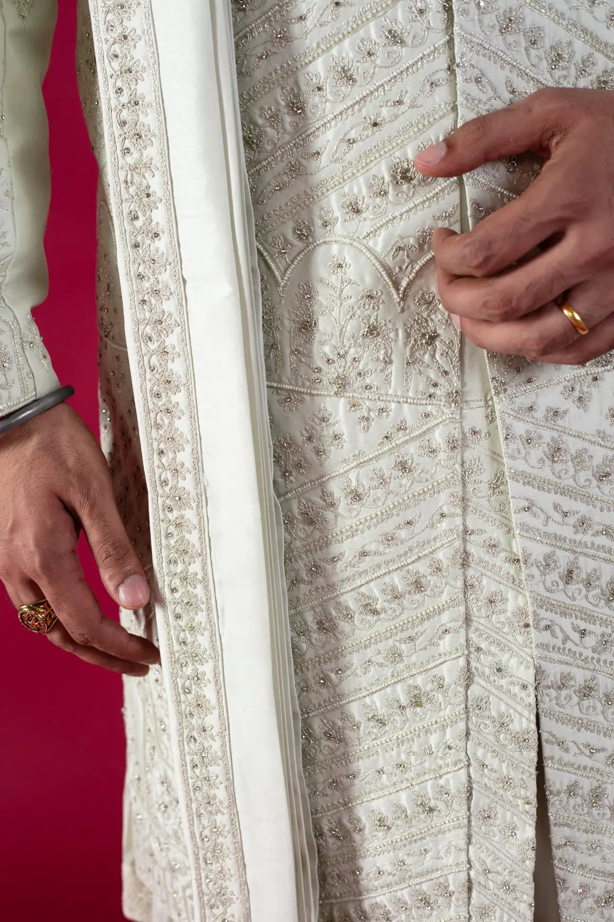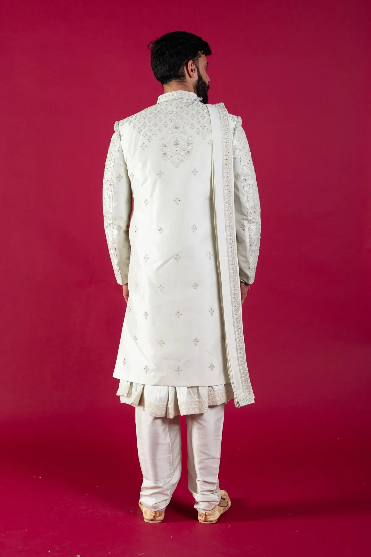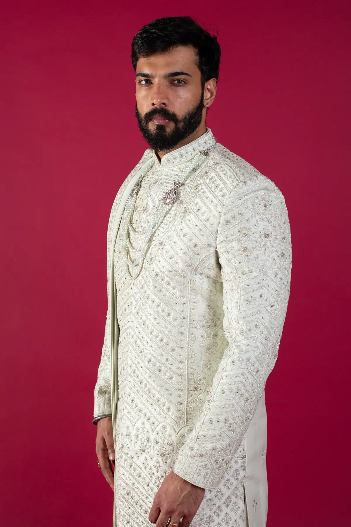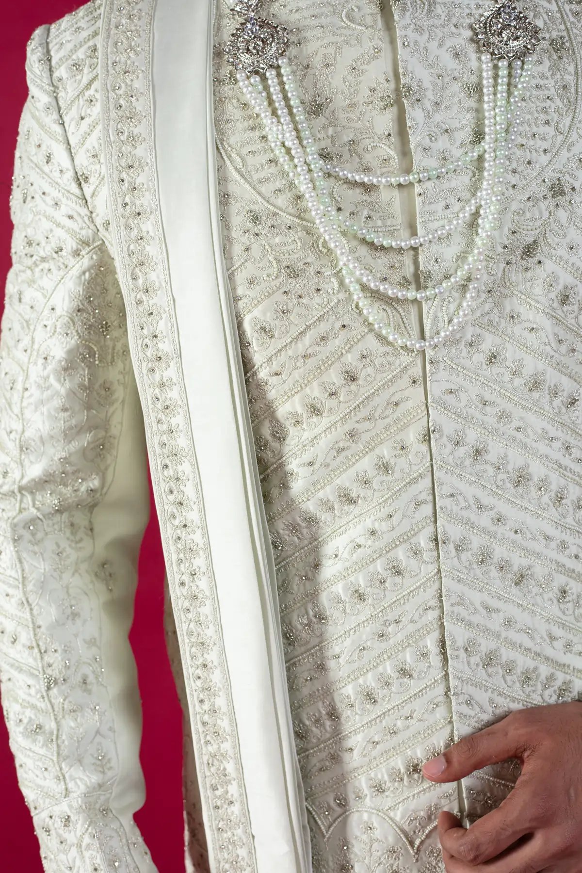Elevate your presence with our imperial embroidered sherwani set for men. Crafted with exquisite imperial embroidery and enhanced with subtle sequin work, this sherwani exudes royal elegance and timeless charm. Styled with a peplum style inner layer and an embroidered dupatta. Pair it with a contrasting churidar and pearl embroidered maala complete the look, ensuring you stand out in elegance while embracing a modern take on classic heritage.