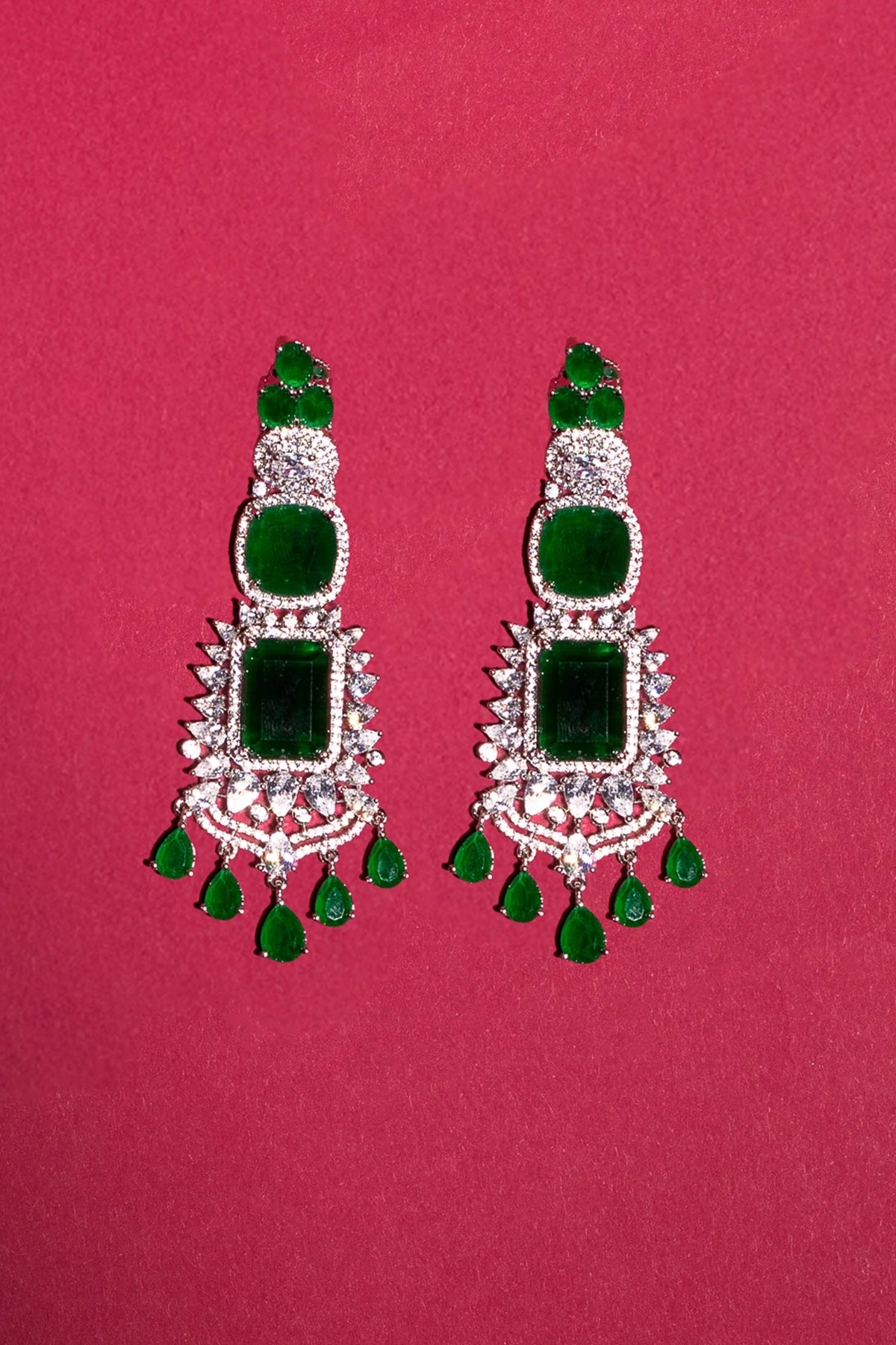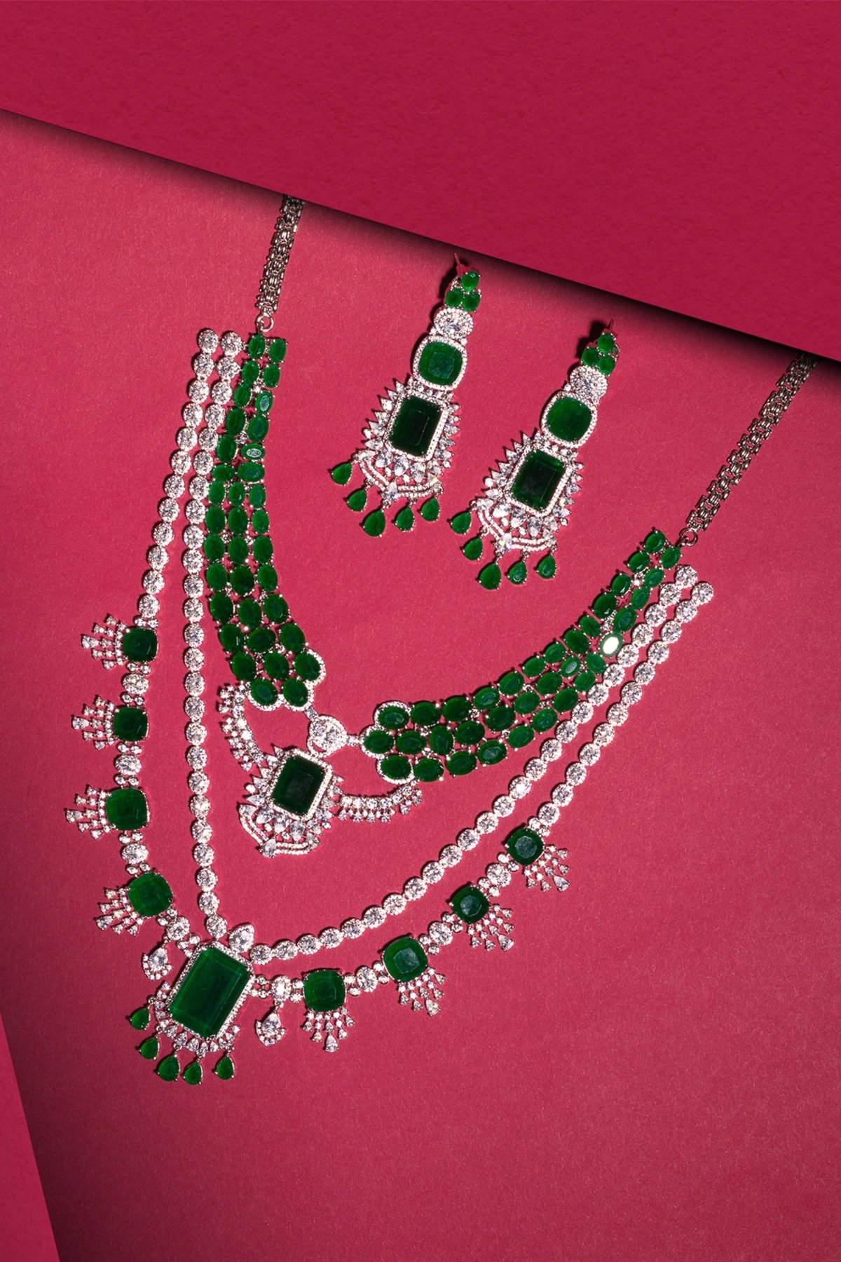 A statement in timeless grandeur. This handcrafted necklace and earring set features a regal arrangement of deep green emerald‑tone stones framed with shimmering polki style crystals. The multi‑layered necklace drapes elegantly across the neckline, blending rectangular and teardrop motifs for a rich, symmetrical silhouette. Matching earrings complete the look with graceful movement and refined sparkle.