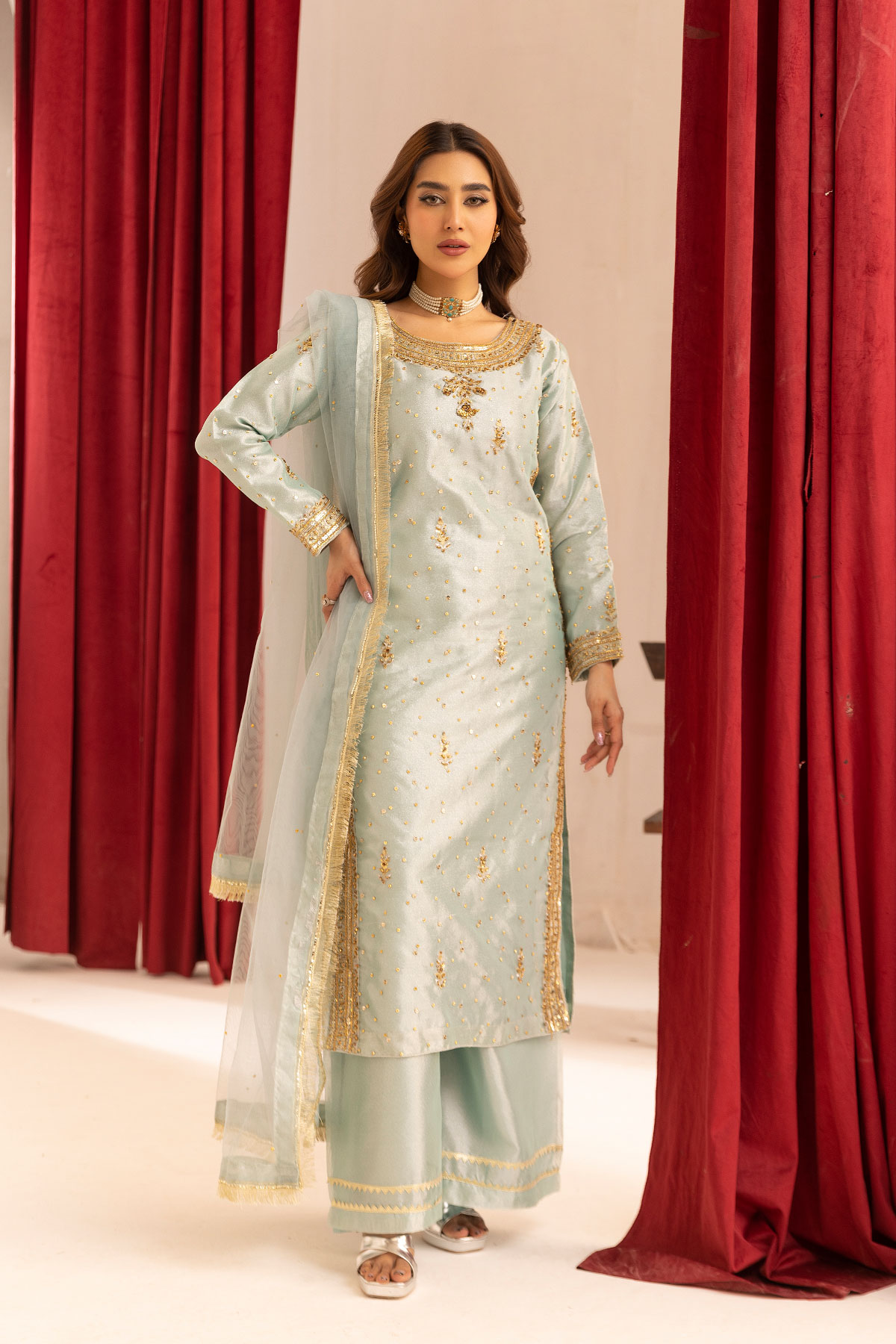 This beautiful 3 piece Hussain rehar inspired suit features a raw silk straight shirt with luxury dori work embroidery through out the front with scattered gold diamantés, finished with full length embroidered sleeves. Paired with wide leg plazo trousers with gotta patti lace on the borders. The look is finished with an organza embroidered dupatta.