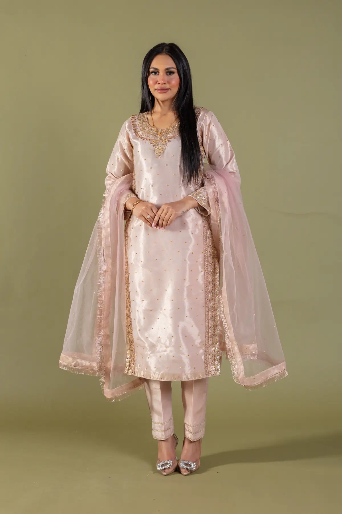 This beautiful 3 piece Hussain rehar inspired suit features a raw silk straight shirt with luxury dori work embroidery on the front with scattered gold diamantés, finished with full length embroidered sleeves. Paired with straight leg trousers with gotta patti lace on the borders. The look is finished with an organza embroidered dupatta.