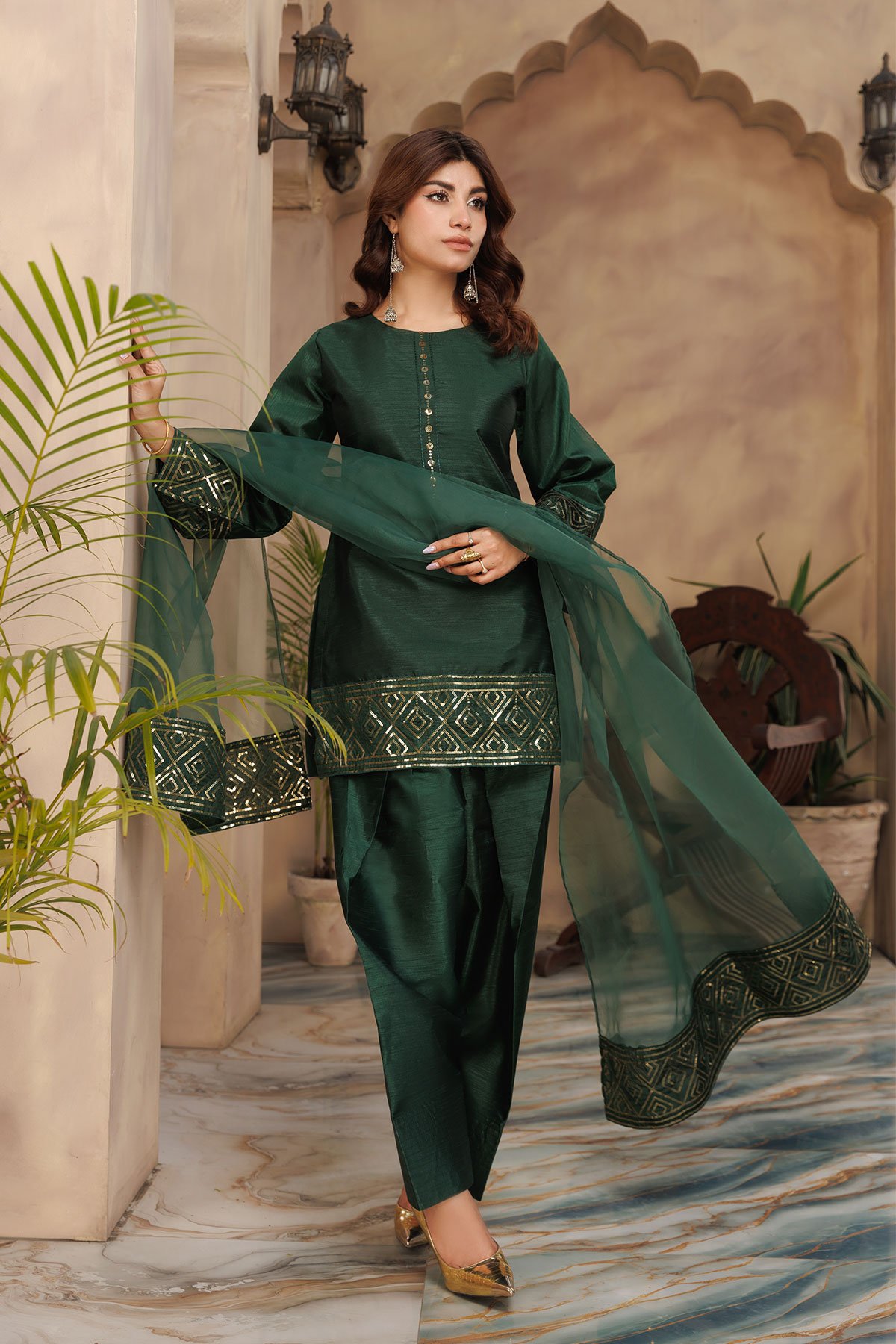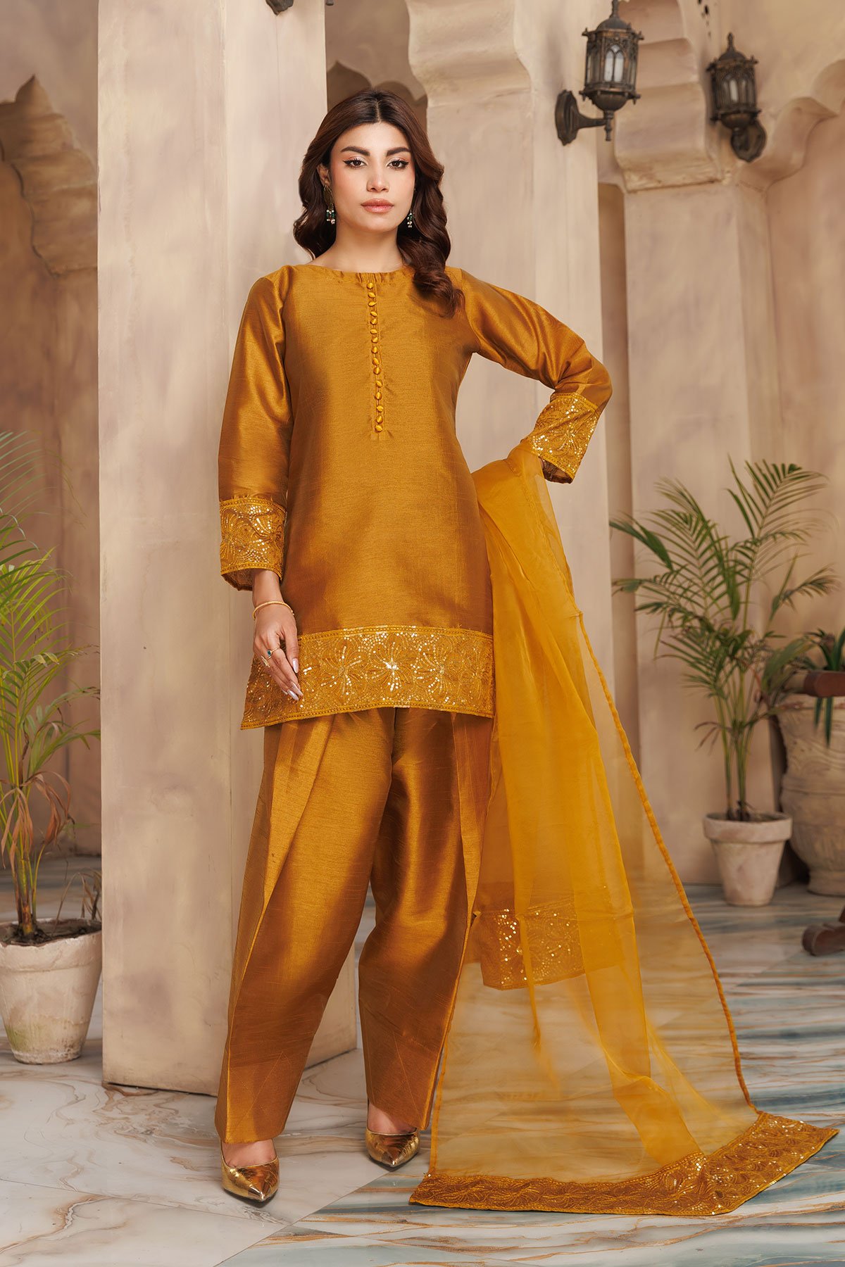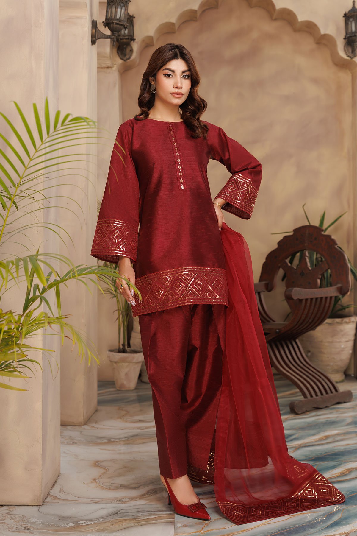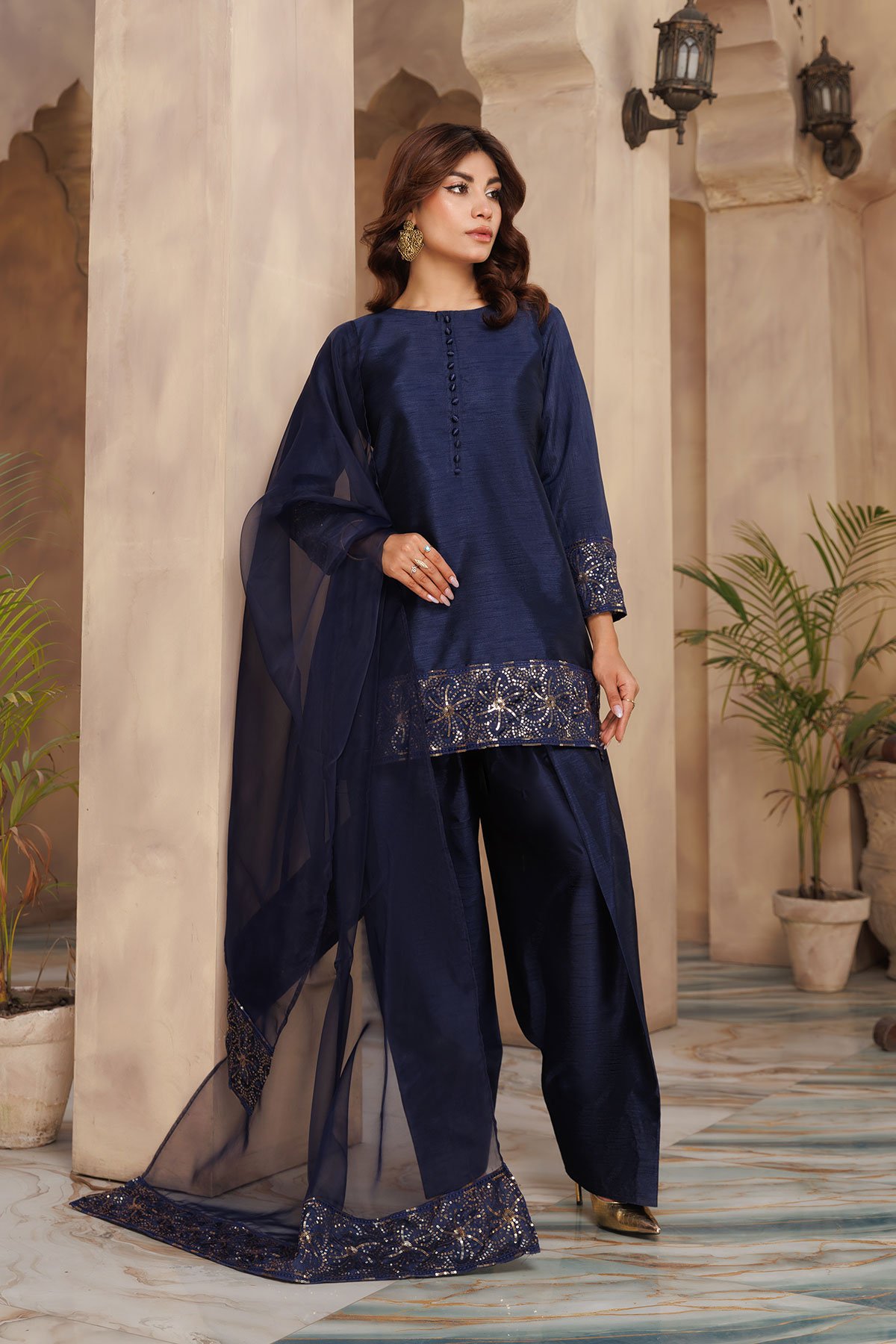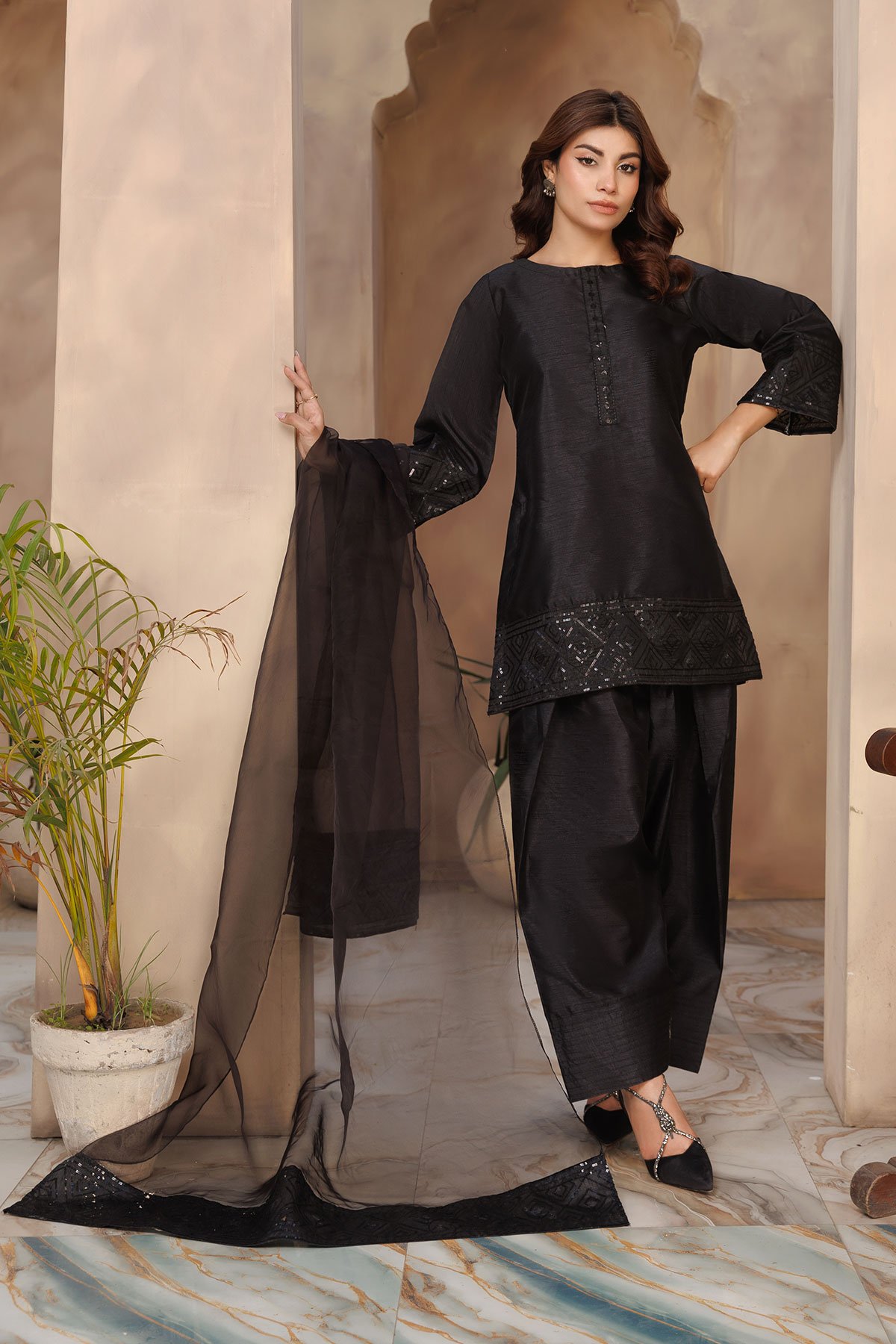 This beautiful Shiffonz 3-piece set is designed for effortless elegance, featuring a flowy straight-cut silhouette in rich silk. The kameez has delicate sequence embellishment along the neckline and border, finished with full length plain sleeves. Paired with a classic silk farshi shalwar for comfort and a lightweight organza dupatta with an embroidered sequence border. Easy to wear and perfect for Eid. Note: The neckline may vary in each colour, some colours have sequence embellishment at the front however some colours come with fabric wrapped button along the front.
