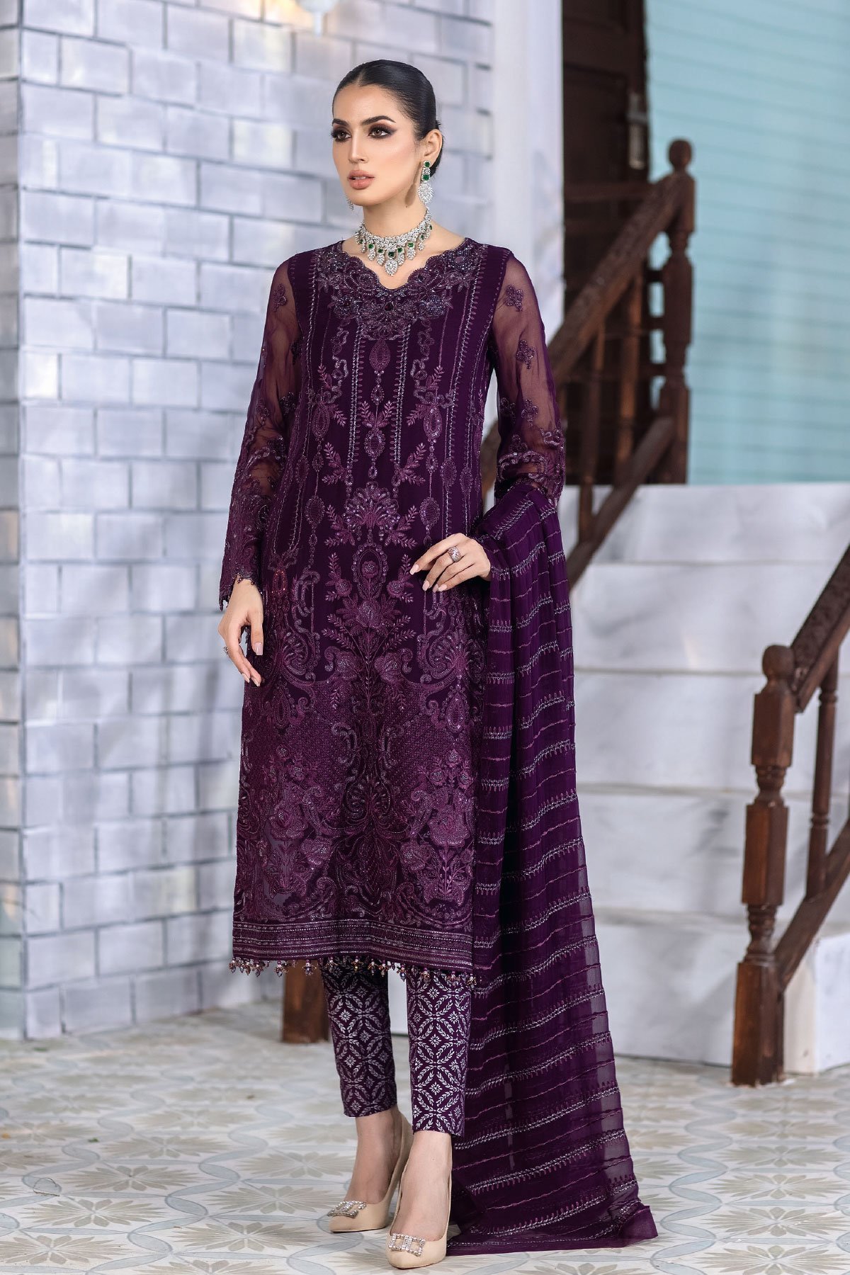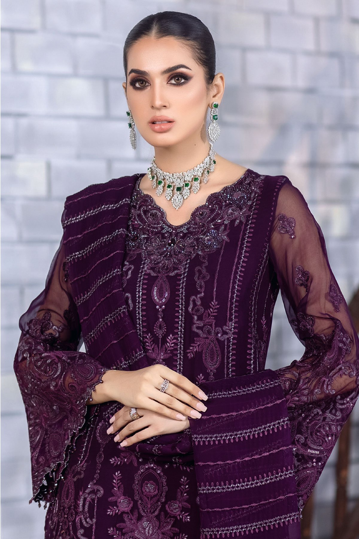 This beautiful pice chiffon suit features a straight shirt with luxury thread work embroidery throughout with scattered diamantes, finished with dangling beads from the border. It comes with full length embroidered sleeves and straight leg printed trousers. The look is finished with a chiffon embroidered dupatta.