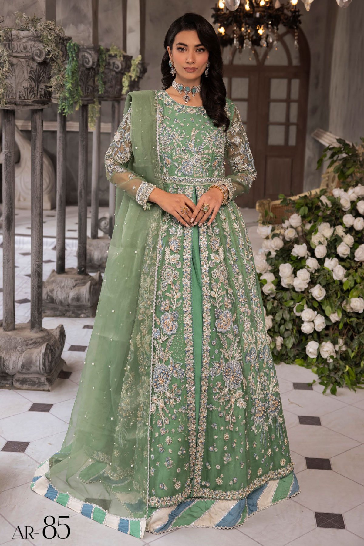 3 piece embroidered synthetic chiffon long dress