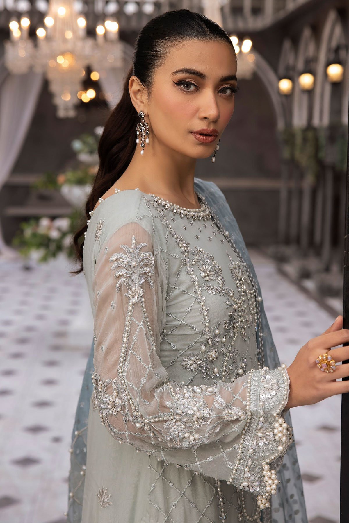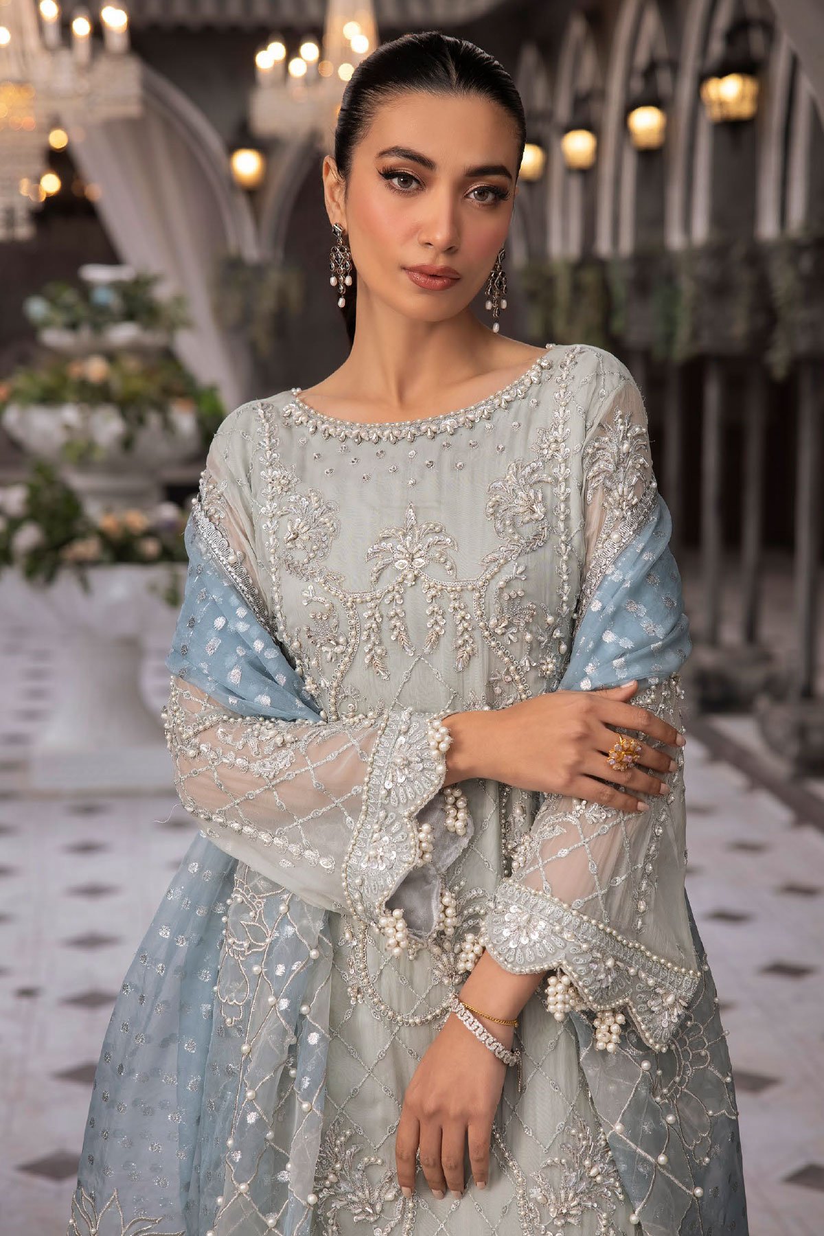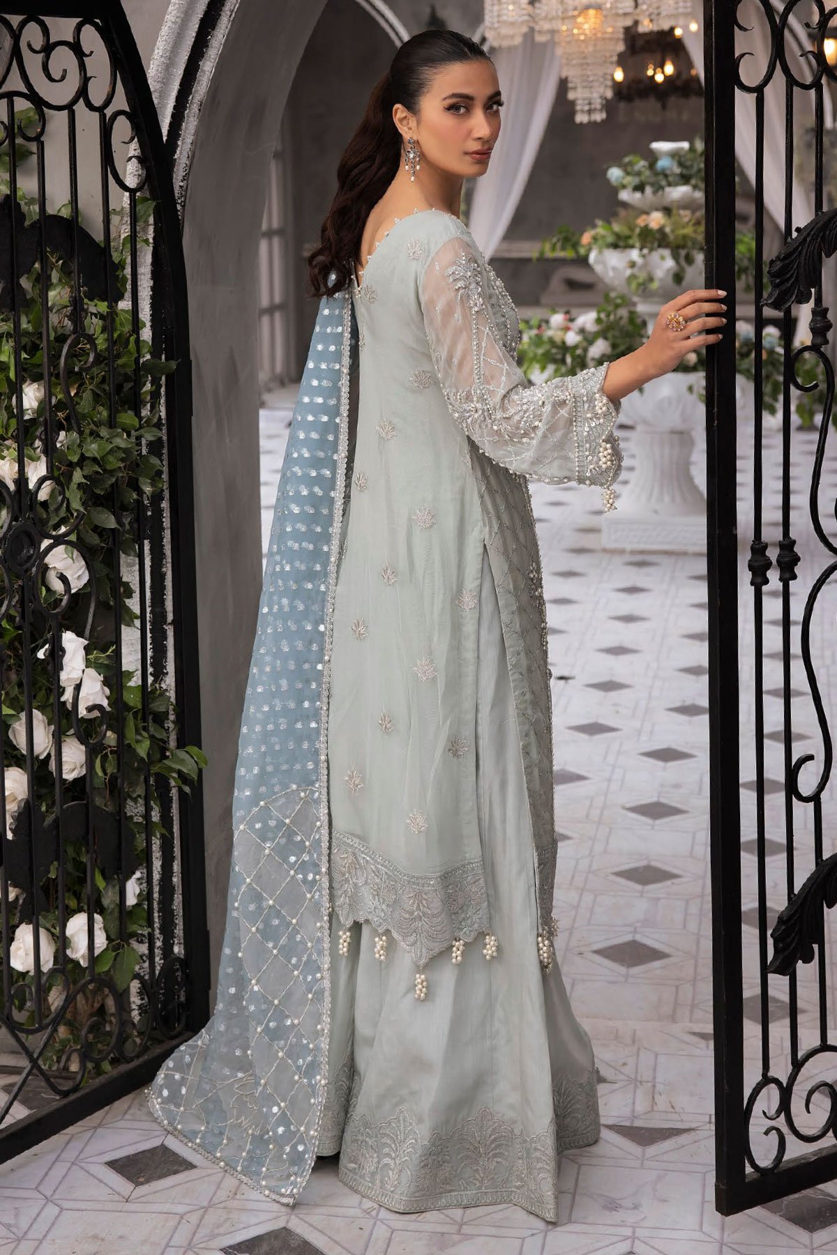 This beautiful 3 piece Esme collection suit features a straight organza shirt with bead and thread-work embellishments throughout, finished with full length embroidered sleeved with beaded tassels down the cuffs and border of the top. It comes with straight leg raw silk trousers and the look is finished with a contrasted printed organza dupatta which enhances the outfit.
