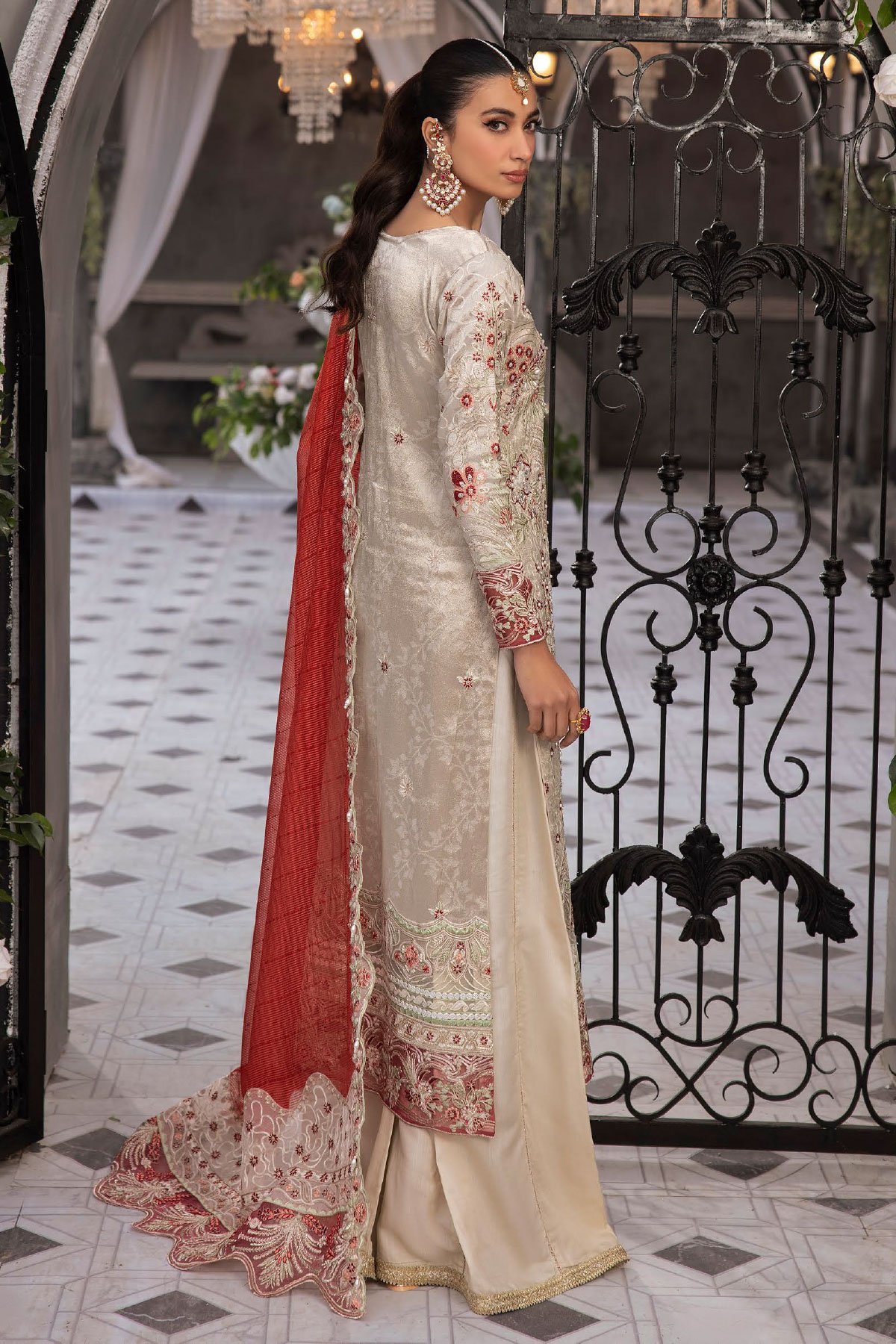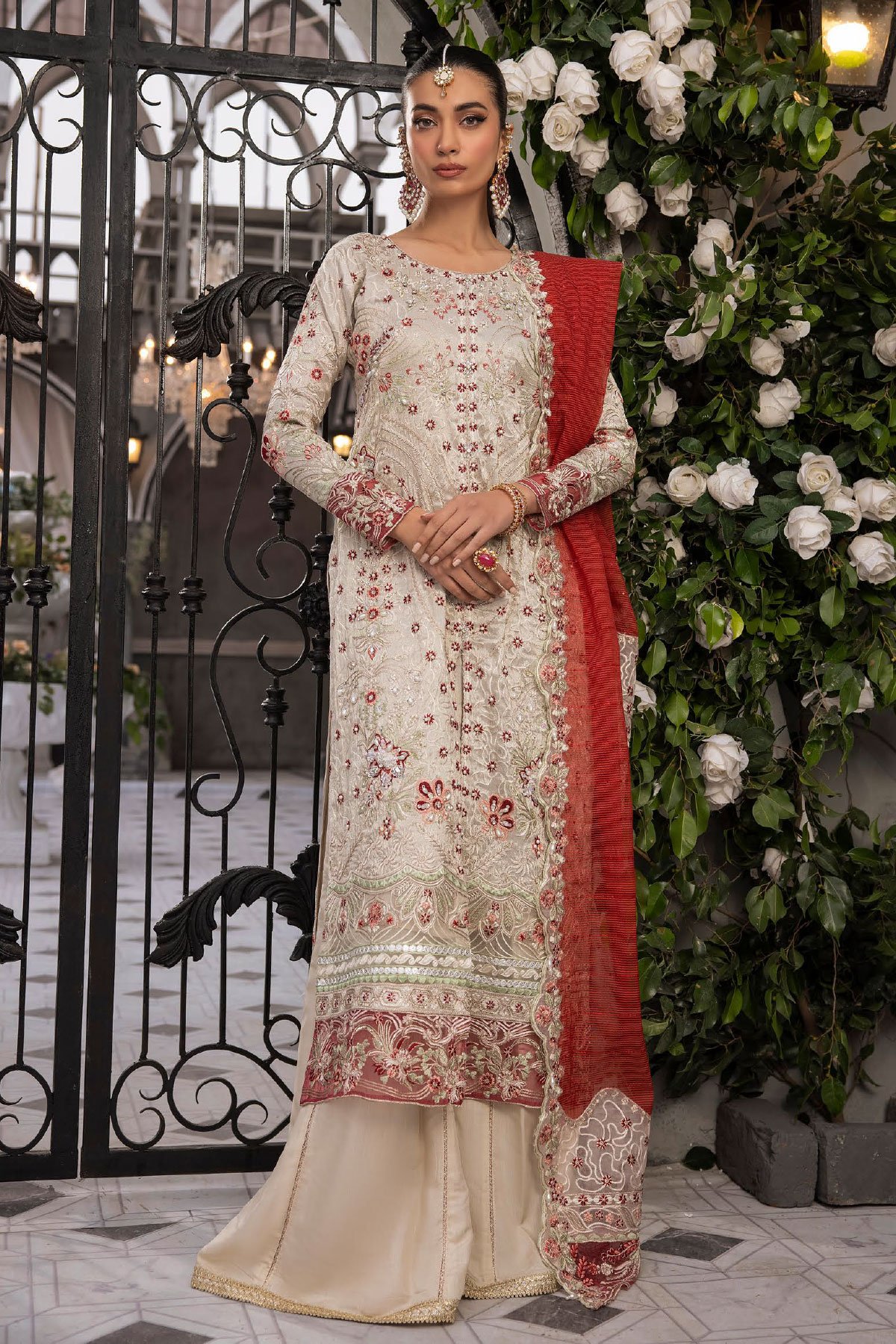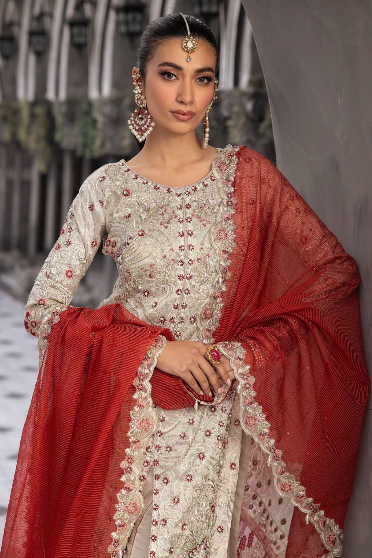 This beautiful 3 piece Esme collection suit features a long length straight shirt with luxury contrasted thread work embroidery along with sequence and bead embellishments, finished with full length embroidered sleeves. It comes with a banarsi sharara and the look is finished with a contrasted organza dupatta.