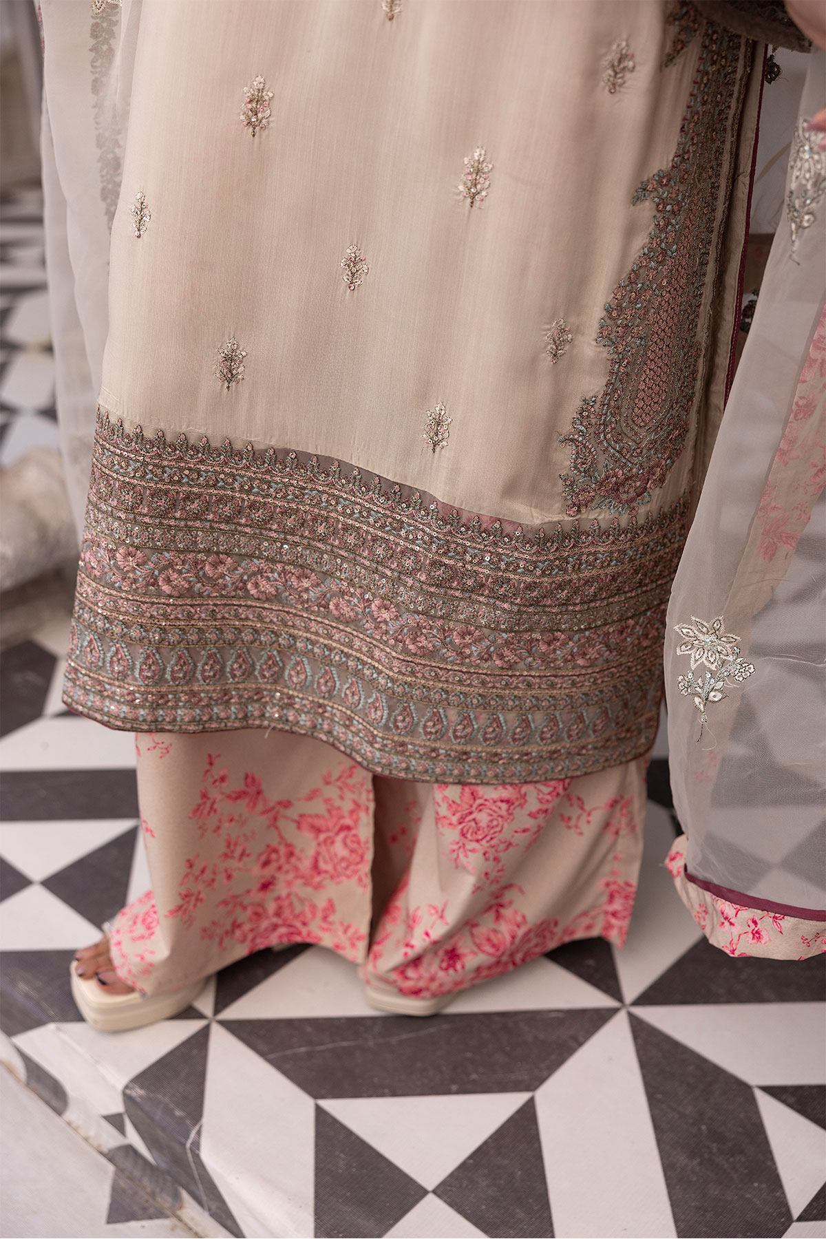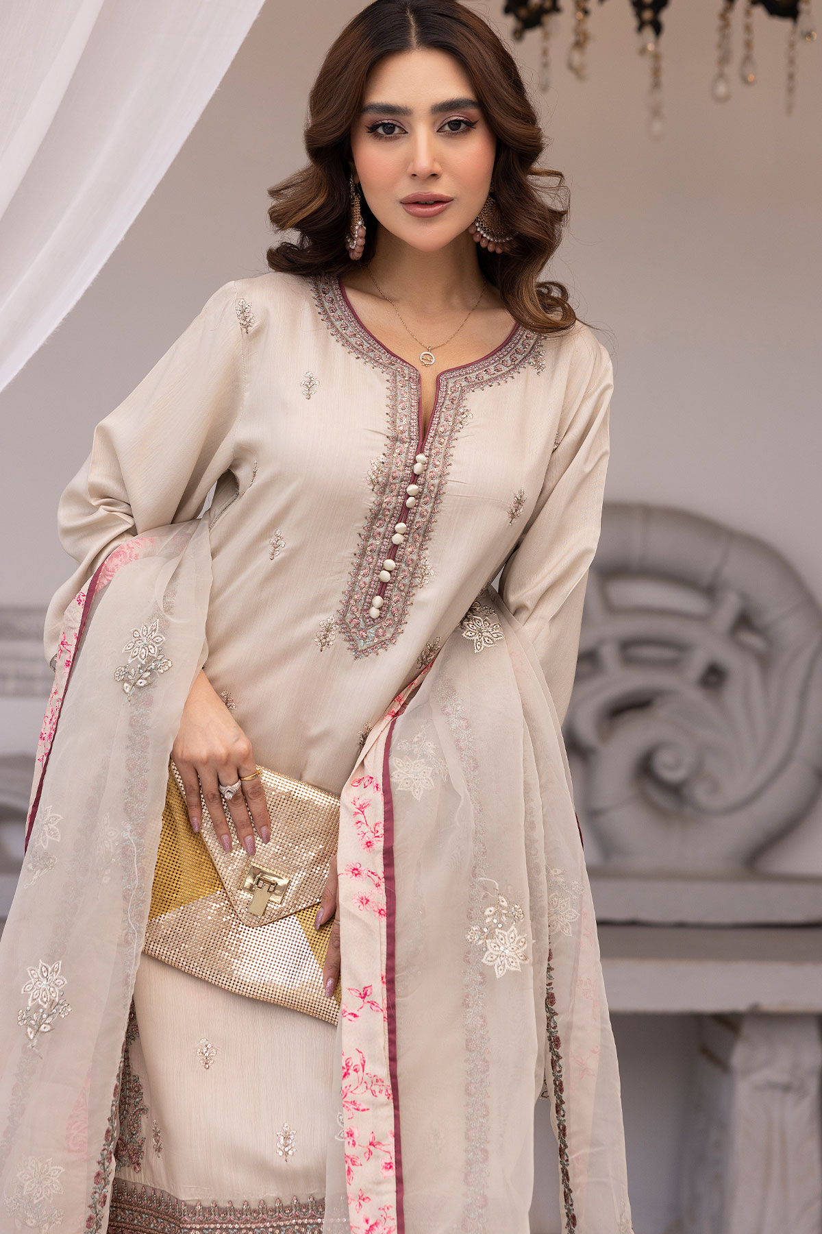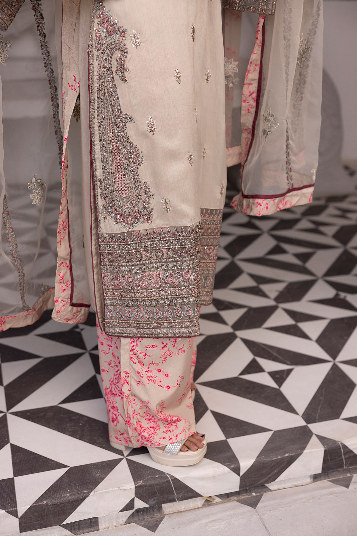 This beautiful 3 piece Ethnic collection features a straight embroidered shirt with fabric button embellishments on the front, finished with full length embroidered sleeves. Paired with printed plazo trousers. The look is finished with an embroidered organza dupatta with a printed four sided border. Casual luxury Eid collection to enhance comfort and elegance.
