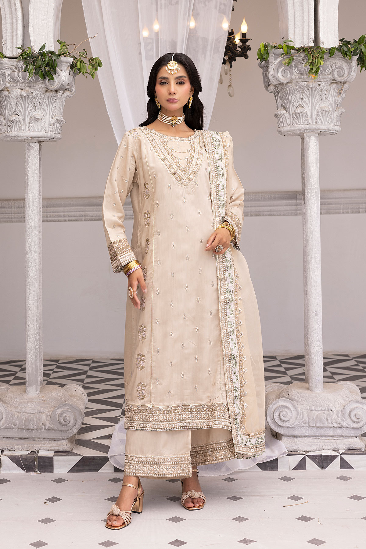 This beautiful 3 piece Ethnic collection features a straight shirt with luxury thread work embroidery throughout the front, finished with full length embroidered sleeves. Paired with plazo trousers with a detailed border. The look is finished with an embroidered organza dupatta. Casual luxury Eid collection to enhance comfort and elegance.