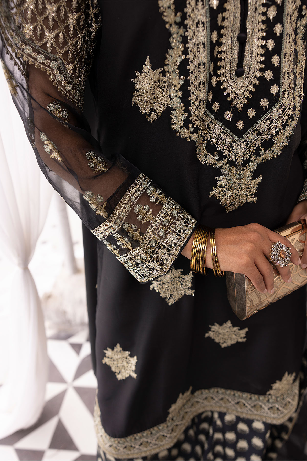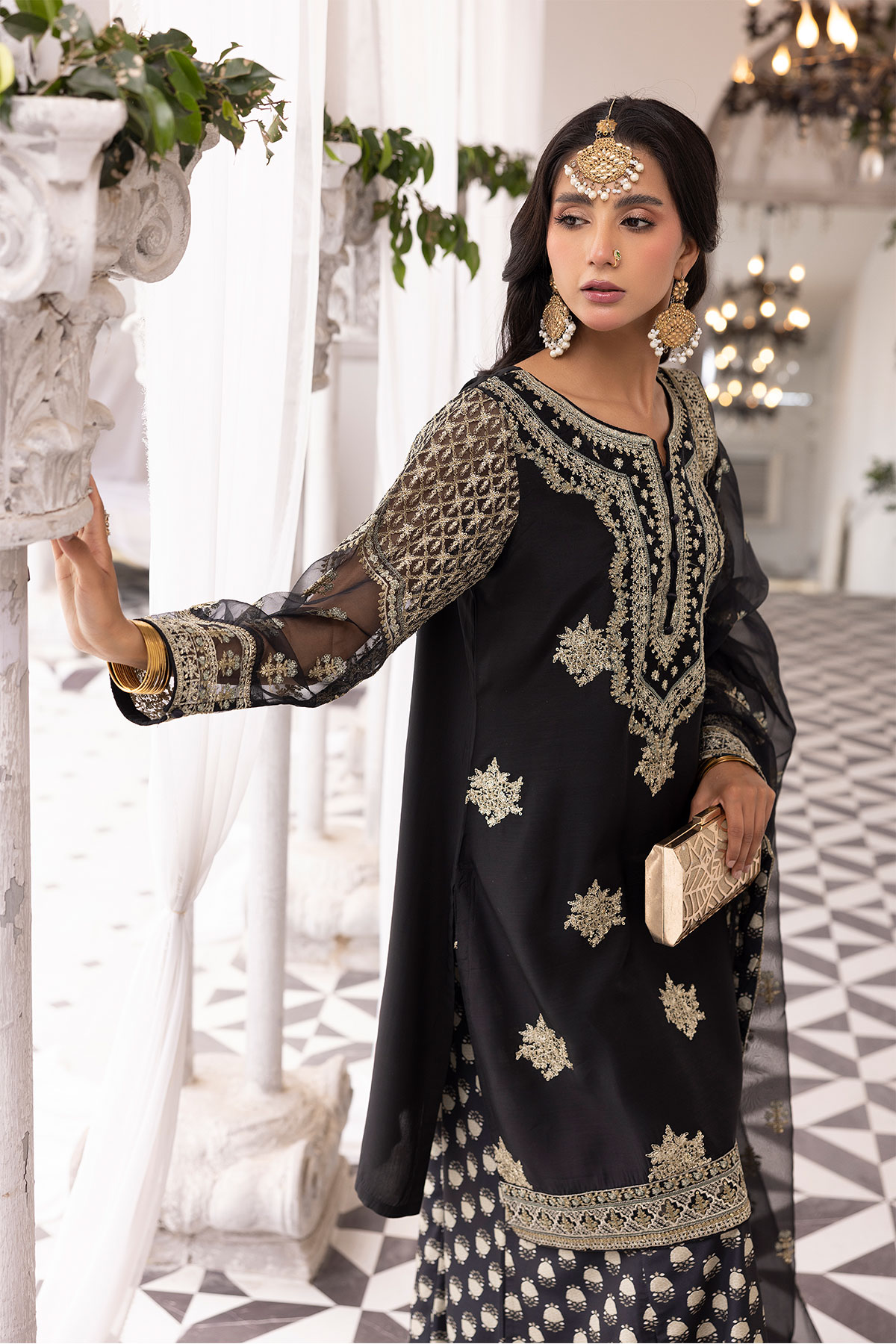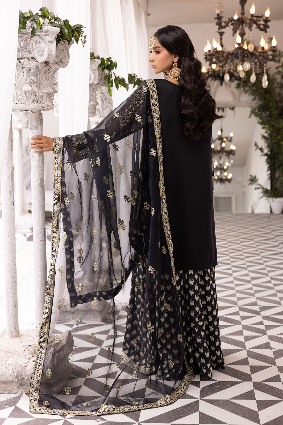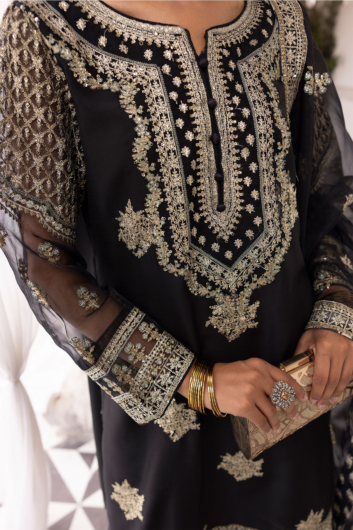 This beautiful 3 piece Ethnic collection features a straight shirt with luxury thread work embroidery throughout the front with full length embroidered sleeves. Paired with a foil printed sharara. The look is finished with an embroidered organza dupatta. Perfect Eid collection for this season.