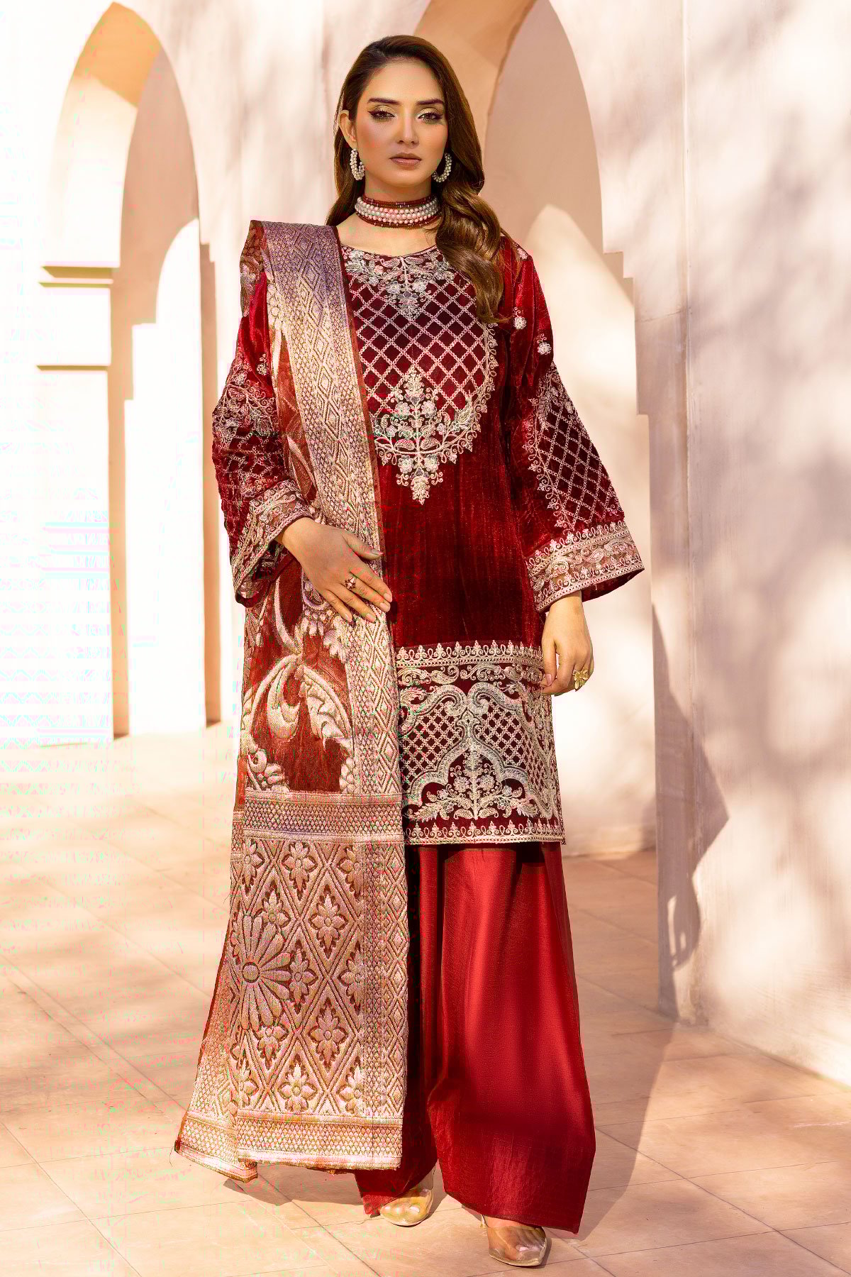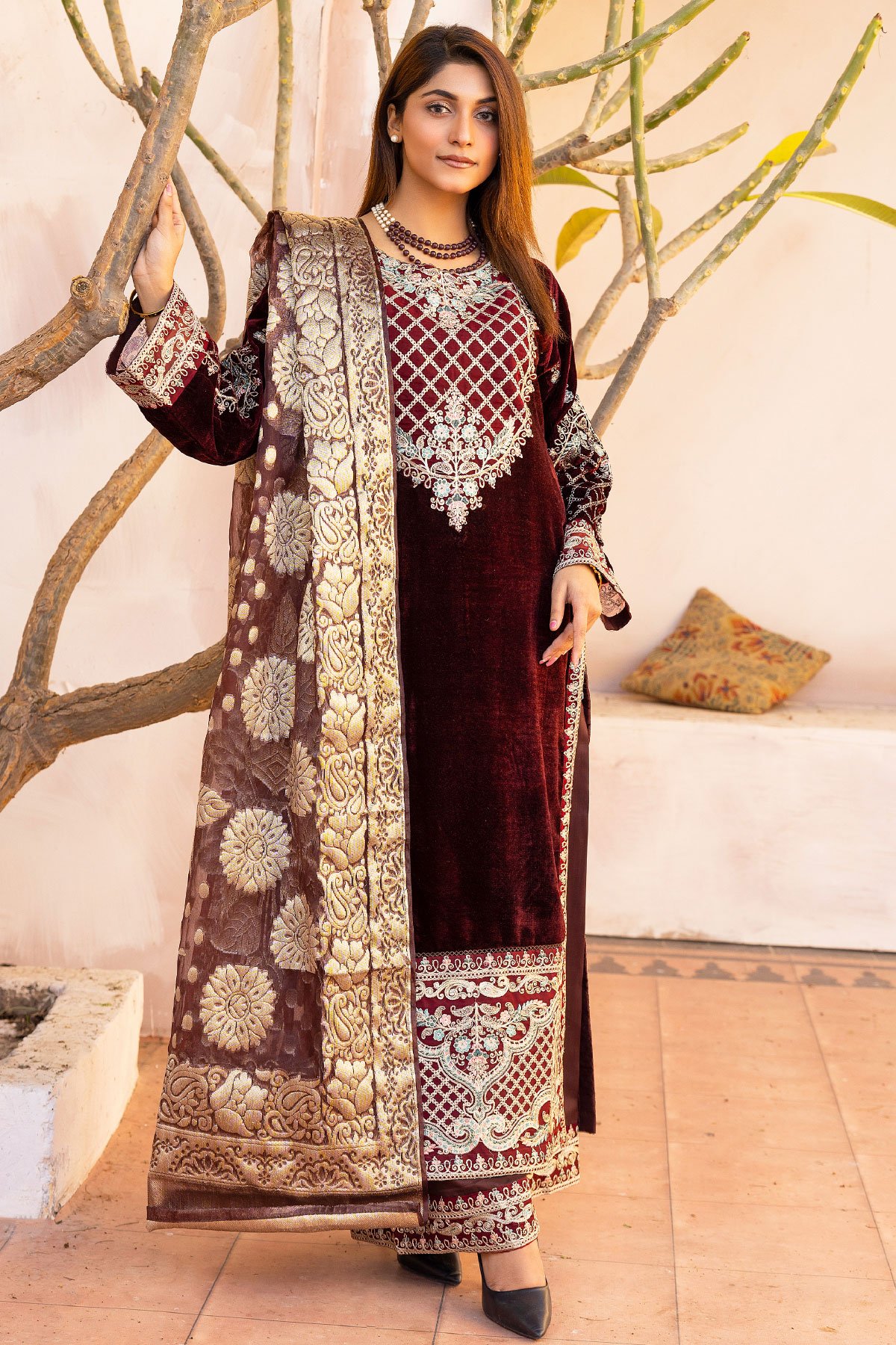 This beautiful 3 piece Fannah velvet collection features a straight embroidered shirt with full length embroidered sleeves. Paired with flared crepe trousers and the look is finished with a jacquard printed organza dupatta. Note: The floral print on the dupatta’s may vary on each dress.