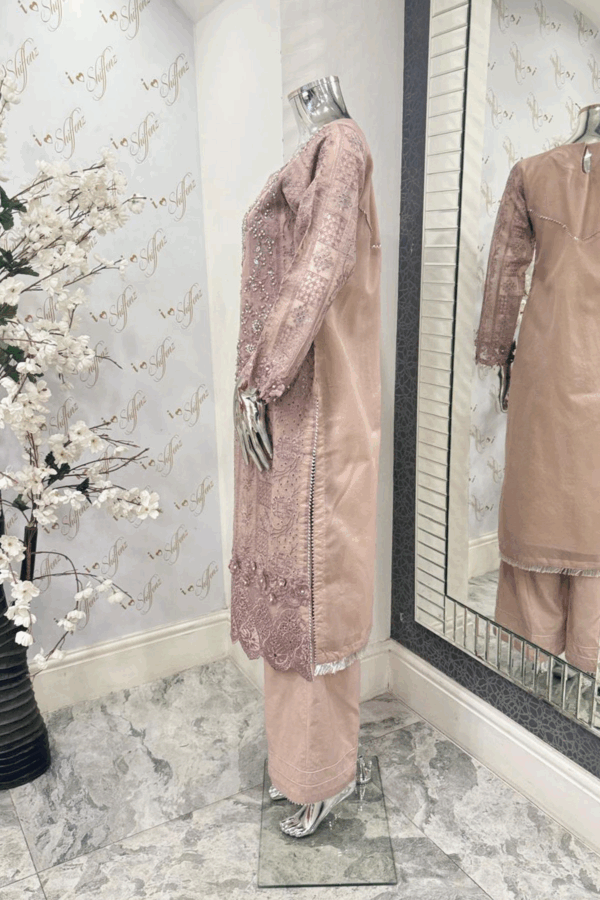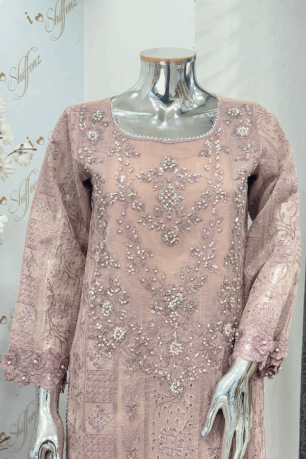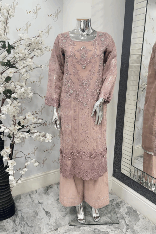 This beautiful 3 piece casual suit features a straight chikan kari shirt with luxury thread work embroidery throughout with bead embellishments, finished with full length embroidered sleeves. It comes with wide leg plazo trousers and the look is finished with Khadi net dupatta. Perfect casual festive attire for this Eid.