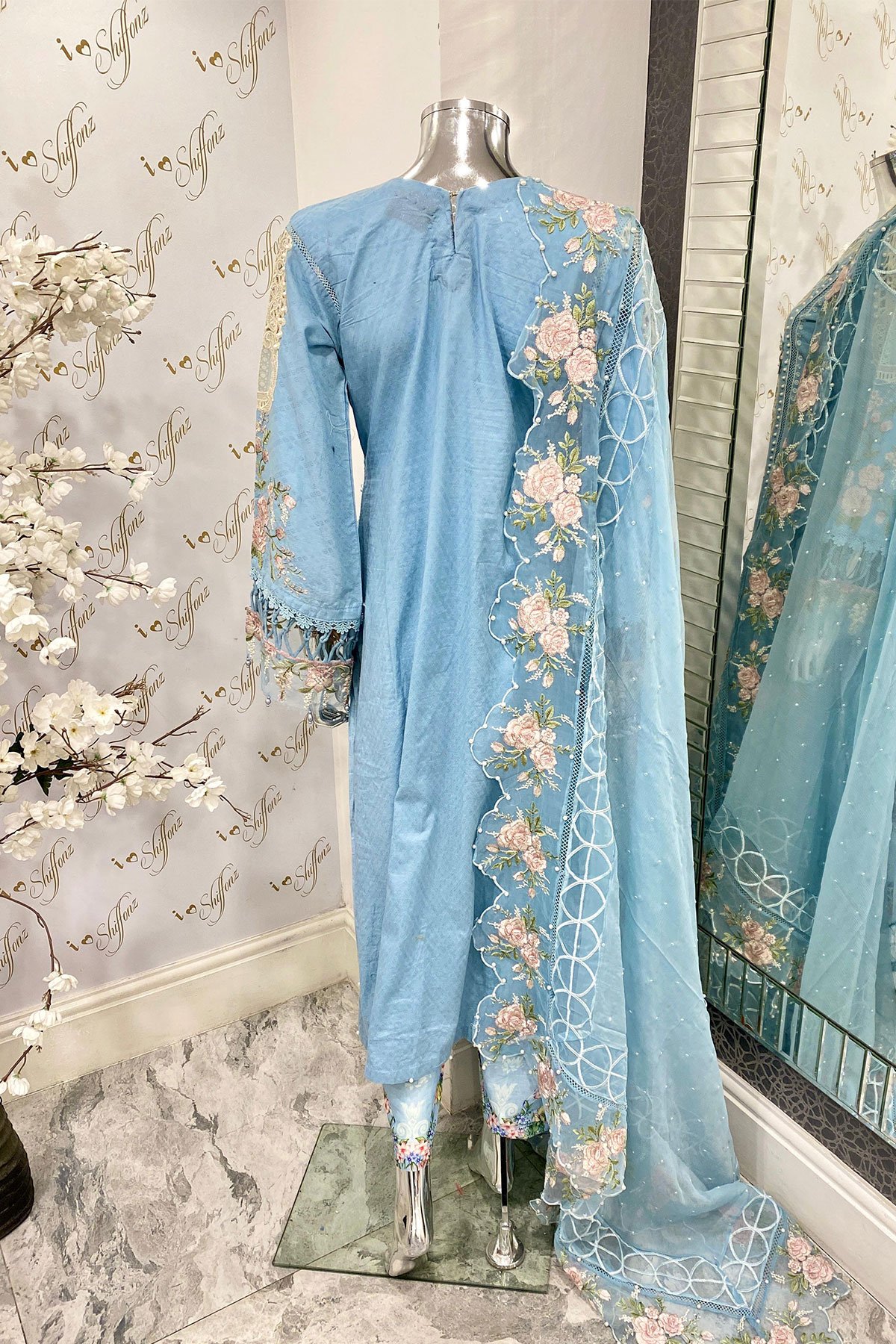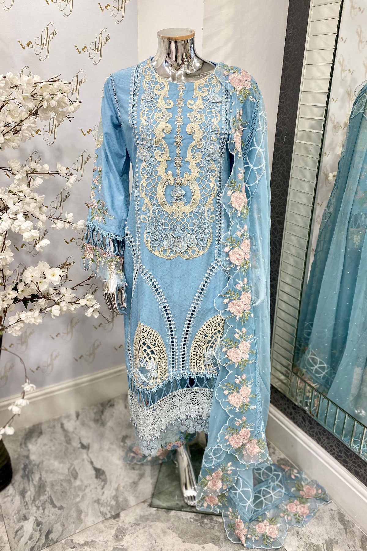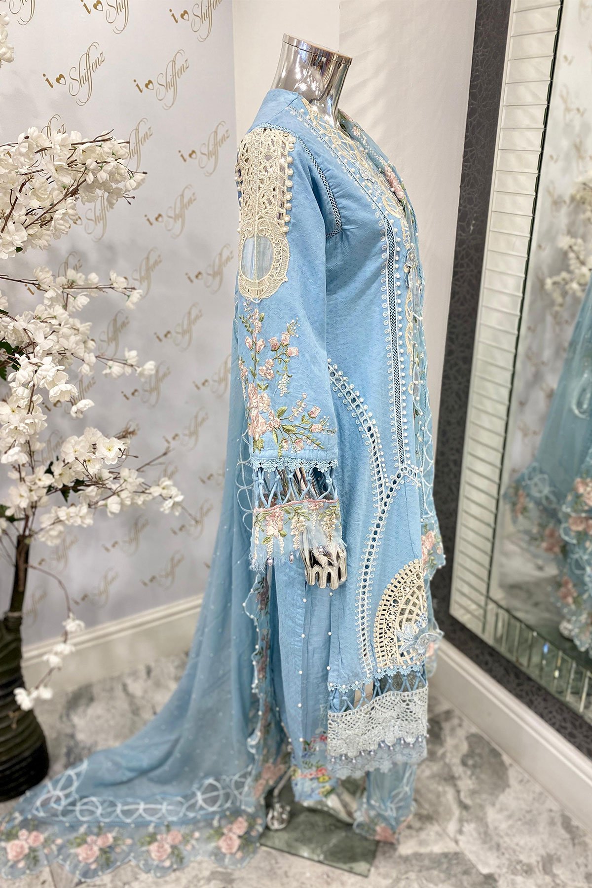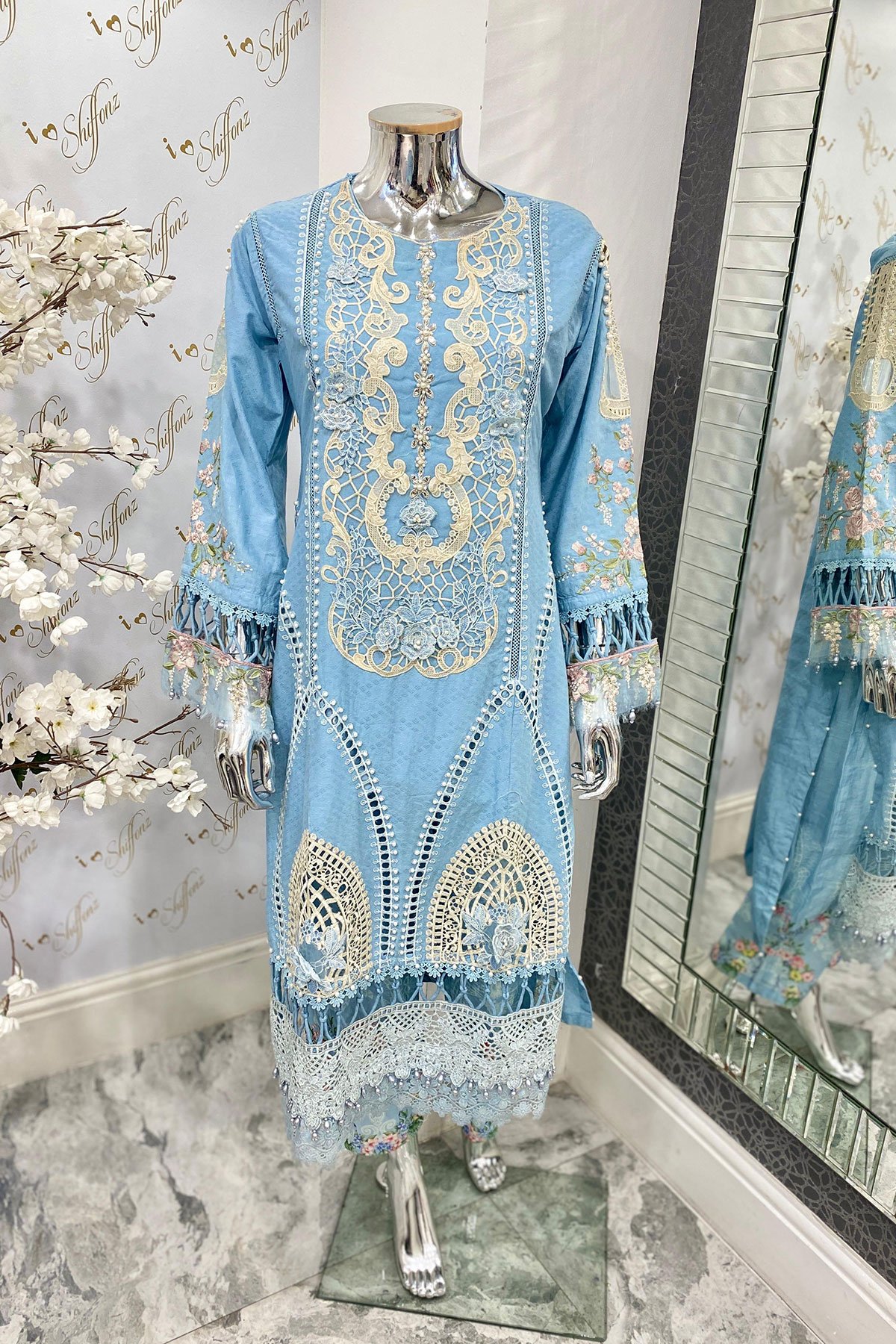 This beautiful 3 piece Maria b inspired casual suit features a straight shirt with luxury cut work embroidery throughout with bead embellishments on the front, finished with lace embellishment on the border with dangling beads. It comes with full length embroidered sleeves and straight leg printed trousers. The look is finished with a chiffon embroidered dupatta.
