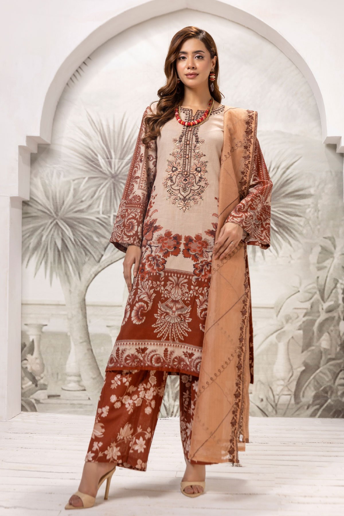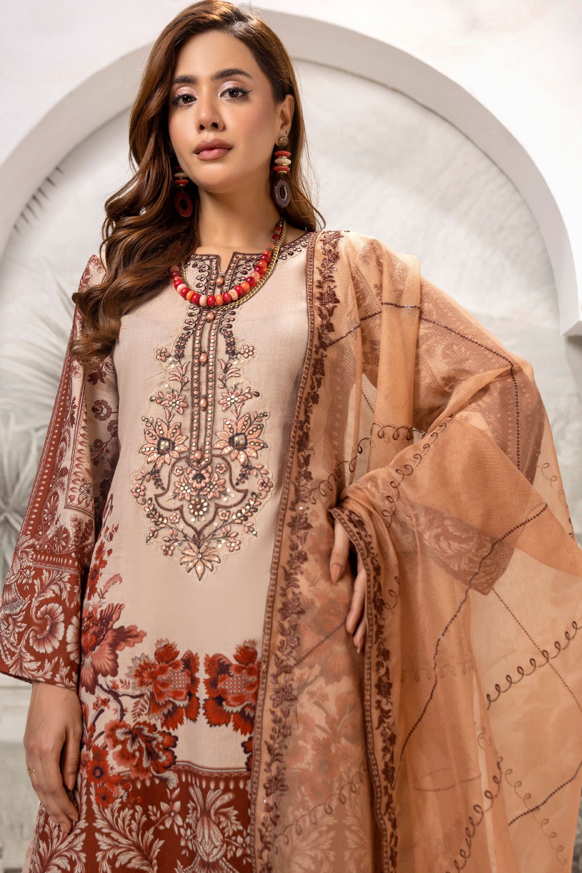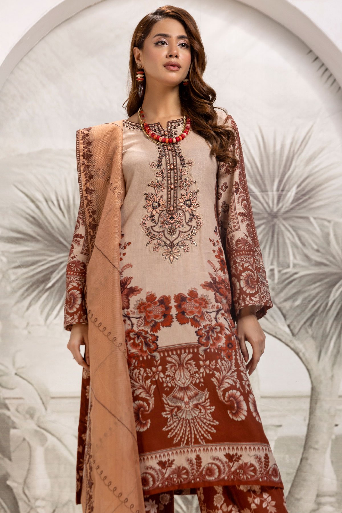 This beautiful Fiesta khaddar collection 3 piece suit features a straight printed shirt with luxury thread work embroidered front finished with bead embellishments along the neckline, finished with full length printed sleeves. It comes with straight leg printed trousers and the look is finished with a cotton net dupatta, Perfect winter collection for this season.