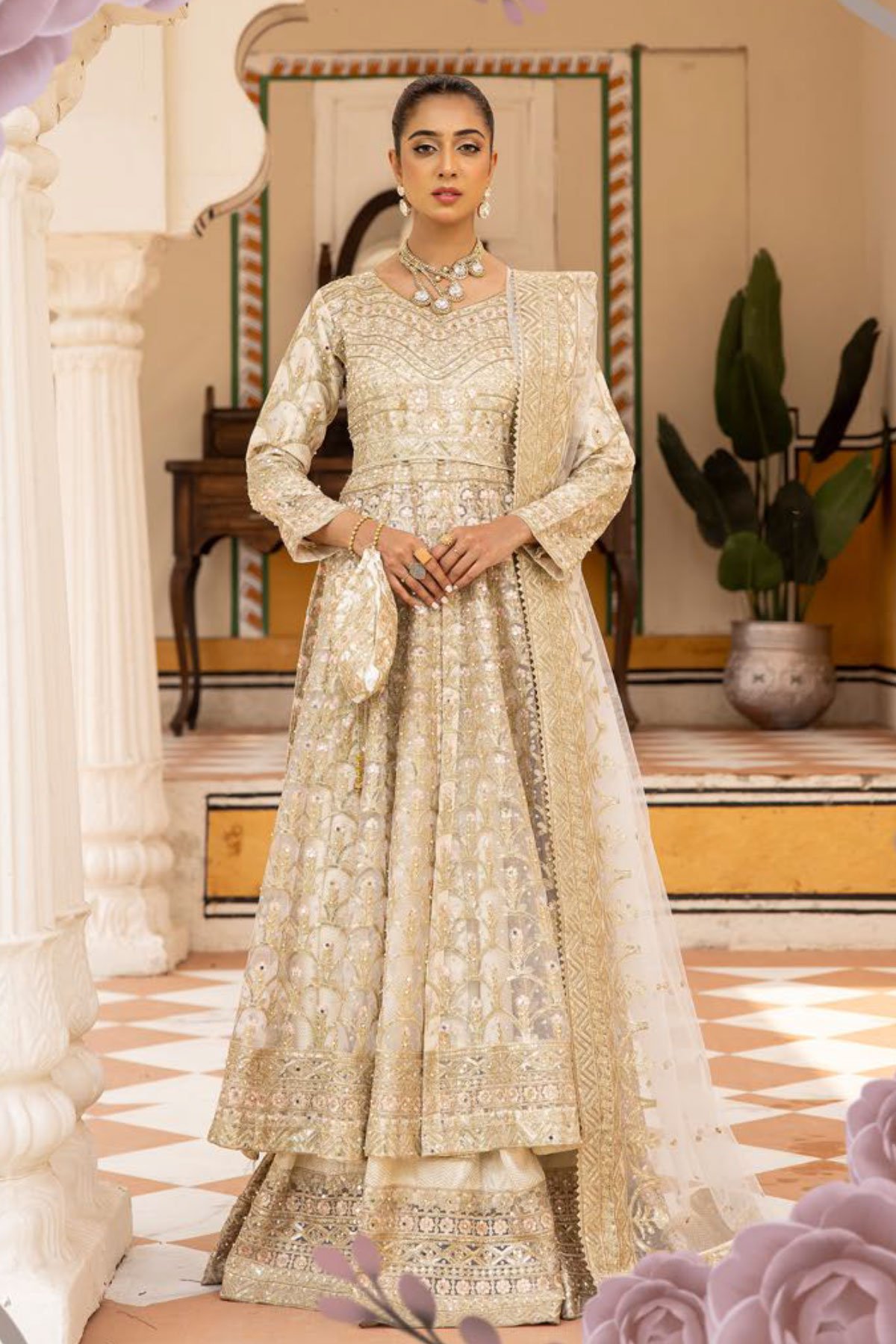 This beautiful 3 piece Firuzeh collection features a long maxi dress with luxury dori and thread work embroidery throughout with mirror diamantes embellishments, finished with full length embroidered sleeves. It comes with a banarsi printed lengha with a net embroidered border and the look is finished with a net embroidered dupatta. Potli embroidered bag is also included.